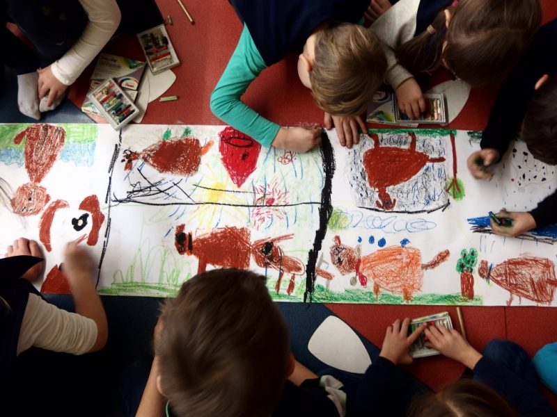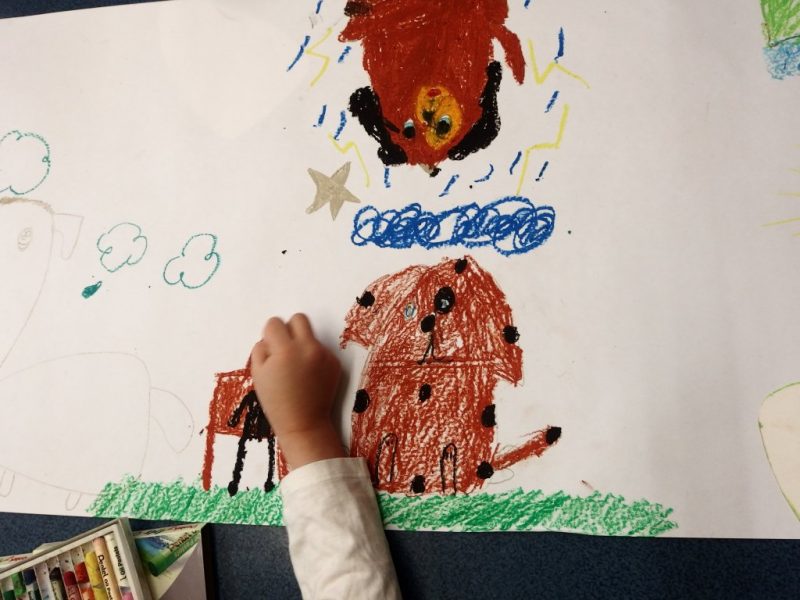 Dzieci z kl. I b ze Szkoły Podstawowej nr 2 w Jeleniej Górze wysłuchały opowieści o psie Marudku, który uciekł z domu, wyczarowaną teatrem Kamishibai. Potem ćwiczyły swoje dłonie wraz z Panami Palcami, a następnie wykonały ilustracje z portretem Marudka.