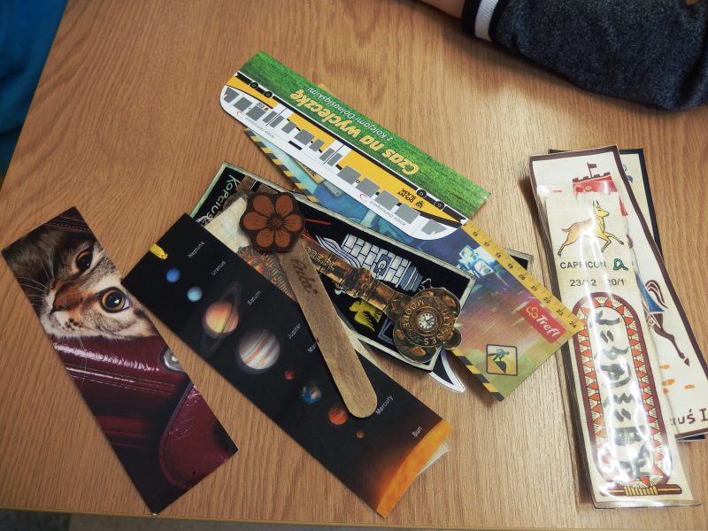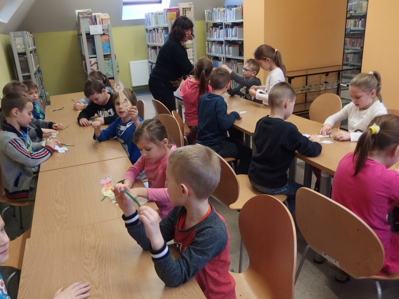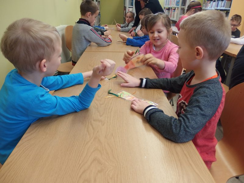 Uczniowie pierwszej klasy ze Szkoły Podstawowej nr 13 wykonują kolorowe zakładki do książek.