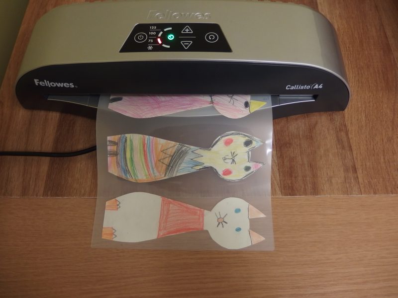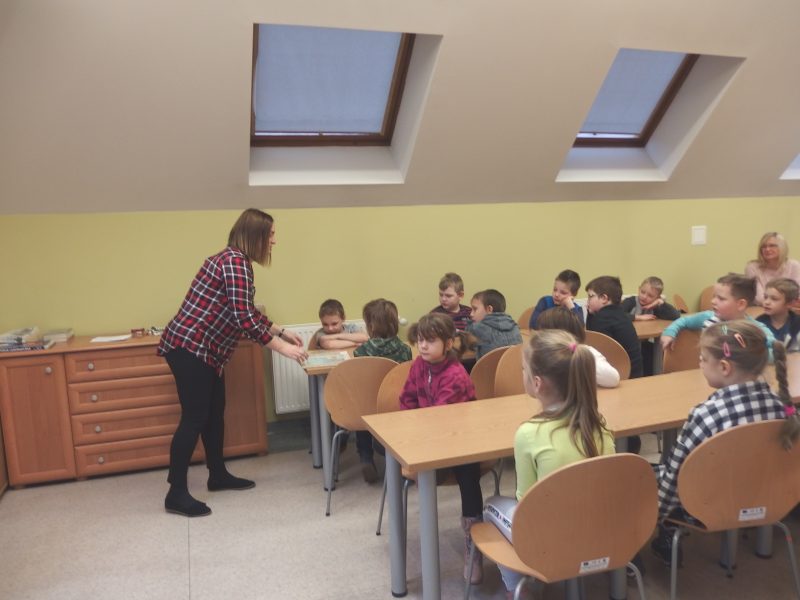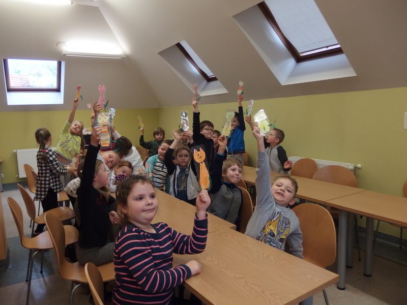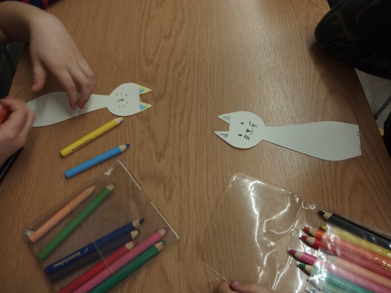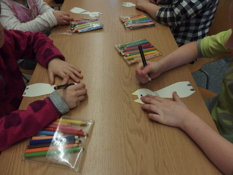 Uczniowie klasy I b ze Szkoły Podstawowej nr 13 wykonują kolorowe zakładki do książek.