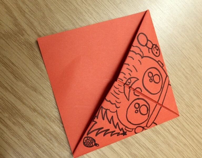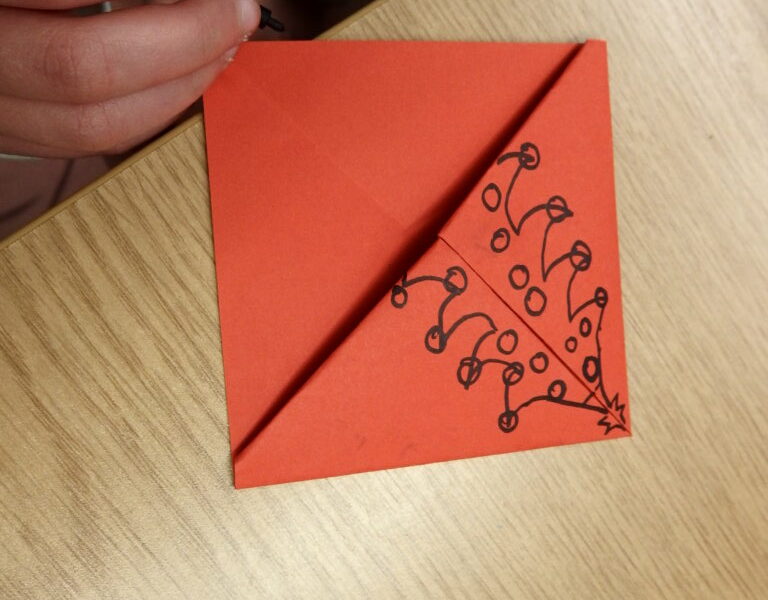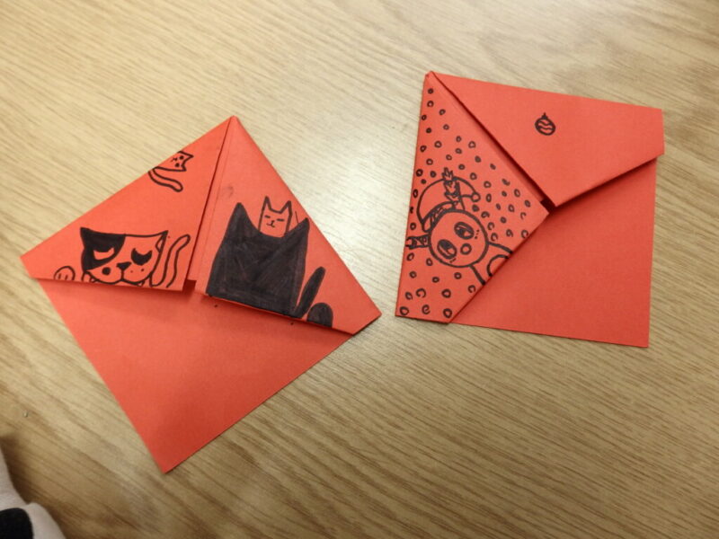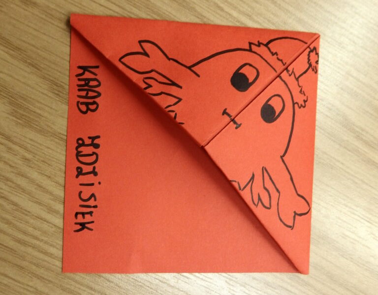 Uczestnicy dzisiejszej lekcji wykonali narożne zakładki do książek. Czerwony i czarny kolor miał być prototypem Mikołajowej czapki, ale wyobraźnia uczniów wyczarowała nie tylko Mikołaje, ale i kraby, biedronki, stwory i potwory.