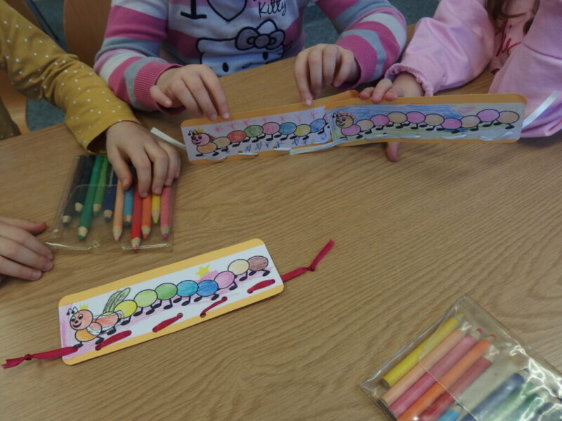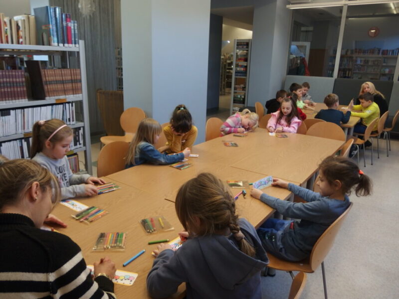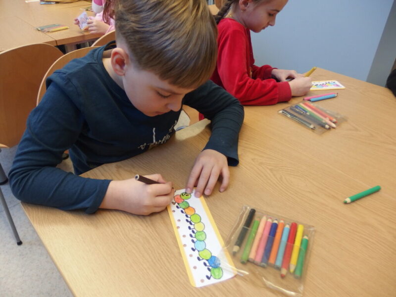 Klasa 1a ze Szkoły Podstawowej w Jeleniej Górze odwiedziła Bibliotekę Dziecięco-Młodzieżową. Głównym tematem spotkania była rozmowa na temat zawodu i pracy bibliotekarza. Przy okazji uczestnicy zapoznali się z zasadami zapisu do biblioteki oraz korzystania ze zbiorów. Aby łatwiej było korzystać z książek uczniowie wykonali kolorowe zakładki.