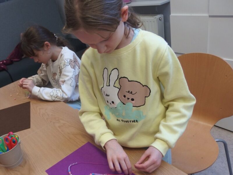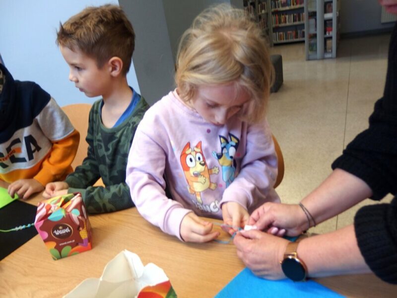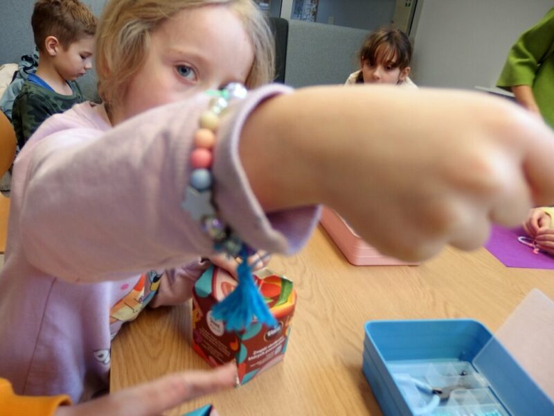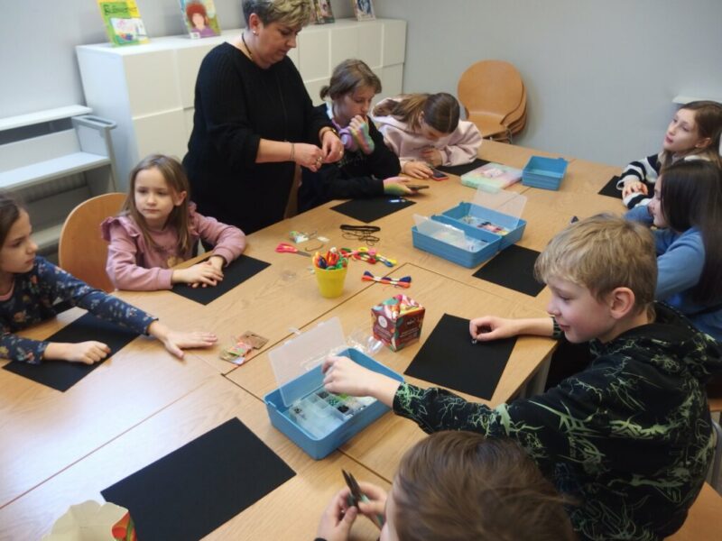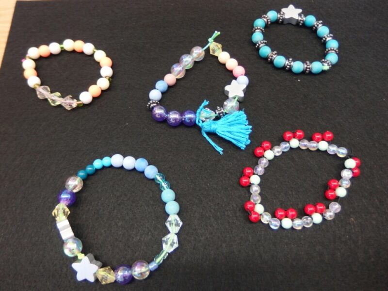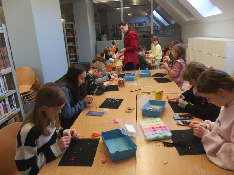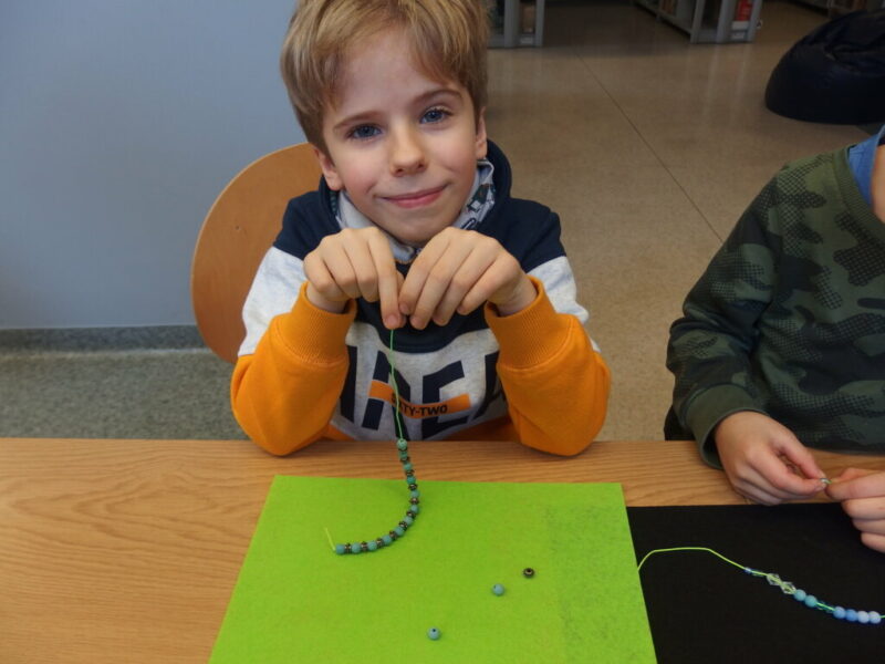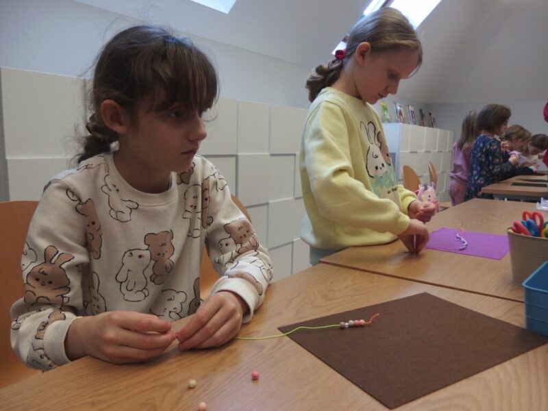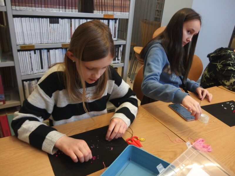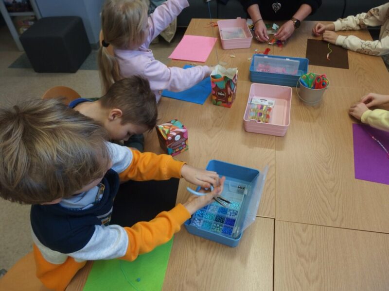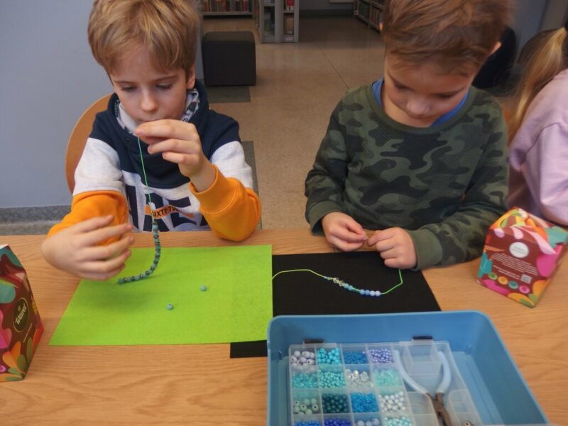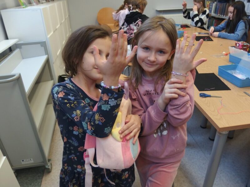 Po powrocie do biblioteki chcieliśmy dodać więcej blasku ostatniemu dniowi naszych ferii, więc w ruch poszły koraliki. Tym razem, słynąca z troski o wygląd, Panna Migotka mogłaby cieszyć oczy naprawdę różnorodną biżuterią w Bibliotece Dziecięco-Młodzieżowej. Każdy projekt był wyjątkowy i może on posłużyć zarówno za prezent, jak i stylowa ozdoba.