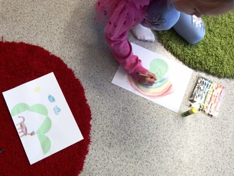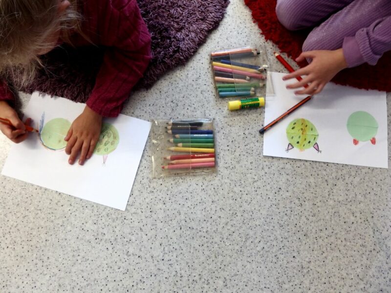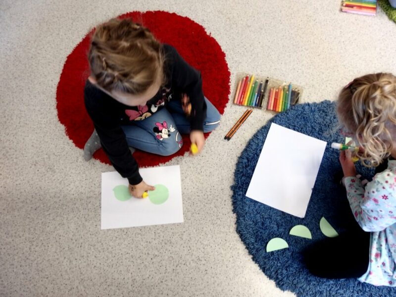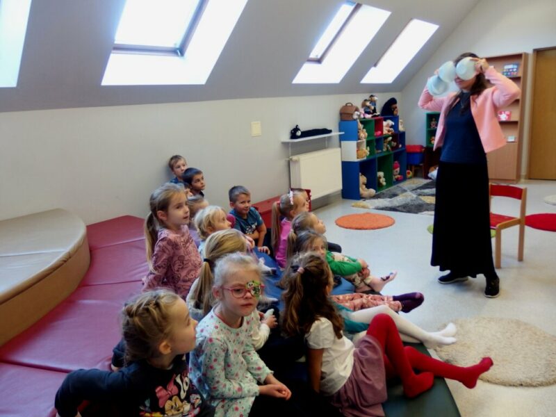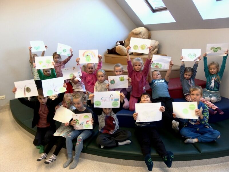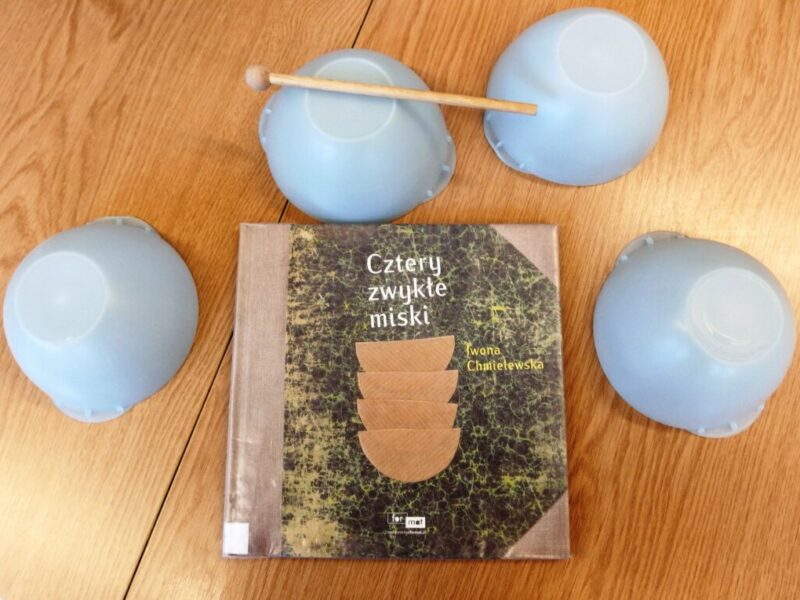 Po raz kolejny odwiedziły nas dzieci z Niepublicznego Przedszkola „Król Maciuś”, we wtorkowe przedpołudnie gościliśmy dawną grupę „Kotków” (obecnie już zerówkowicze). Dzisiejsze zajęcia plastyczno-literackie zbudowane zostały na podstawie zwykłej-niezwykłej książki Iwony Chmielewskiej pt. „Cztery zwykłe miski”. Okazało się, że cztery wycięte z papieru półkola mogą być podstawą do licznych prac plastycznych, raz będąc słońcem lub księżycem, innym razem twarzą, uśmiechem albo parasolem. Cztery wzięte z kuchni miski również mogą udawać wiele przedmiotów, np. okulary, słuchawki, perkusję czy śniegowego bałwana, mogą być także wyobrażeniem góry, statku kosmicznego lub tropikalnych wysp.