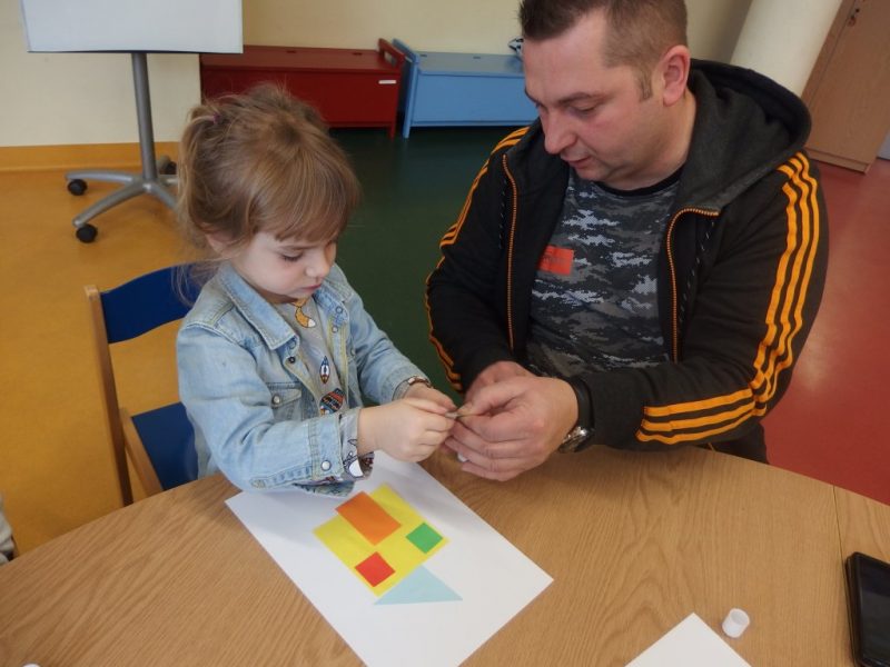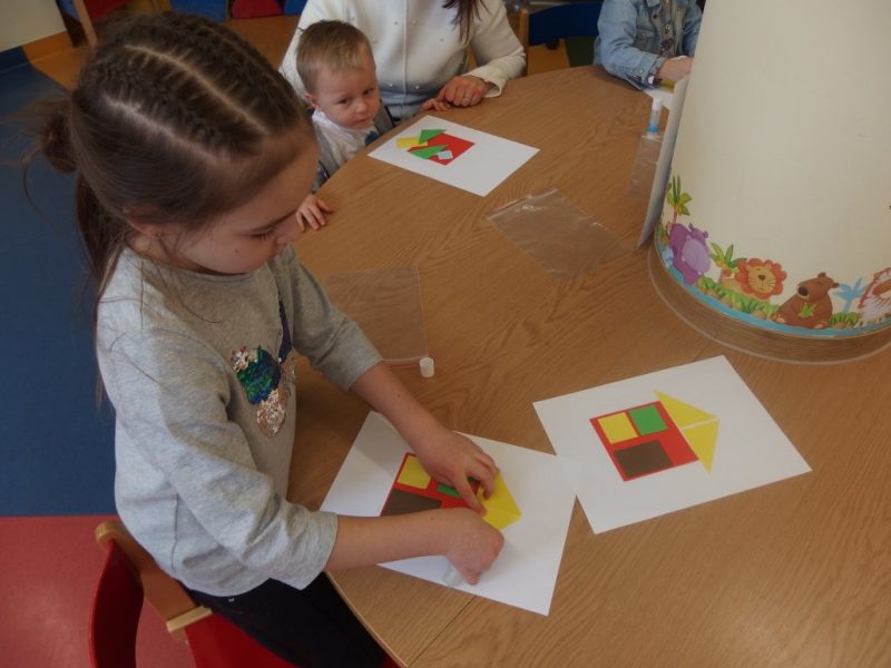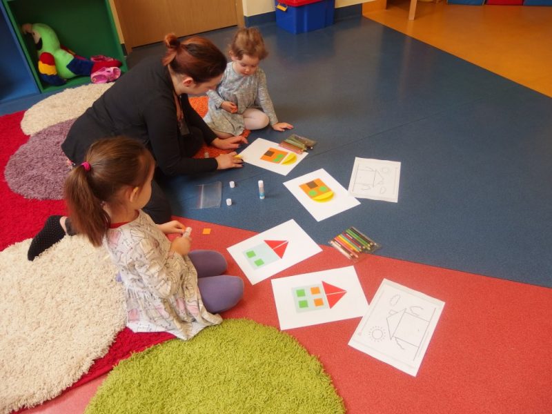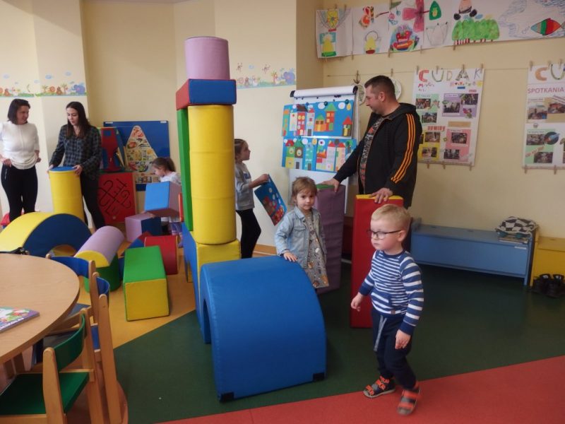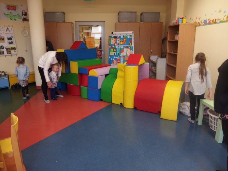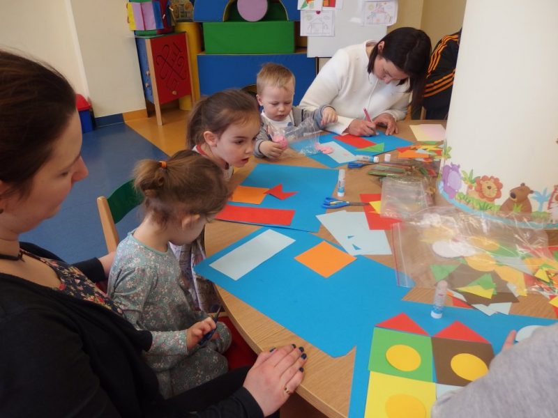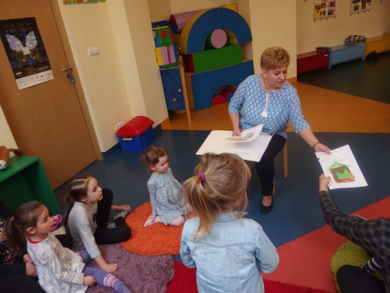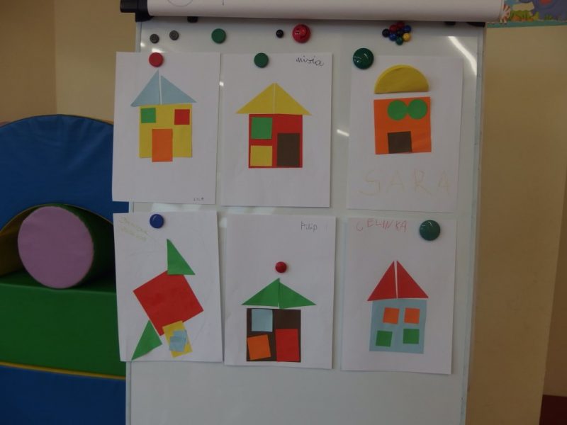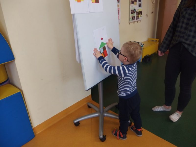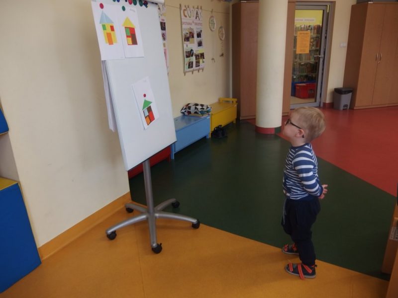 Na dzisiejszych zajęciach dzieci poznały historię trzech świnek i ich architektoniczne osiągnięcia, czyli domki z różnych materiałów budowlanych. Pierwsze zadanie zajęć plastycznych polegało na dokładnym odwzorowaniu murowanego domku dla trzech świnek. Następnie dzieci wcieliły się w małych architektów i zaprojektowały domy z kolorowych figur geometrycznych. Na koniec maluchy sprawdziły się w budowaniu zamków i tuneli z klocków piankowych.