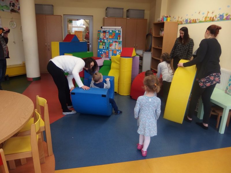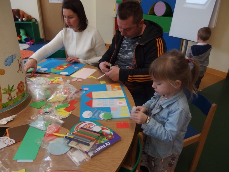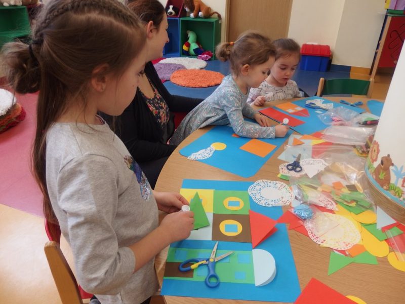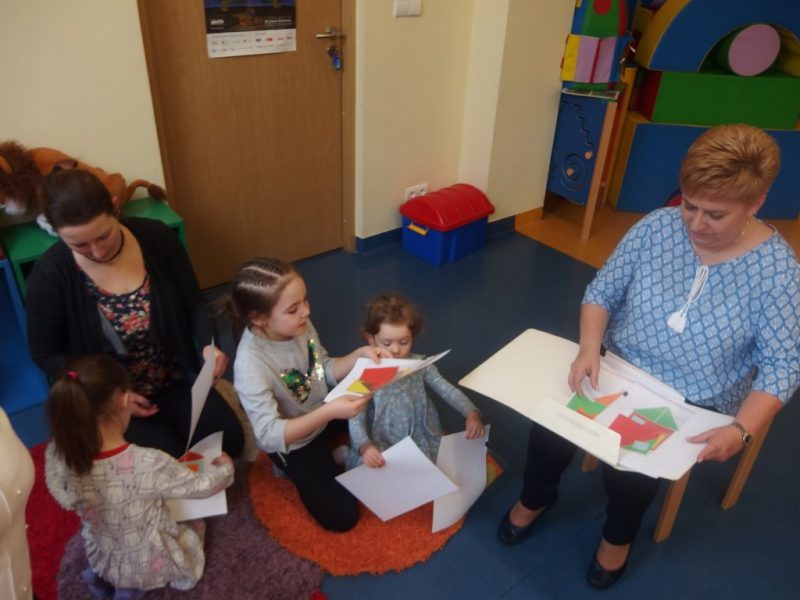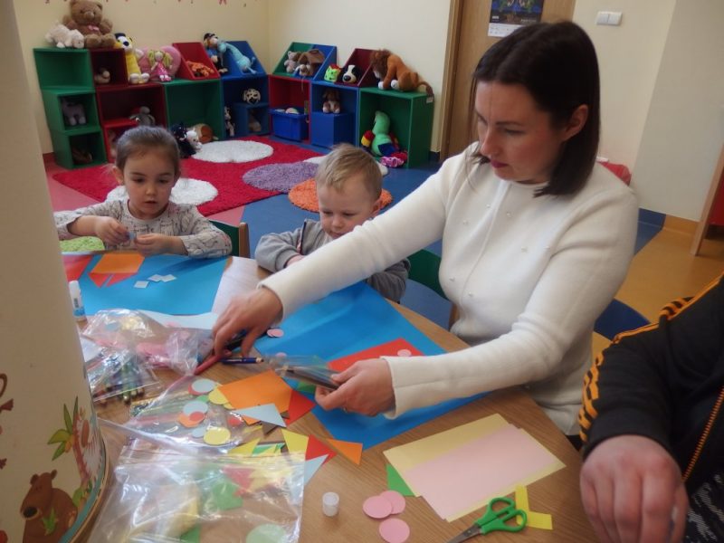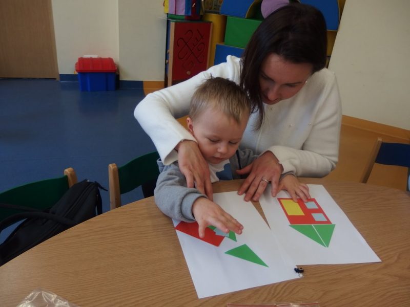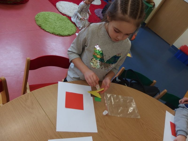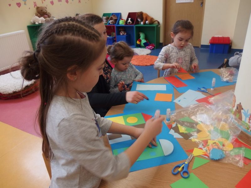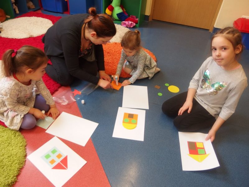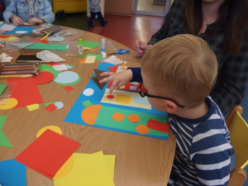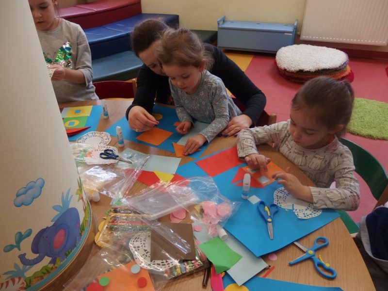 Na dzisiejszych zajęciach dzieci poznały historię trzech świnek i ich architektoniczne osiągnięcia, czyli domki z różnych materiałów budowlanych. Pierwsze zadanie zajęć plastycznych polegało na dokładnym odwzorowaniu murowanego domku dla trzech świnek. Następnie dzieci wcieliły się w małych architektów i zaprojektowały domy z kolorowych figur geometrycznych. Na koniec maluchy sprawdziły się w budowaniu zamków i tuneli z klocków piankowych.