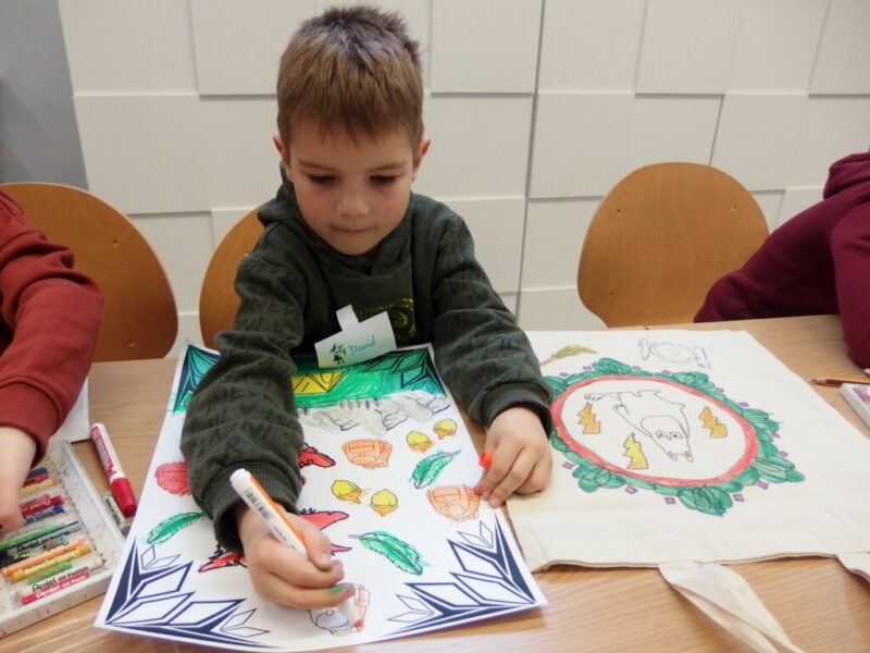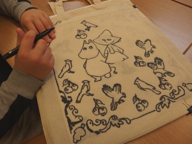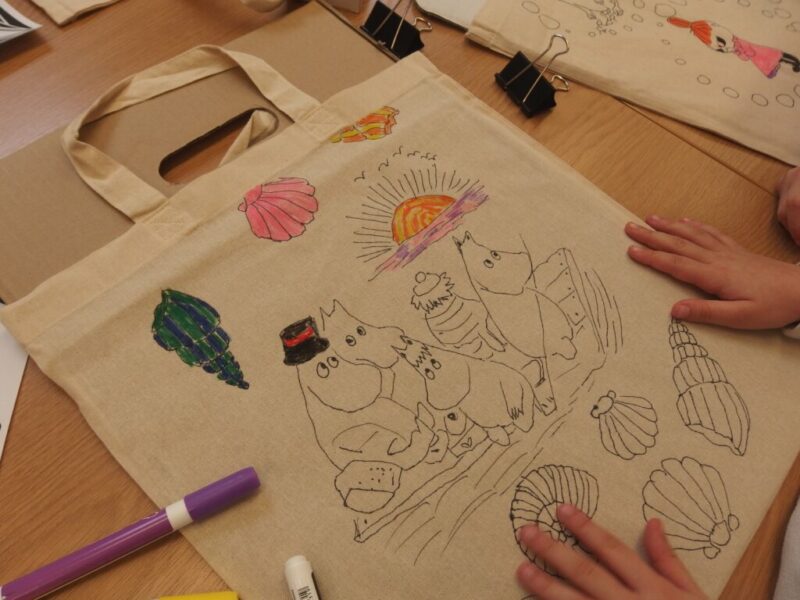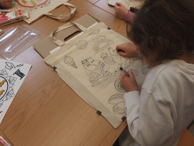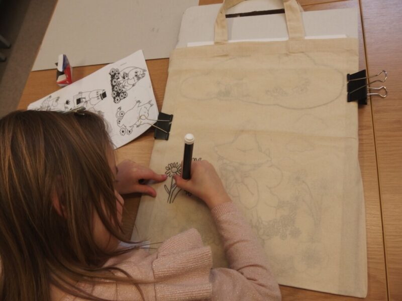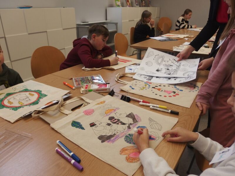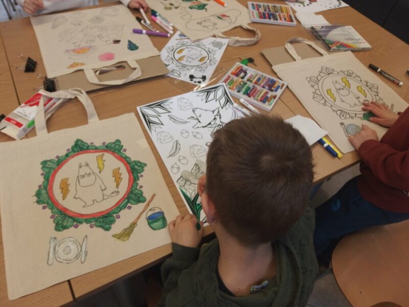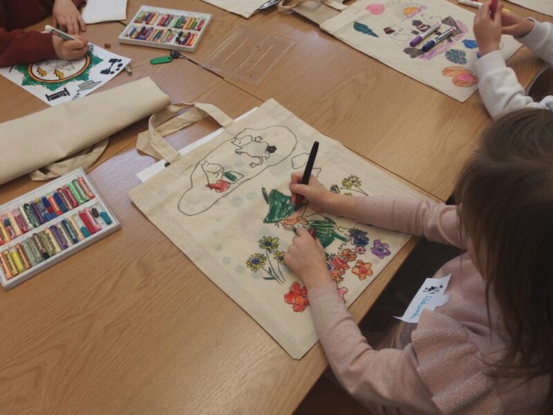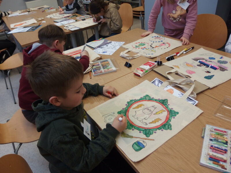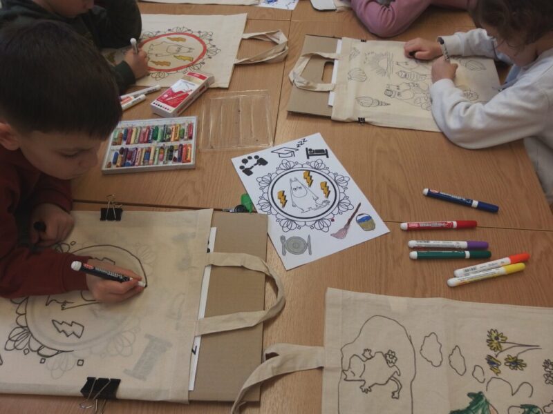 Każdy obieżyświat potrzebuję solidnej torby, nim wyprawi się w świat. A czy ferie nie są wspaniałą okazją do podróży (nawet takich krótkich, obejmujących teren własnego podwórka lub tych w pełni wyobrażonych)? Zainspirowani fragmentem opowiadania o przygodzie Muminka, Włóczykija, Panny Migotki i Ryjka, czwartego dnia ferii postanowiliśmy niezwłocznie wykonać solidne „schowki” na wszelkie skarby, jakie przypadkiem mogą się natrafić na naszej drodze. Wykorzystując przygotowane projekty, uczestnicy warsztatów przerysowali wybrane postaci i elementy, a później pokolorowali je specjalnymi pisakami do materiału. Taki eko-gadżet służyć będzie na długo.