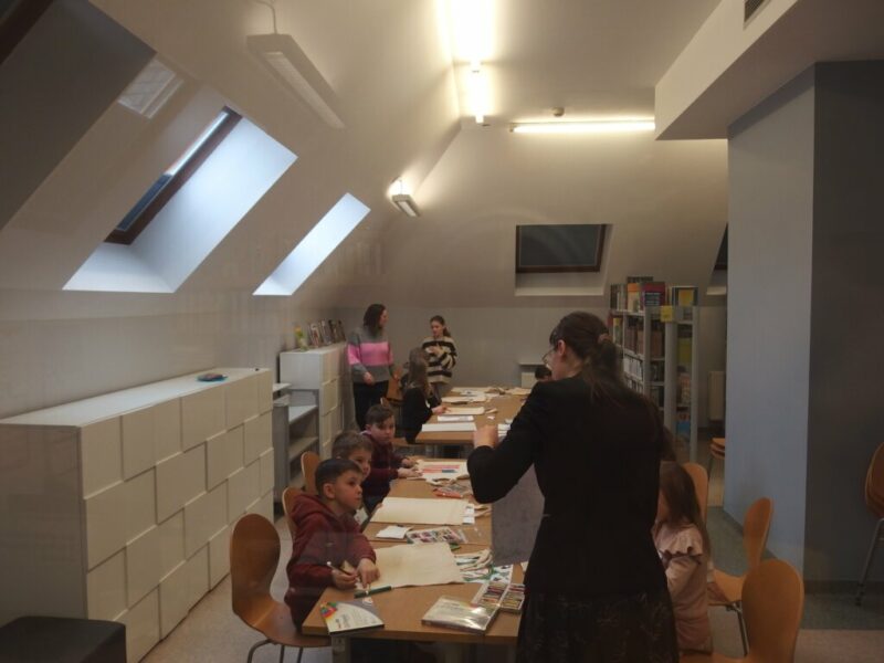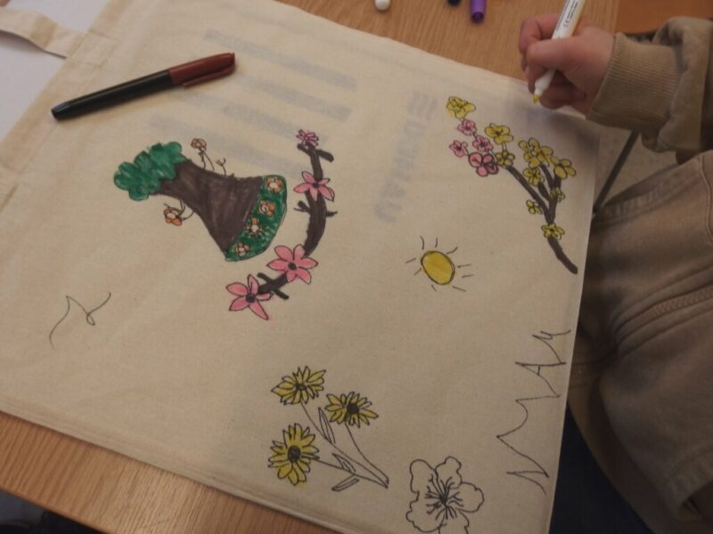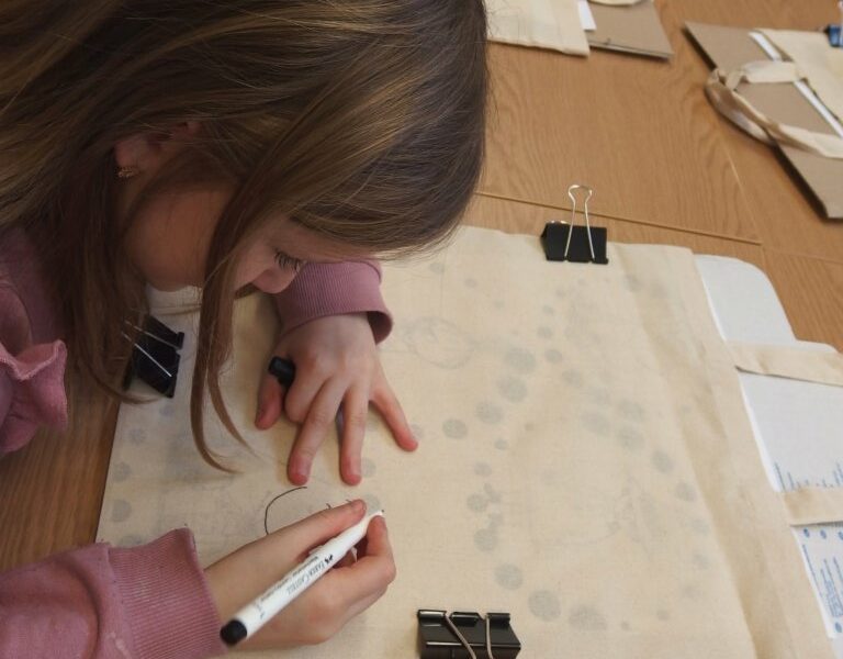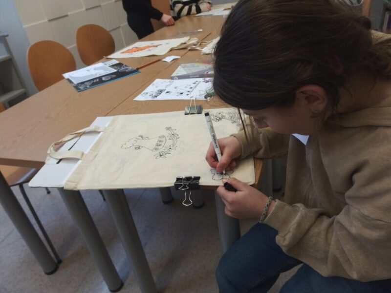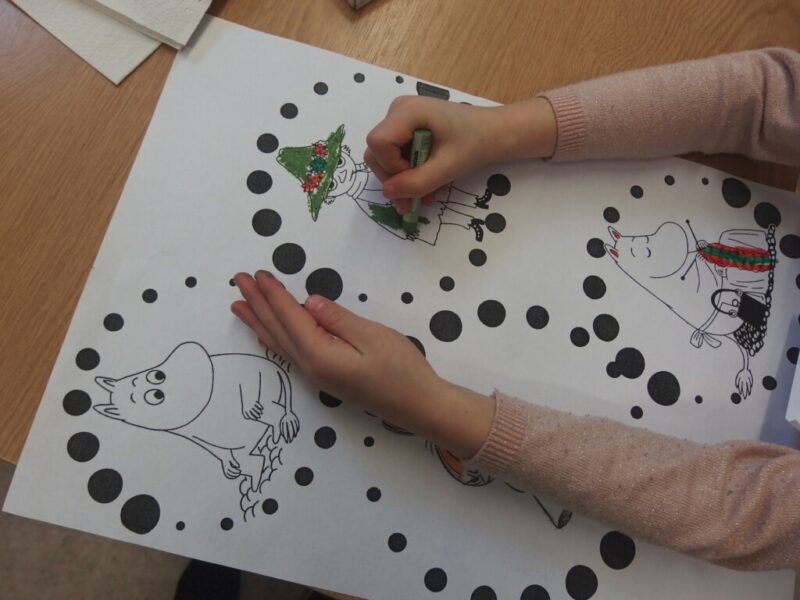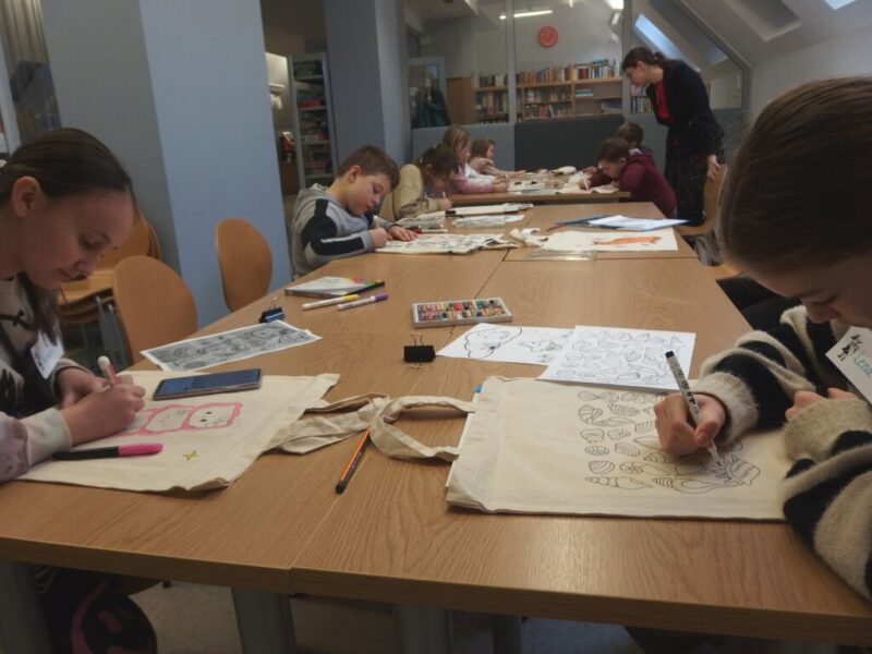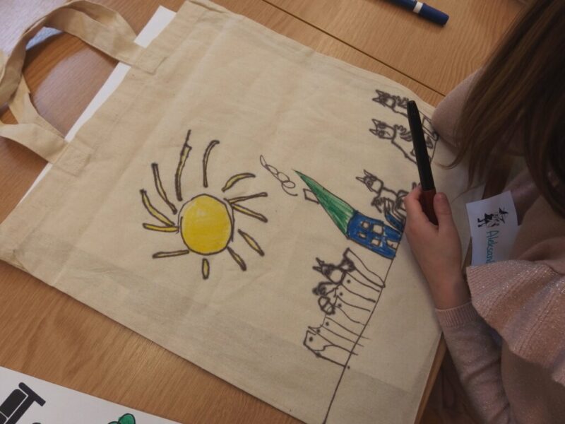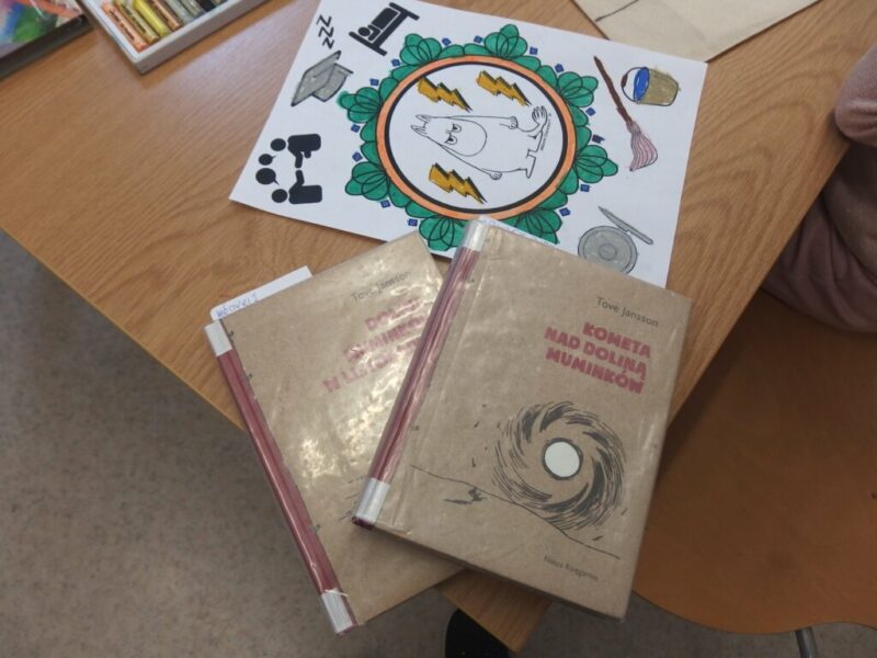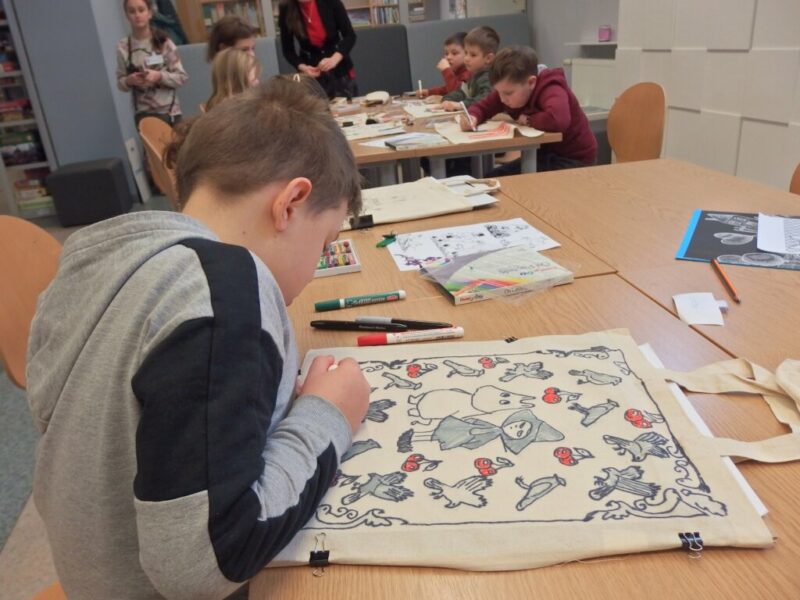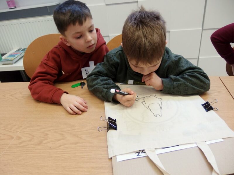 Każdy obieżyświat potrzebuję solidnej torby, nim wyprawi się w świat. A czy ferie nie są wspaniałą okazją do podróży (nawet takich krótkich, obejmujących teren własnego podwórka lub tych w pełni wyobrażonych)? Zainspirowani fragmentem opowiadania o przygodzie Muminka, Włóczykija, Panny Migotki i Ryjka, czwartego dnia ferii postanowiliśmy niezwłocznie wykonać solidne „schowki” na wszelkie skarby, jakie przypadkiem mogą się natrafić na naszej drodze. Wykorzystując przygotowane projekty, uczestnicy warsztatów przerysowali wybrane postaci i elementy, a później pokolorowali je specjalnymi pisakami do materiału. Taki eko-gadżet służyć będzie na długo.