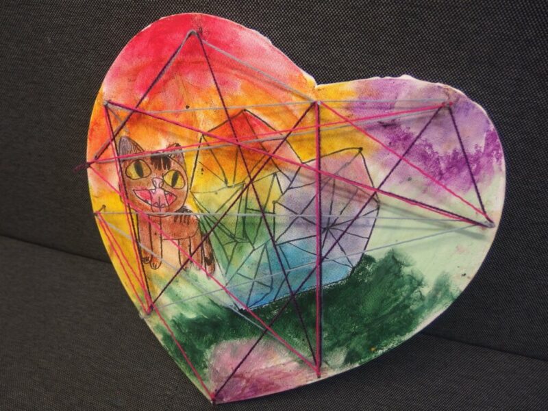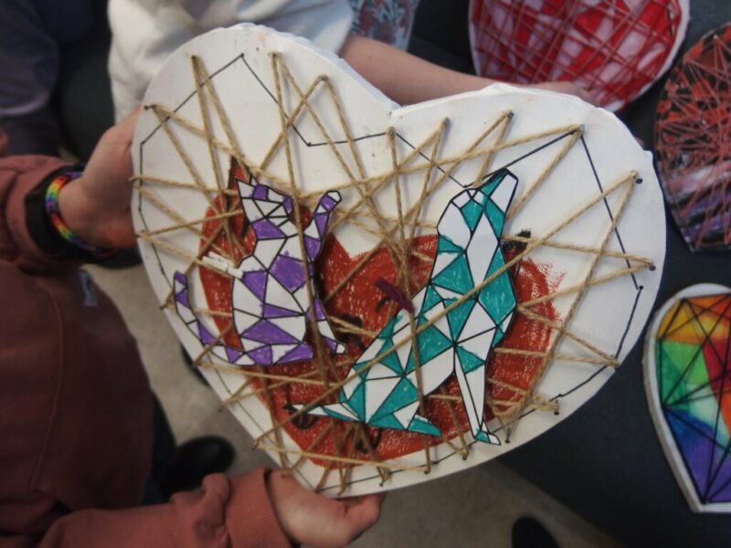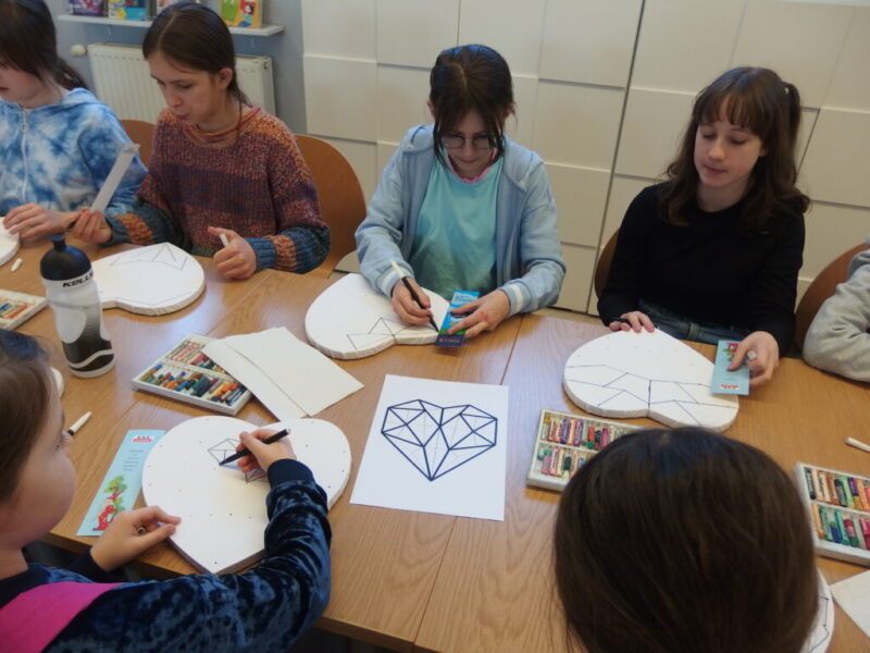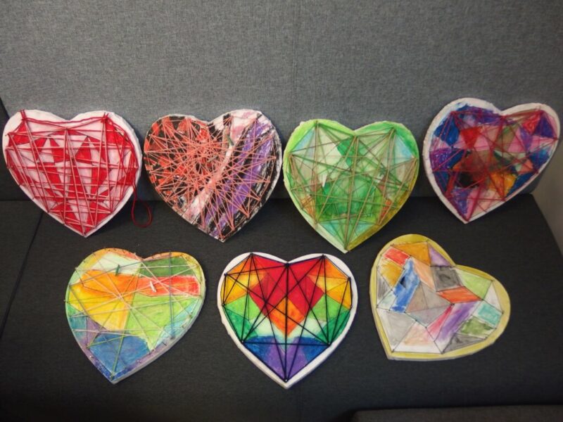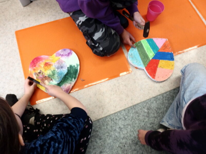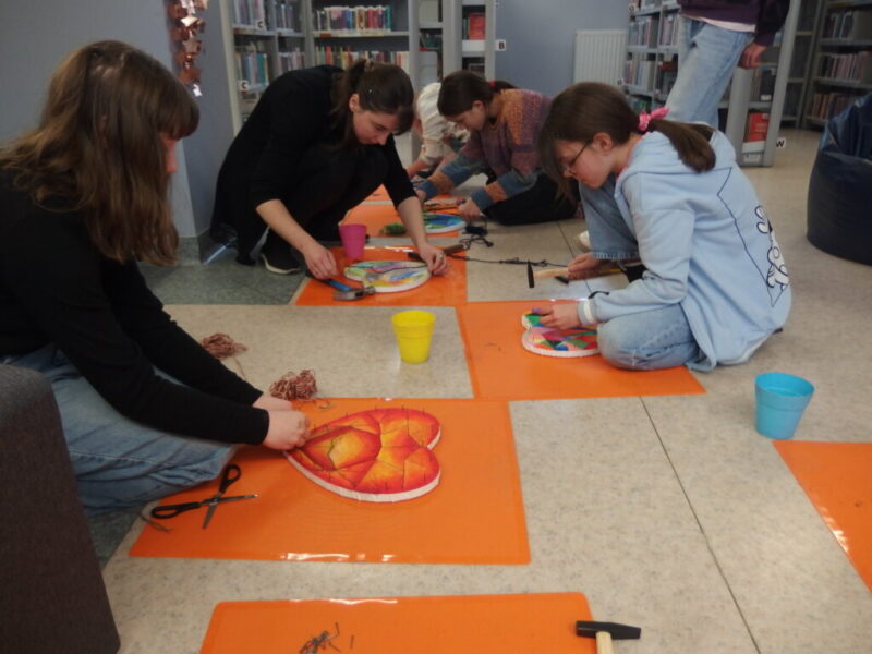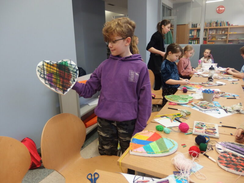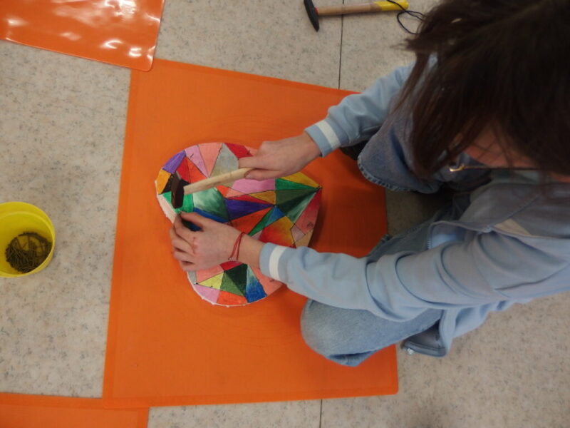 Przyszedł czas na wykonanie podzielonych wieloma uczuciami i rozterkami serc, gdzie pasma włóczki imitować miały mocno wplatające się w serce korzenie złotego kwiatu paproci. Pomysły na wypełnienie płócien i dobór kolorów były najróżniejsze. Mieliśmy przy tym sporo zabawy, a stukot młotków rozlegał się na całym piętrze, czasami nieco się splątaliśmy i trochę pobrudziliśmy, ale efekty wytrwałej pracy są godne podziwu.