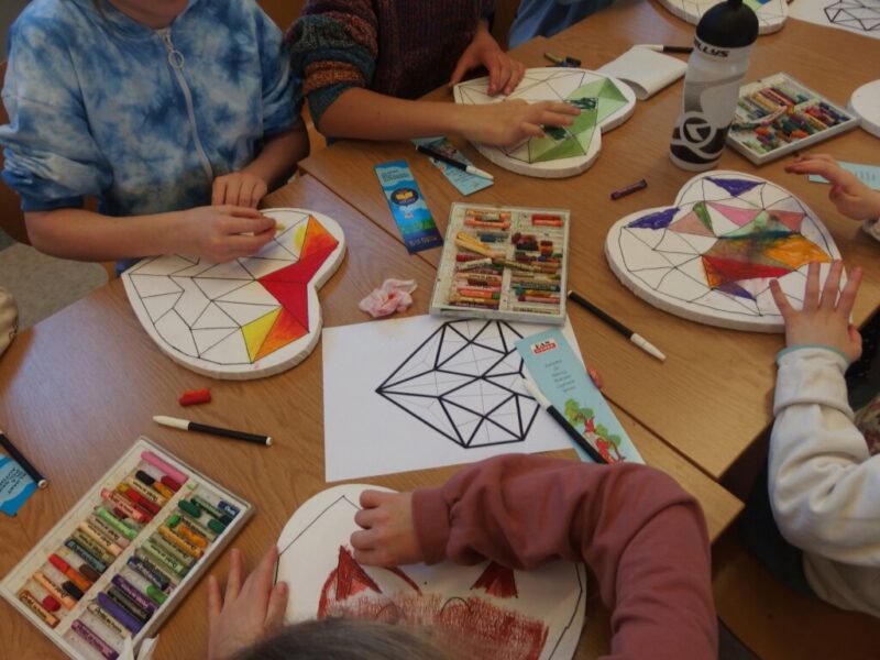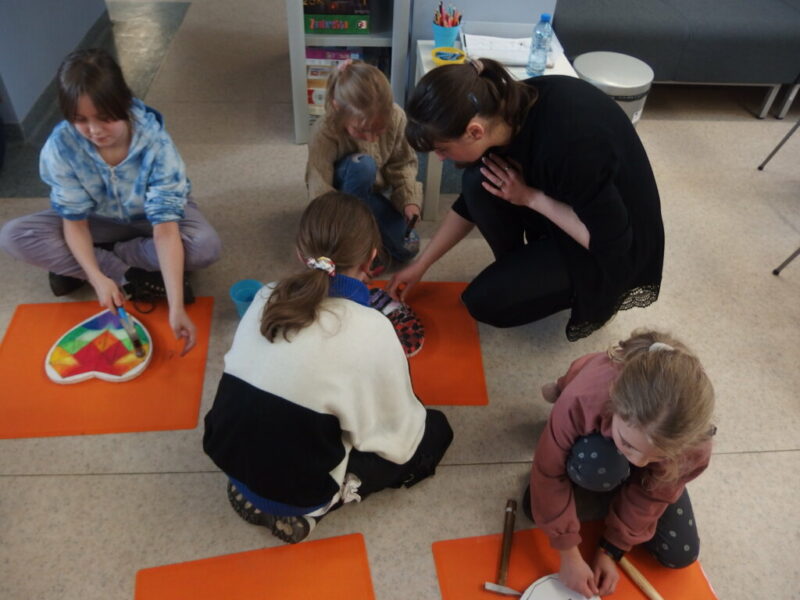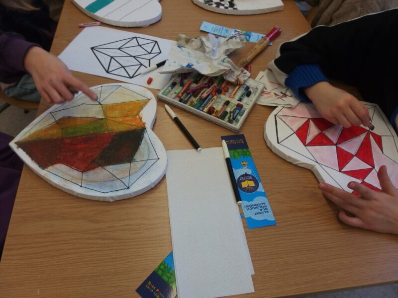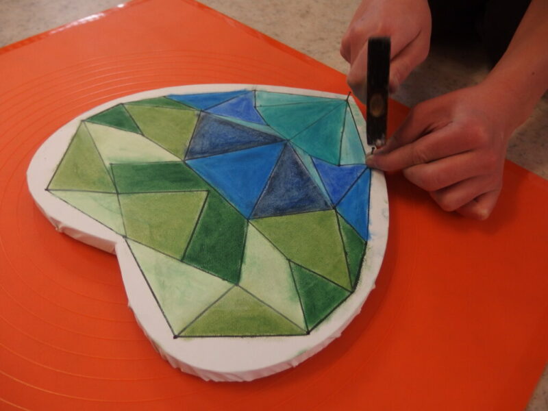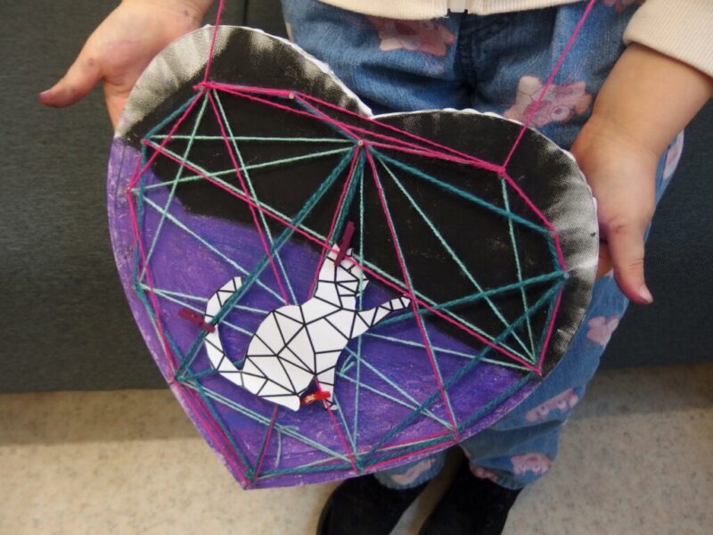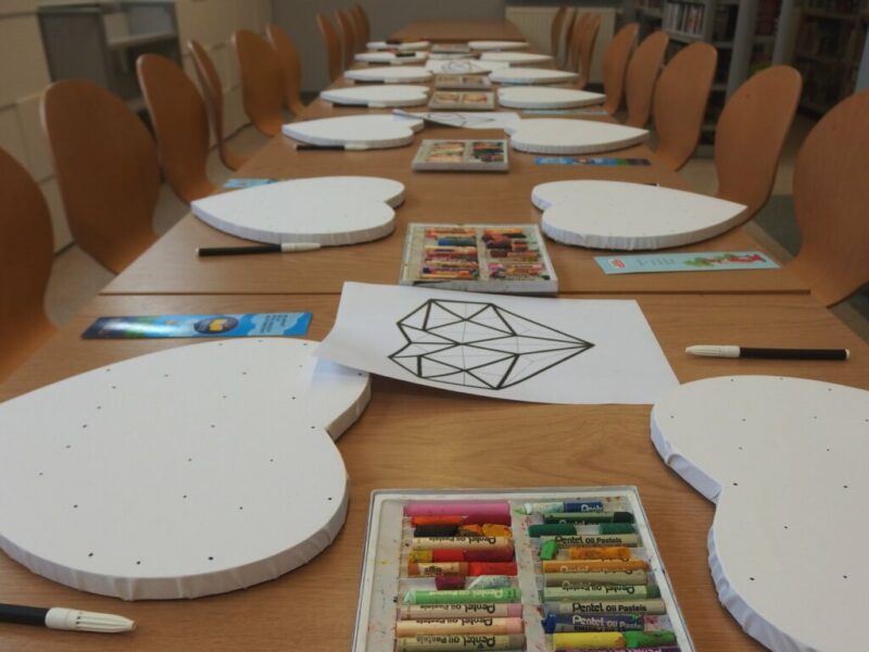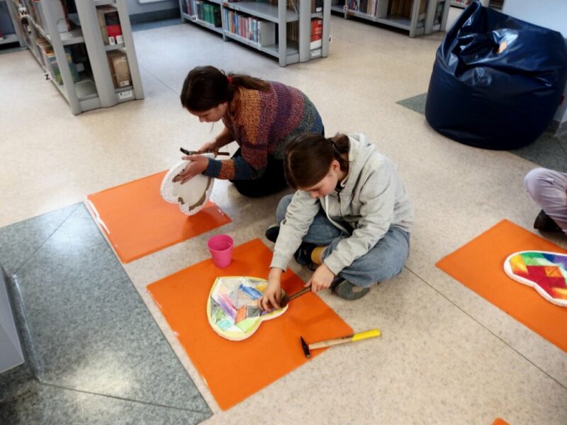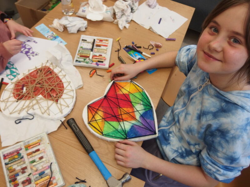 Przyszedł czas na wykonanie podzielonych wieloma uczuciami i rozterkami serc, gdzie pasma włóczki imitować miały mocno wplatające się w serce korzenie złotego kwiatu paproci. Pomysły na wypełnienie płócien i dobór kolorów były najróżniejsze. Mieliśmy przy tym sporo zabawy, a stukot młotków rozlegał się na całym piętrze, czasami nieco się splątaliśmy i trochę pobrudziliśmy, ale efekty wytrwałej pracy są godne podziwu.