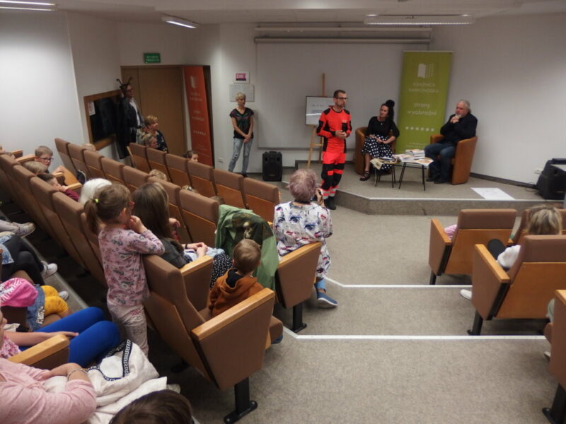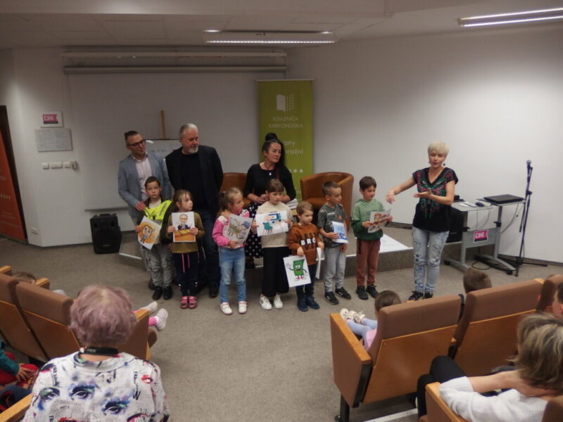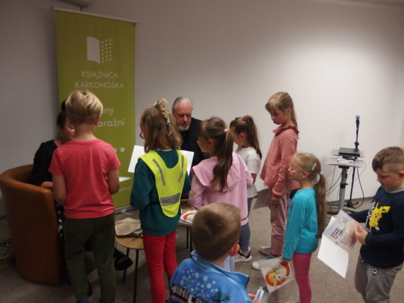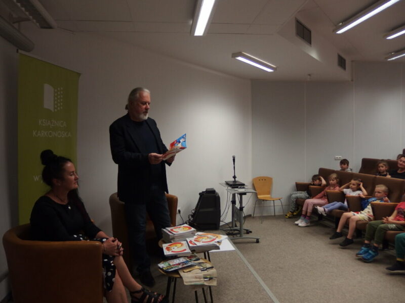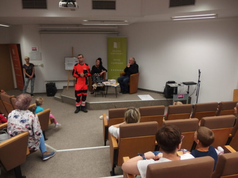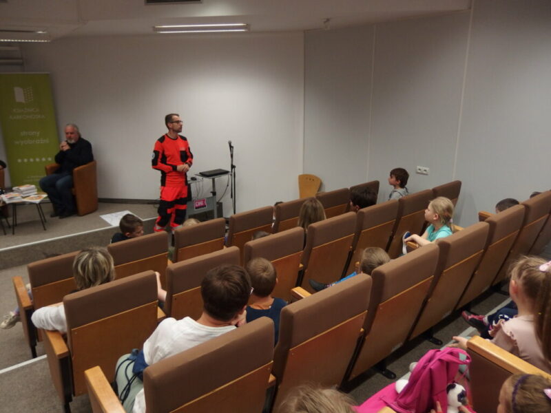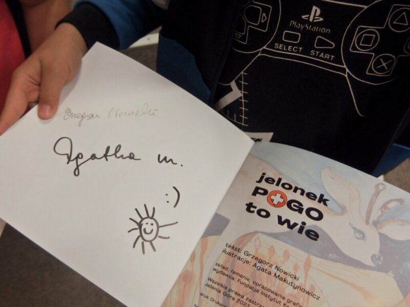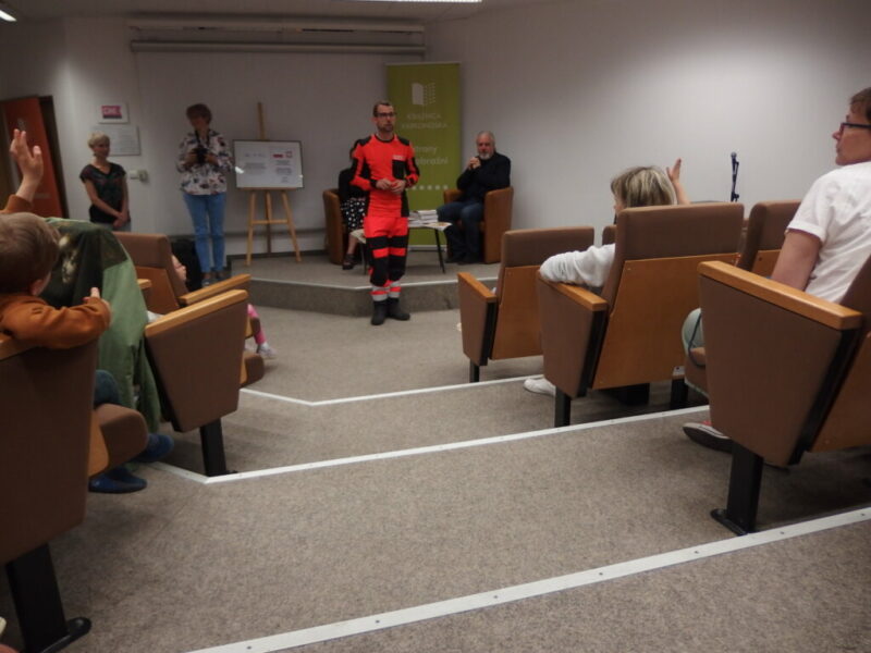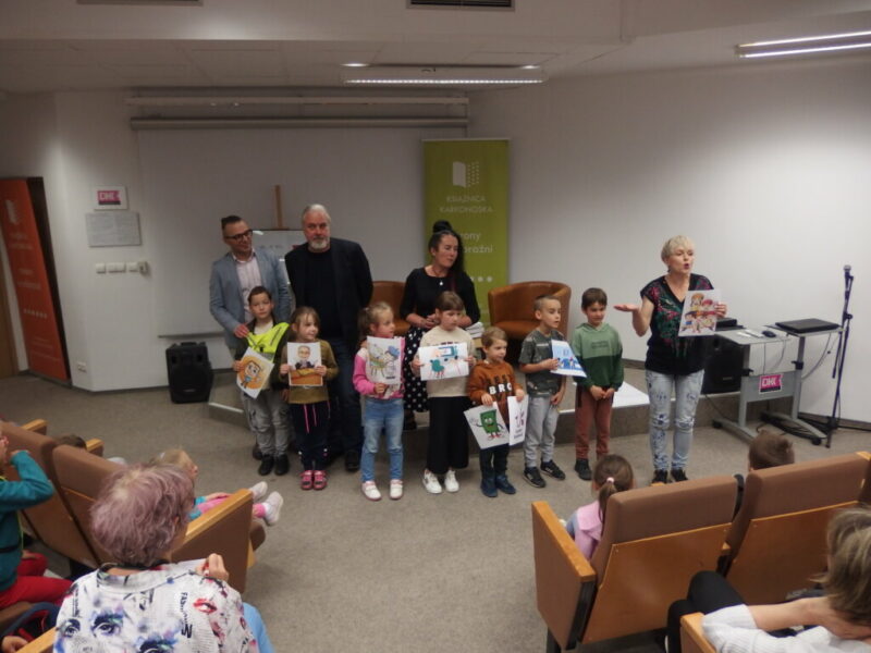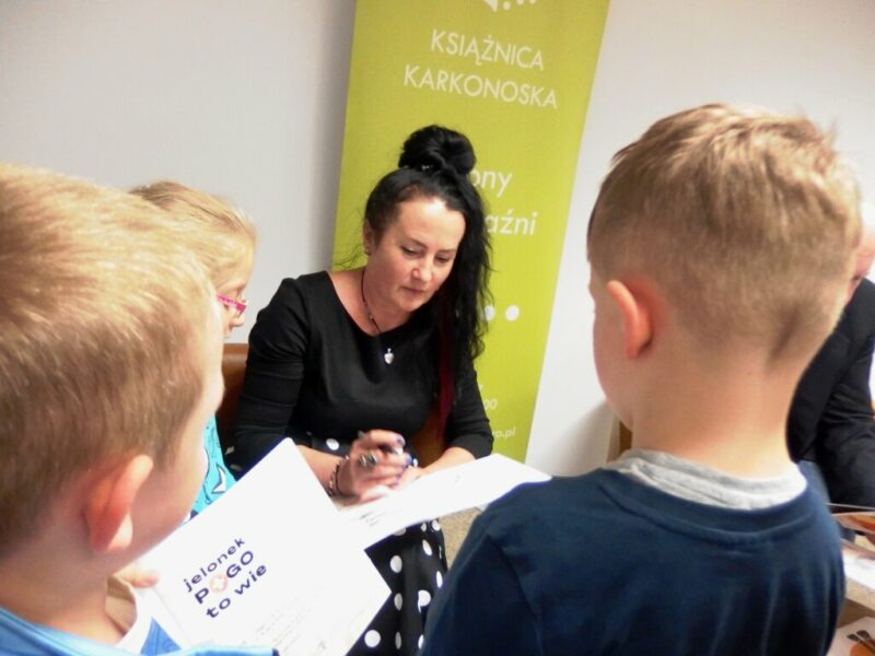 W Książnicy Karkonoskiej gościliśmy twórców i pomysłodawców książeczki dla dzieci pt. „Jelonek Pogo to wie”. Jest to opowieść o jelonku, który postanowił zostać ratownikiem. Książka powstała dzięki Fundacji Instytut Karkonoski, a na pomysł stworzenia edukacyjnej opowiastki dla najmłodszych, której bohaterem jest jelonek Pogo, wpadł pan Mariusz Gierus – dyrektor Pogotowia Ratunkowego w Jeleniej Górze. Przygotowaniem tekstu zajął się Grzegorz Nowicki, jeleniogórski poeta. Do współpracy przy tworzeniu książeczki zaproszono Agatę Makutynowicz, artystkę z Karpacza, która wykonała przepiękne akwarelowe ilustracje. W spotkaniu z młodą publicznością brał udział również ratownik medyczny, który opowiedział o tym, co zrobić, kiedy ktoś się źle poczuje, dlaczego tak znacząca jest pierwsza pomoc oraz przypomniał dzieciom ważne numery alarmowe.