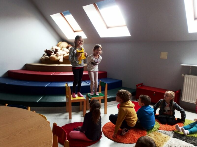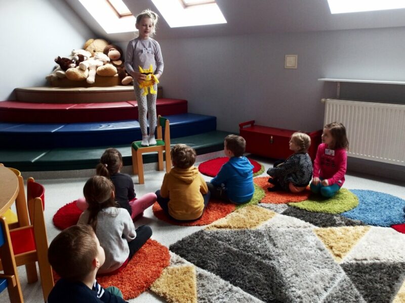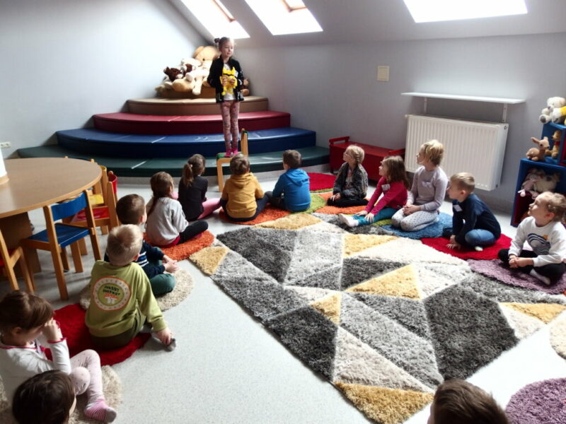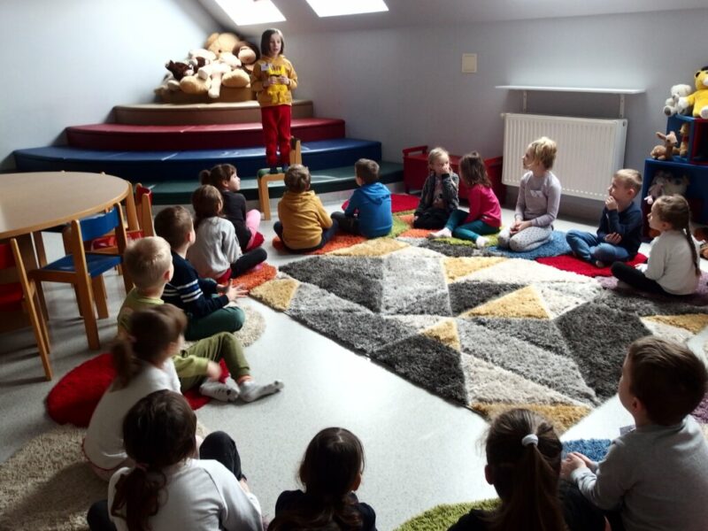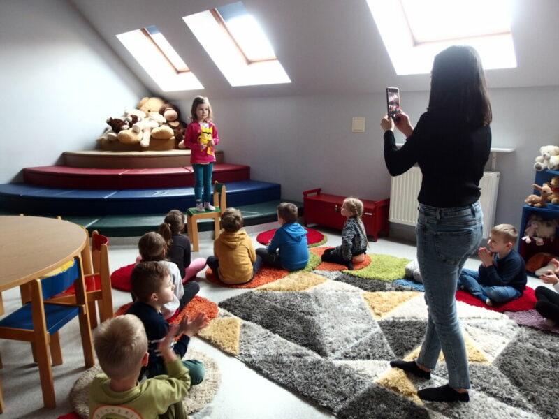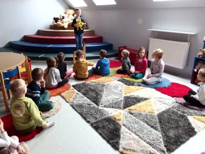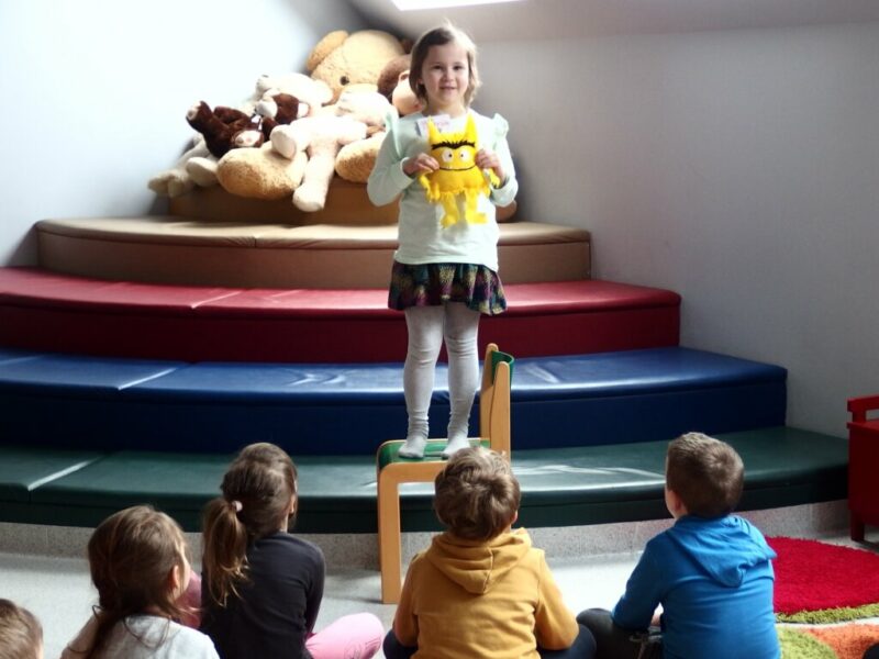 Na dzisiejszym spotkaniu Kolorowy Potwór miał nie lada trudne zadanie: wyruszyć z przedszkolakami w podróż po odwagę i wraz z nimi odkrywać dary mężnego serca. Muchomorki z Miejskiego Przedszkola nr 2 w Jeleniej Górze w swoich krótkich publicznych wystąpieniach mogły skorzystać ze wsparcia Kolorowego Potwora oraz jego cennych wskazówek, jak radzić sobie w trudnych, stresujących sytuacjach, mądrze korzystać z odwagi i jak ją odróżnić od brawury. Zastanawialiśmy się wspólnie, jak uczyć się odpowiedzialności w codziennym życiu.
