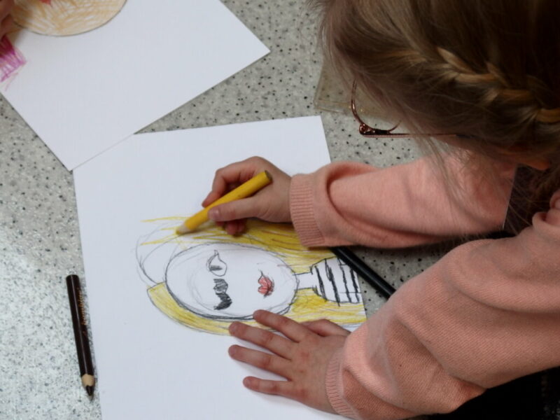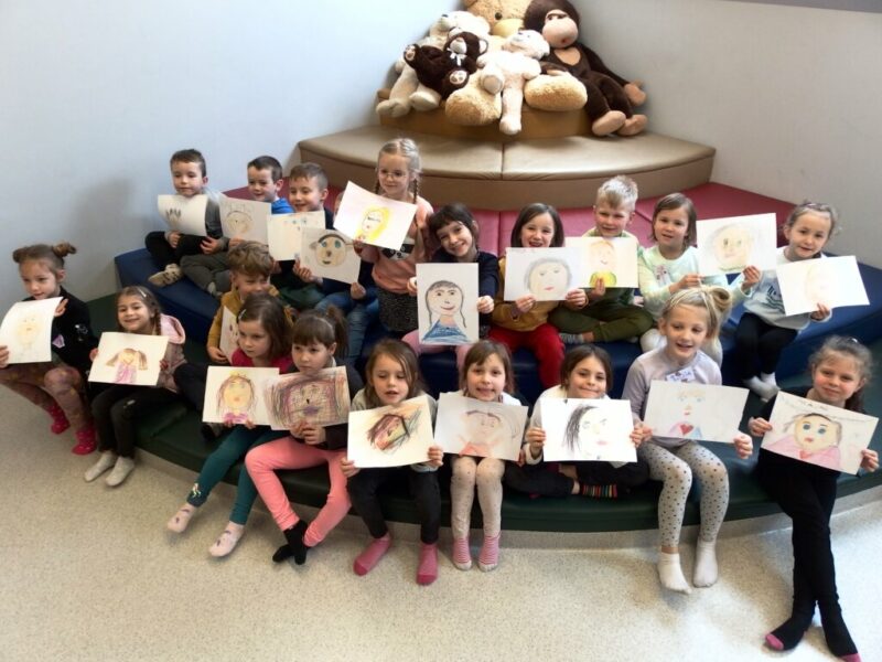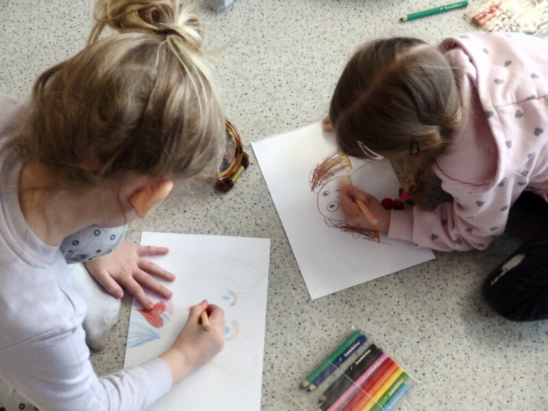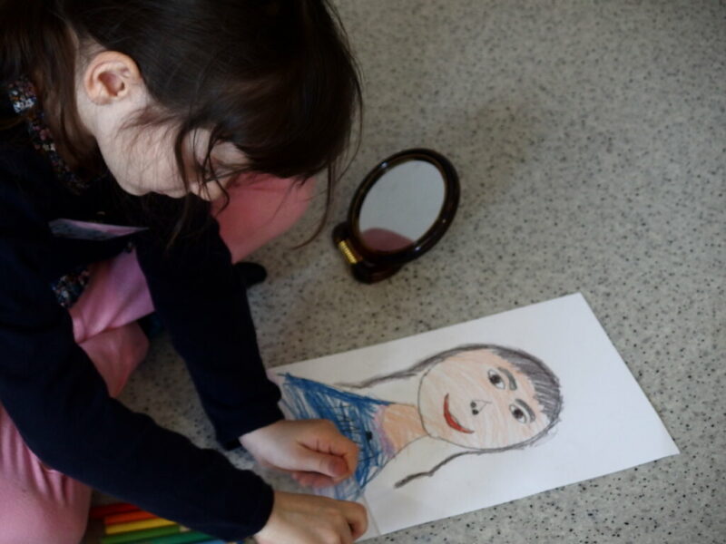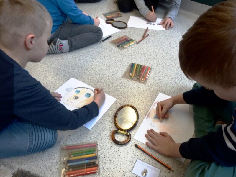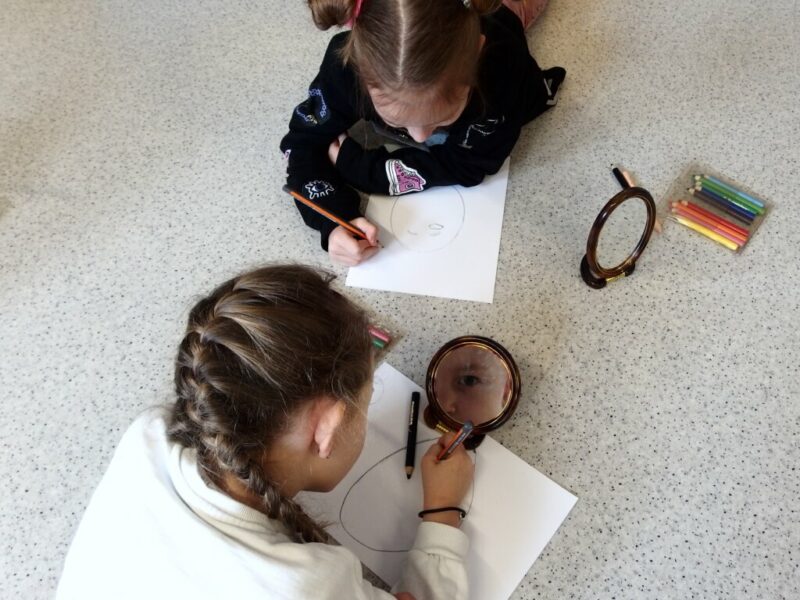 Na zakończenie zajęć rysowaliśmy nasze portrety, przyglądając się uważnie naszym odbiciom w lusterkach. Pomimo lęków typu „nie uda się”, „nie umiem”, „to za trudne” – podeszliśmy odważnie do tego ćwiczenia. 🙂 I – udało się!