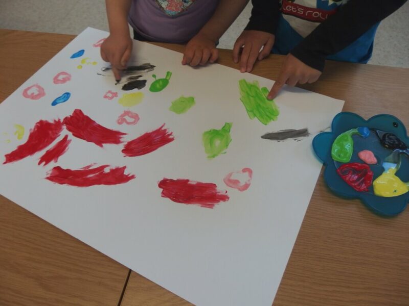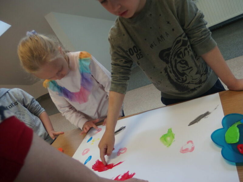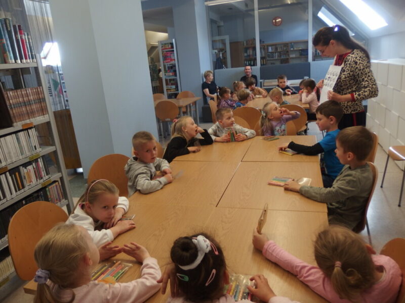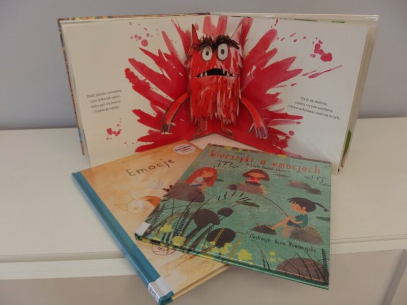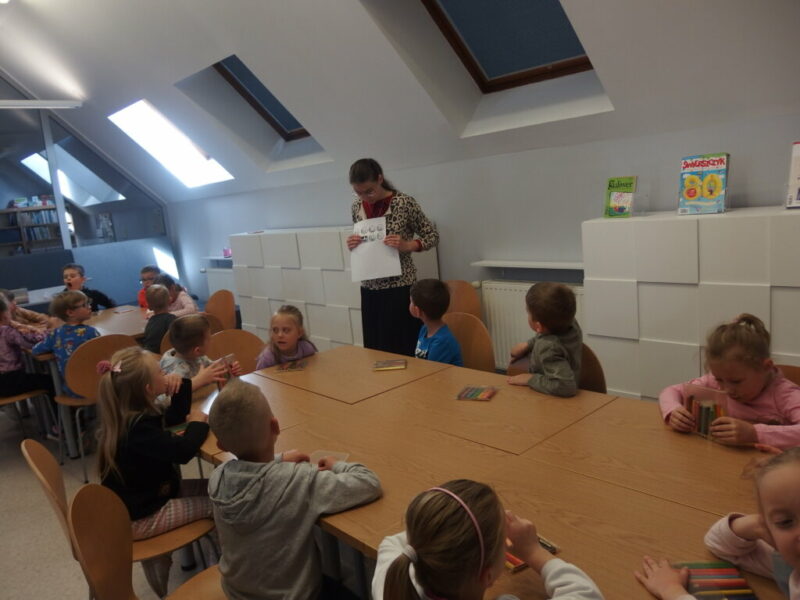 W czwartkowe, pochmurne popołudnie na lekcję biblioteczną wskoczyły do nas „Żabki” z Niepublicznego Przedszkola „Tuptuś”. Lekcję o rozróżnianiu emocji zaczęliśmy od przeczytania i obejrzenia książki „Kolorowy potwór”. Później pobawiliśmy się farbkami, próbując oddać kolorem i kształtem emocje, jakie nam dzisiaj towarzyszą. Finalnie otrzymaliśmy bardzo abstrakcyjną, ale kolorową pracę, którą dzieci zabrały ze sobą do przedszkola.