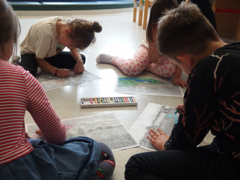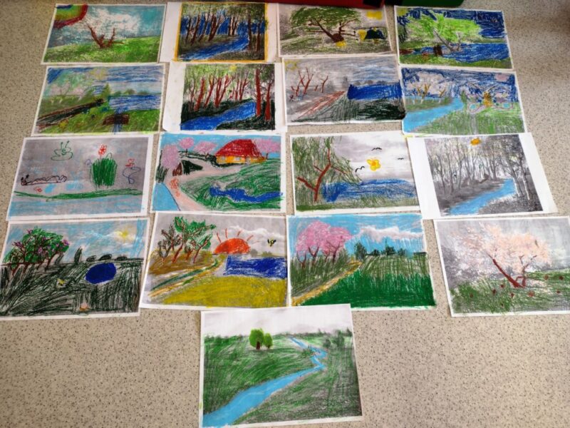 Na arkuszach przedstawiających zarys wiosennego krajobrazu stworzyliśmy piękne wiosenne krajobrazy.