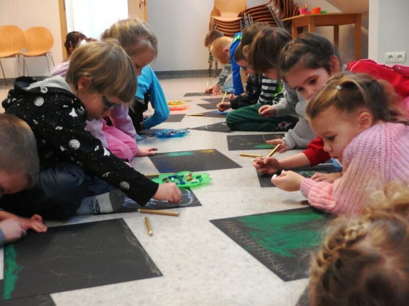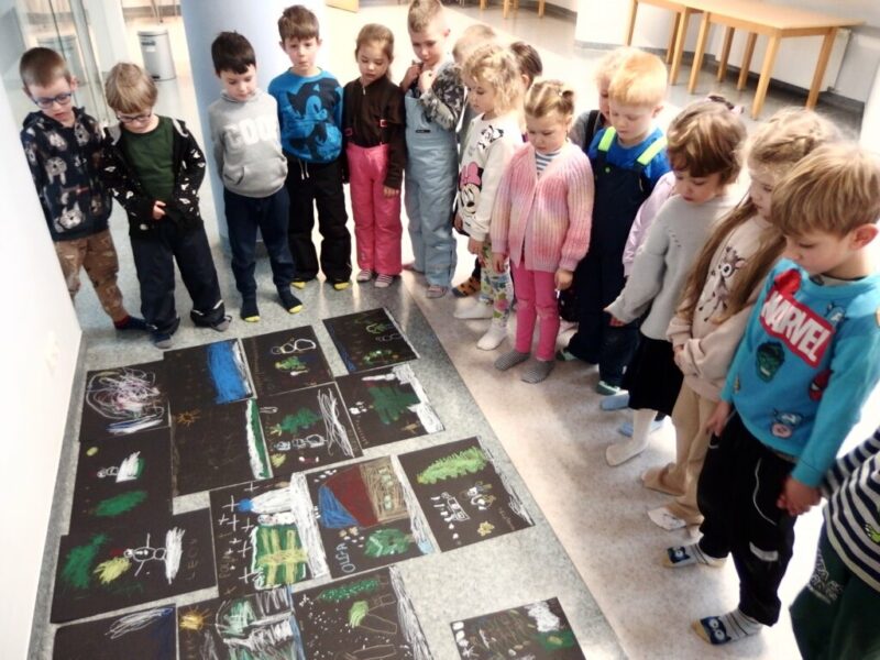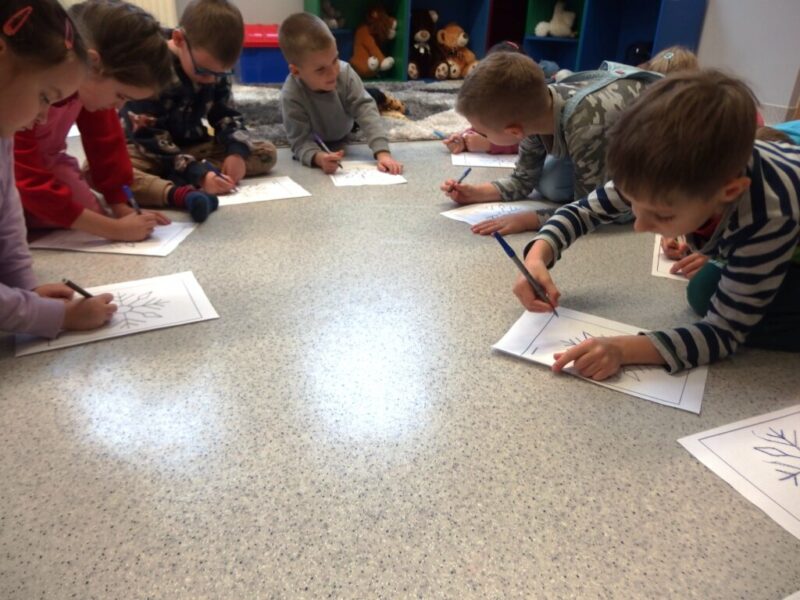 Przedszkolaki z grupy Rekinów z Niepublicznego Przedszkola Piątka5 w Jeleniej Górze słuchały zimowych opowieści o zimowym krajobrazie, który może być ukształtowany siłami natury bądź działalnością człowieka. Dzieci rysowały po śladzie śnieżynki, a potem tworzyły swoje śnieżynkowe puchate od śniegu krajobrazy.