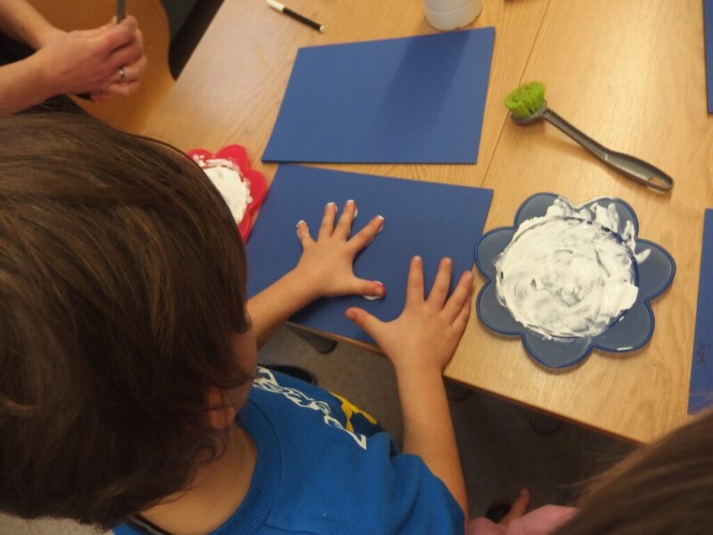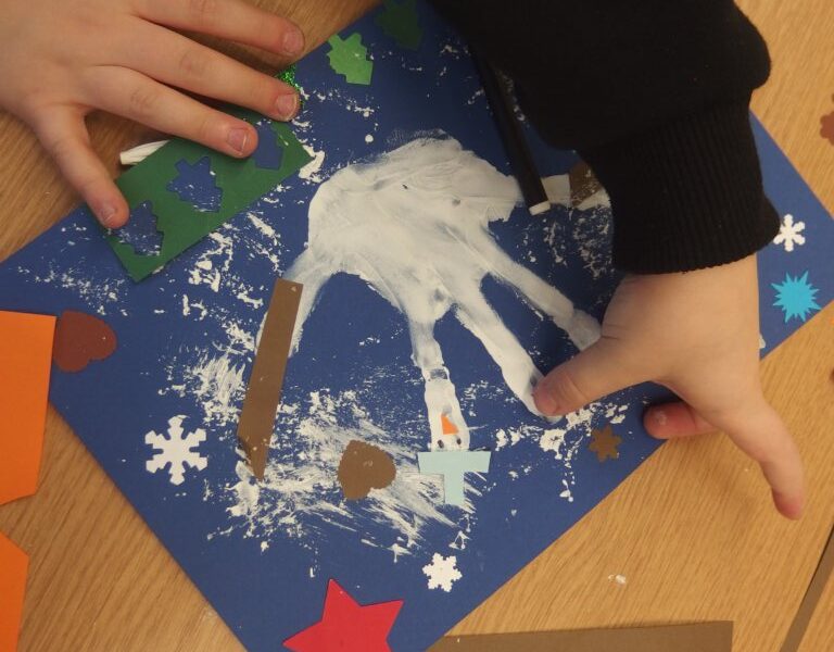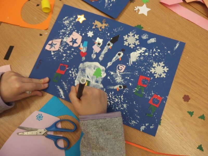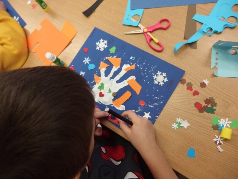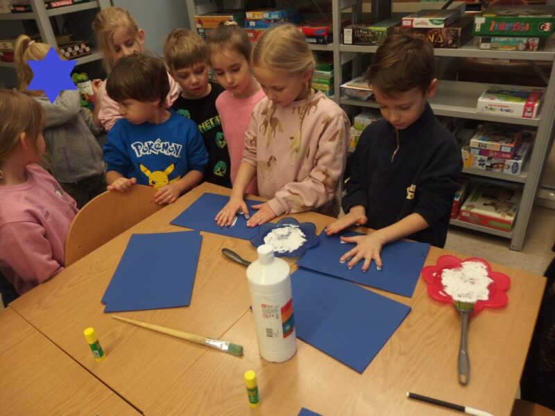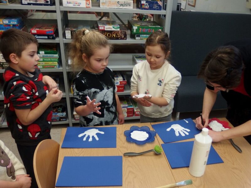 W ten wtorek, idealnie pod temat zajęć, ulice przyprószył śnieg. Grupa 6-latków z Niepublicznego Przedszkola „Król Maciuś” odwiedziła nas, by zgłębiać tajniki tej cudownej, choć surowej w temperaturach, pory roku. W czytelni Biblioteki Dziecięco-Młodzieżowej na przedszkolaków czekały granatowe kartki i biała farba. Pierwszym wyzwaniem było zrobienie odcisku swojej ręki, drugim tych rąk umycie, a później dzieci czekał mały sportowy przerywnik. Przedszkolaki bardzo dużo wiedziały o zimie, dopełniliśmy jeszcze wiedzy, odczytując wiersz Małgorzaty Strzałkowskiej. Przy okazji przypomnieliśmy sobie o elementach, jakie powinien posiadać każdy śniegowy bałwanek. Było nam to potrzebne w naszej pracy plastycznej, gdzie z każdego odbitego na kartce paluszka próbowaliśmy zrobić małego bałwanka. Kreatywność dzieci była ogromna (niektóre postaci otrzymały nawet własne koszulki), zobaczcie sami.