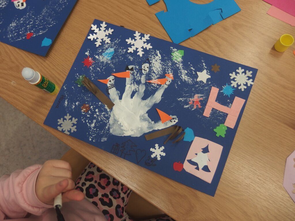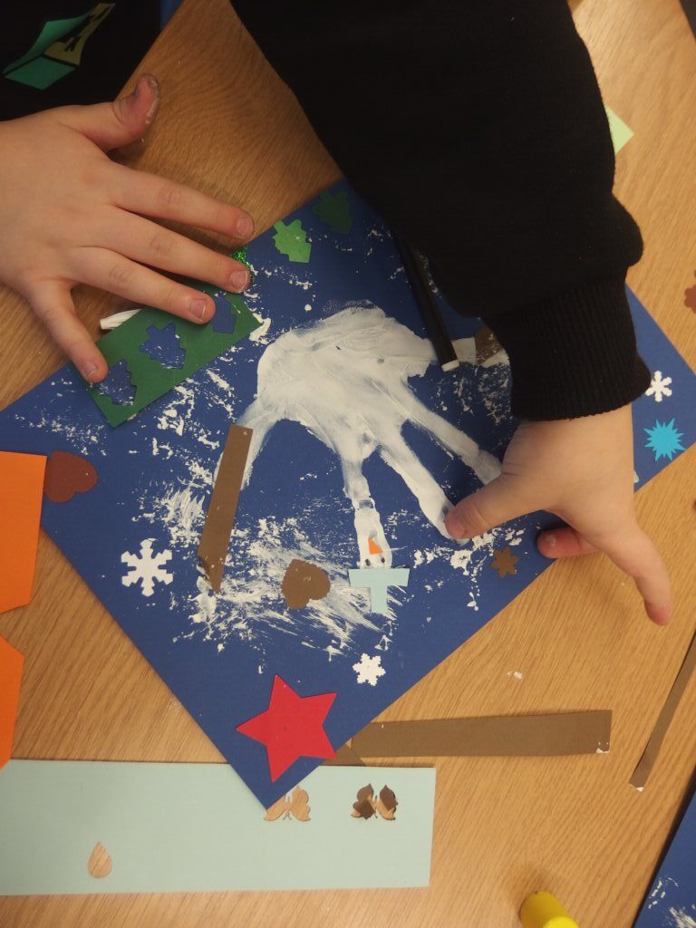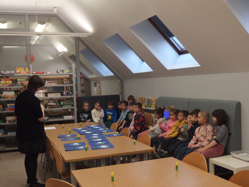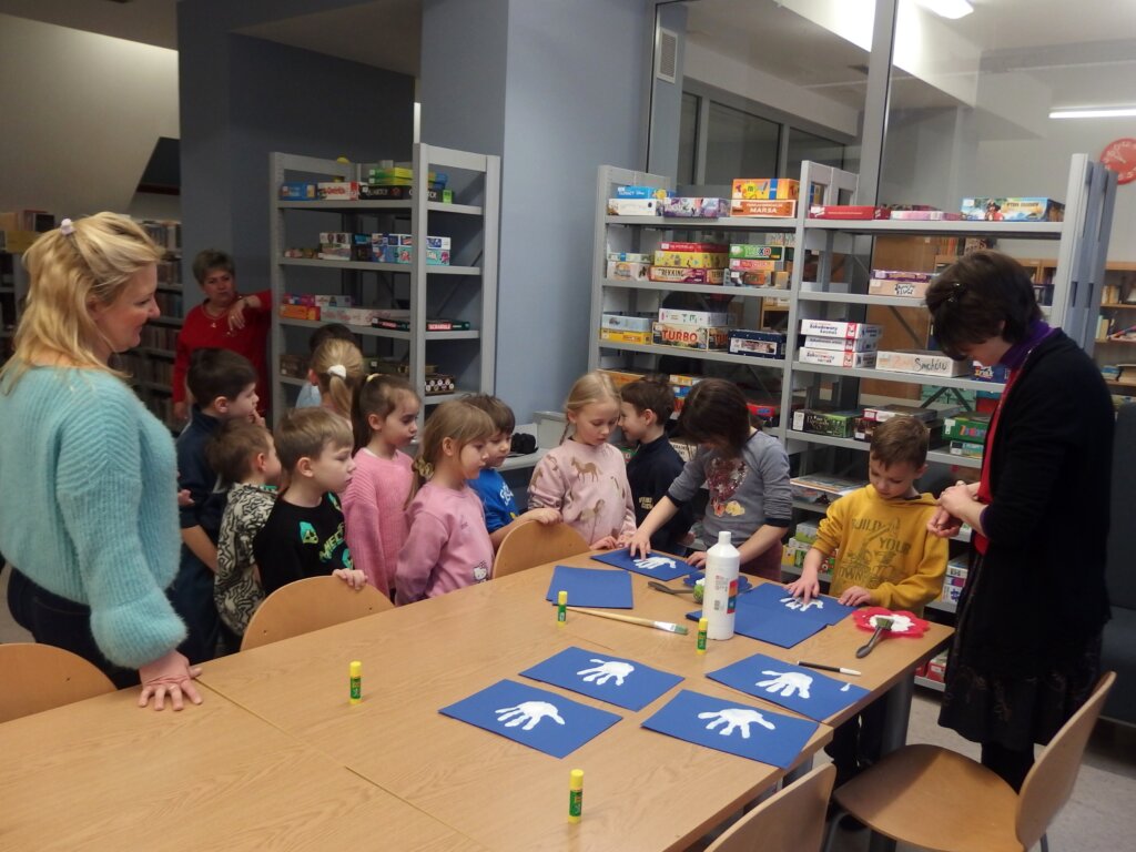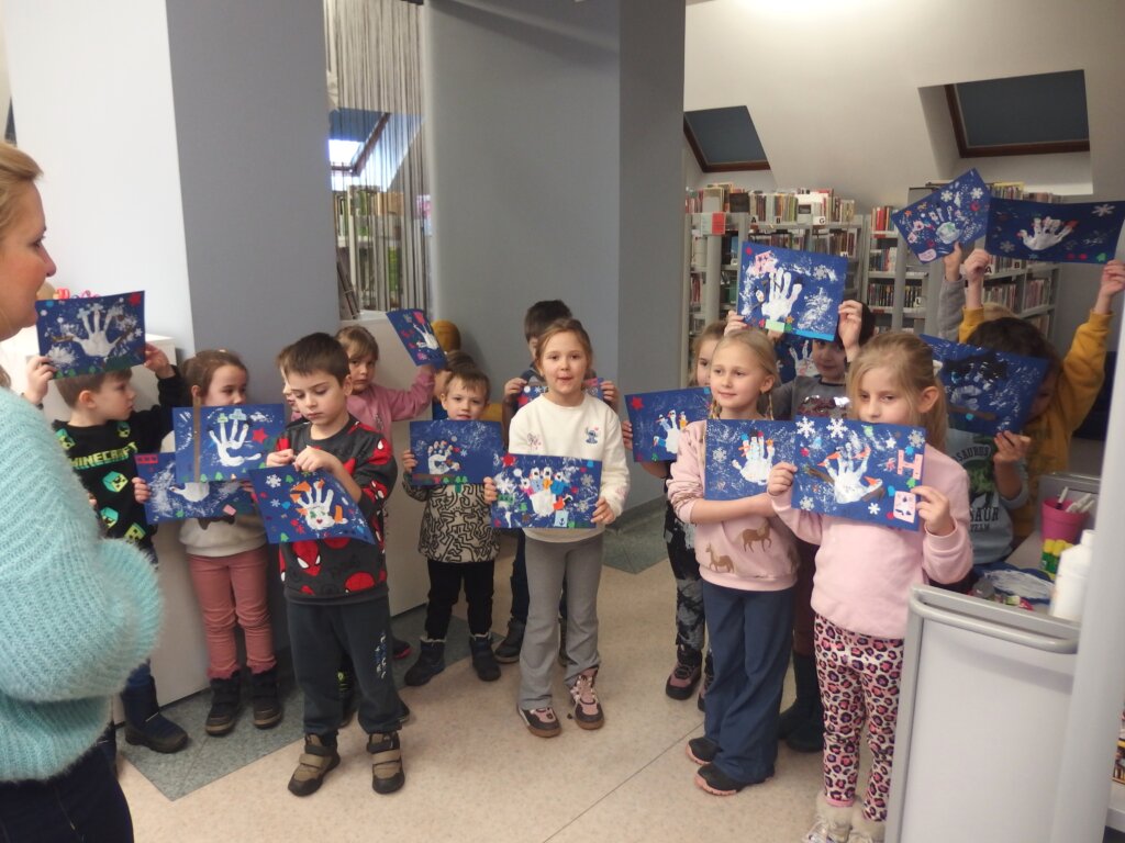 W ten wtorek, idealnie pod temat zajęć, ulice przyprószył śnieg. Grupa 6-latków z Niepublicznego Przedszkola „Król Maciuś” odwiedziła nas, by zgłębiać tajniki tej cudownej, choć surowej w temperaturach, pory roku. W czytelni Biblioteki Dziecięco-Młodzieżowej na przedszkolaków czekały granatowe kartki i biała farba. Pierwszym wyzwaniem było zrobienie odcisku swojej ręki, drugim tych rąk umycie, a później dzieci czekał mały sportowy przerywnik. Przedszkolaki bardzo dużo wiedziały o zimie, dopełniliśmy jeszcze wiedzy, odczytując wiersz Małgorzaty Strzałkowskiej. Przy okazji przypomnieliśmy sobie o elementach, jakie powinien posiadać każdy śniegowy bałwanek. Było nam to potrzebne w naszej pracy plastycznej, gdzie z każdego odbitego na kartce paluszka próbowaliśmy zrobić małego bałwanka. Kreatywność dzieci była ogromna (niektóre postaci otrzymały nawet własne koszulki), zobaczcie sami.