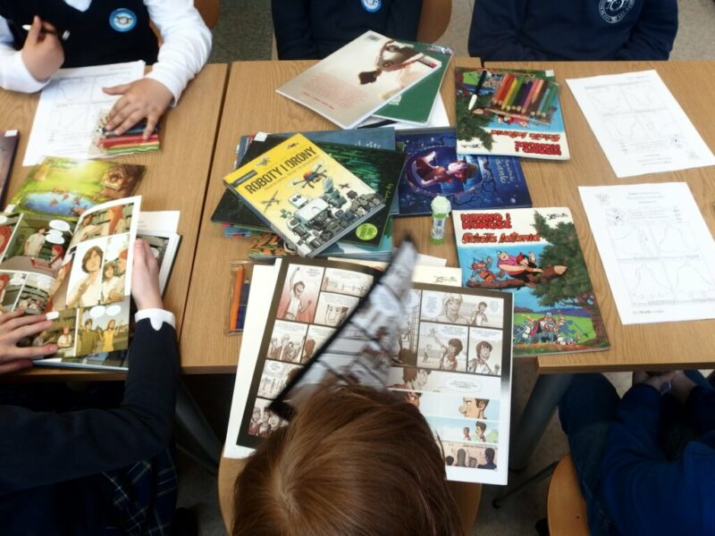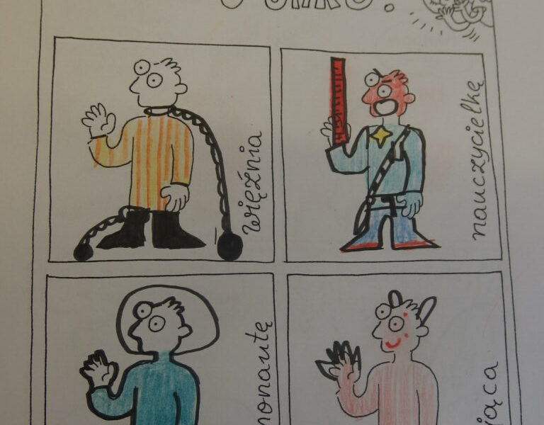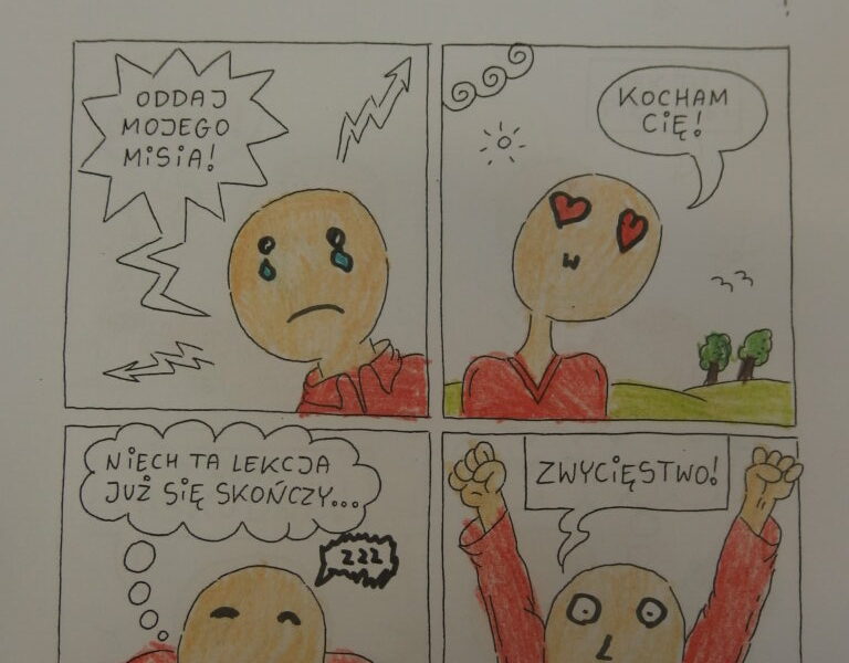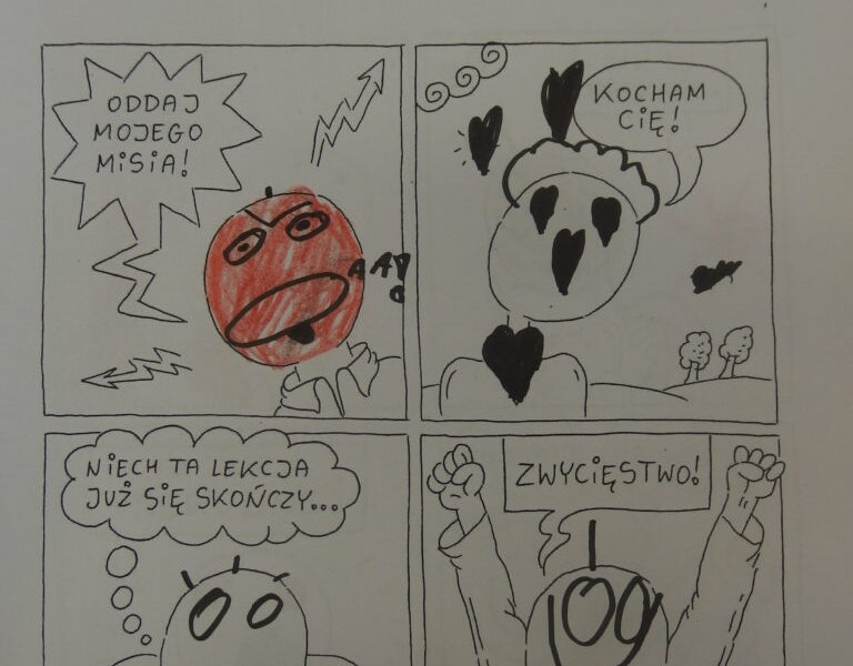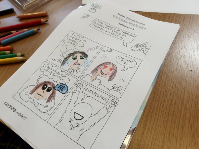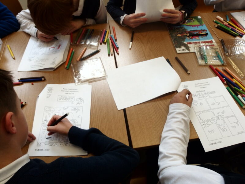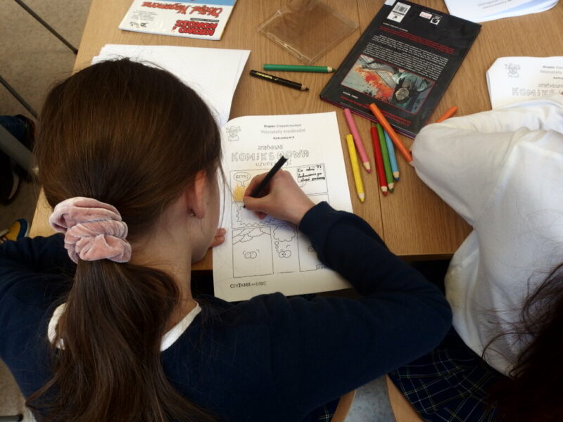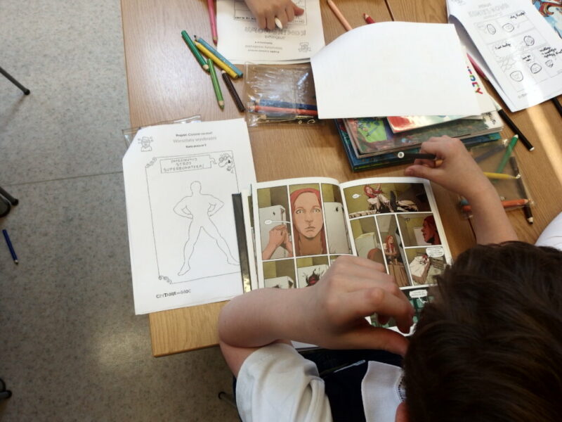Na dzisiejszych zajęciach wraz z uczniami z Niepublicznej Szkoły Podstawowej nr 707 w Karpaczu poznawaliśmy komiksy. Wskazywaliśmy te elementy, które sprawiają, że komiks jest ciekawy, uzupełnialiśmy karty zadań, ćwicząc tym samym tworzenie własnej opowieści graficznej. Uczniowie również mieli okazję zapoznać się z ofertą biblioteki przeglądając wybrane tytuły komiksów dostępnych w wypożyczalniach. Na zakończenie warsztatów każde dziecko stworzyło swojego SUPERBOHATERA.