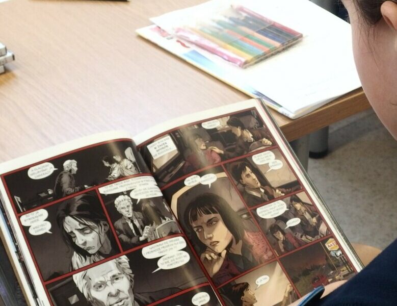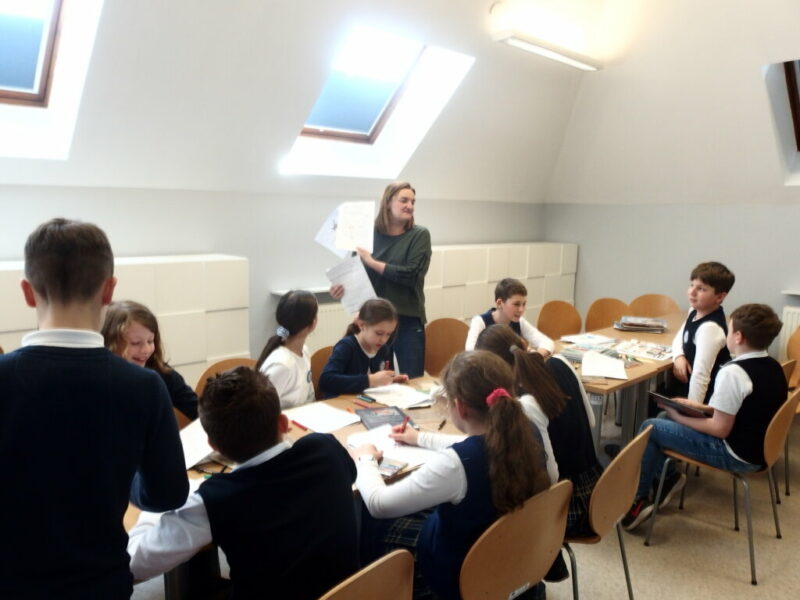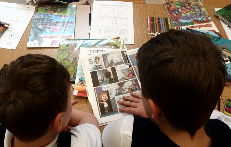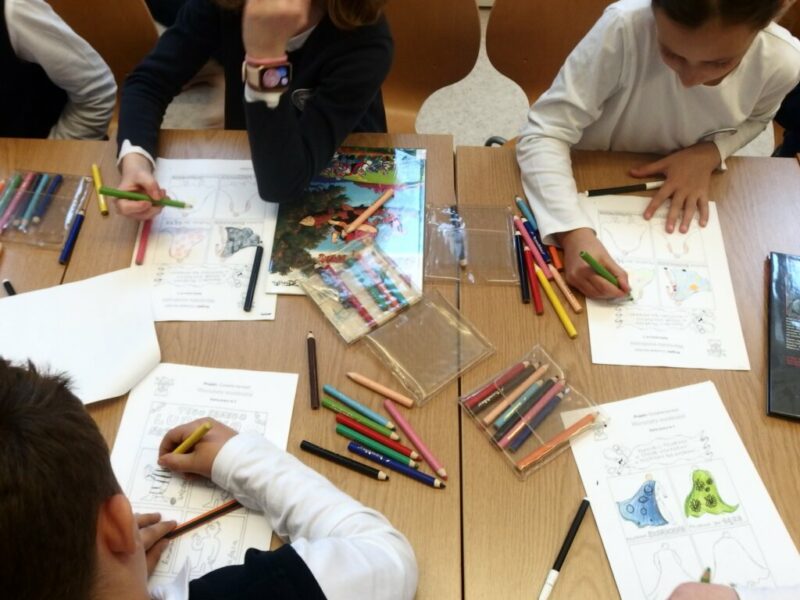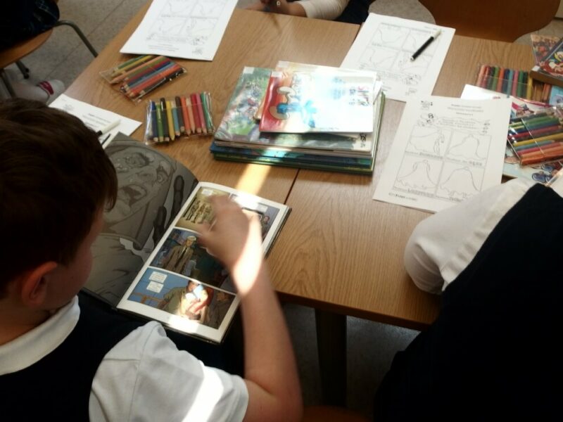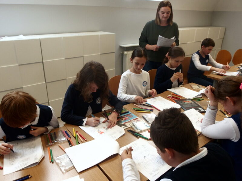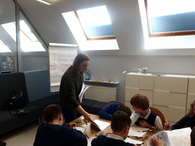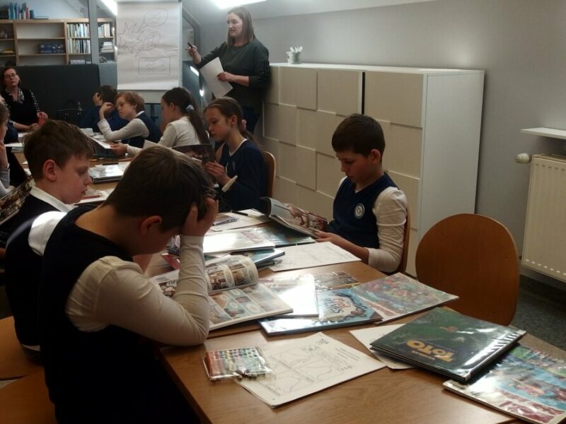 Na dzisiejszych zajęciach wraz z uczniami z Niepublicznej Szkoły Podstawowej nr 707 w Karpaczu poznawaliśmy komiksy. Wskazywaliśmy te elementy, które sprawiają, że komiks jest ciekawy, uzupełnialiśmy karty zadań, ćwicząc tym samym tworzenie własnej opowieści graficznej. Uczniowie również mieli okazję zapoznać się z ofertą biblioteki przeglądając wybrane tytuły komiksów dostępnych w wypożyczalniach. Na zakończenie warsztatów każde dziecko stworzyło swojego SUPERBOHATERA.