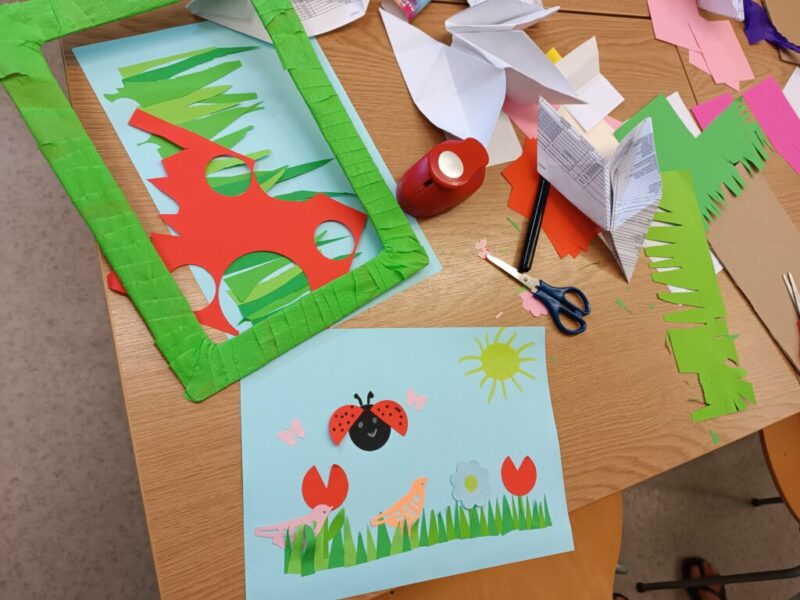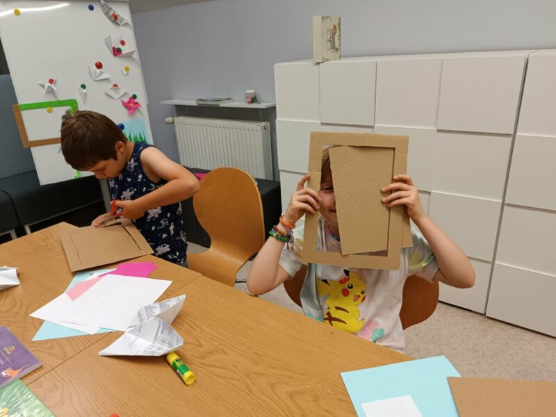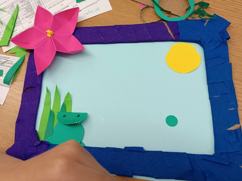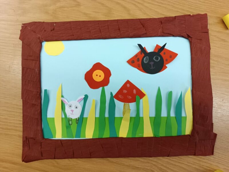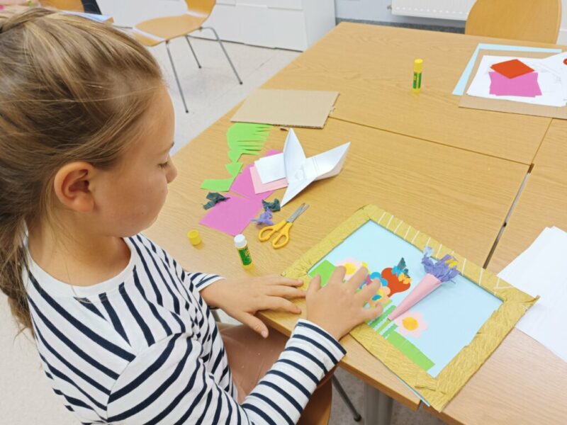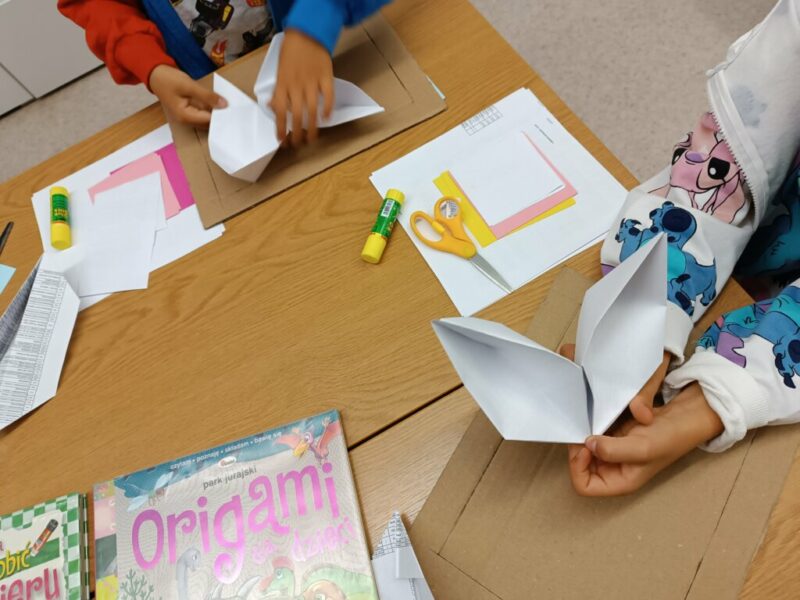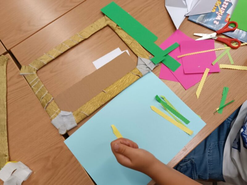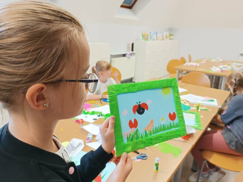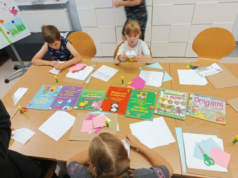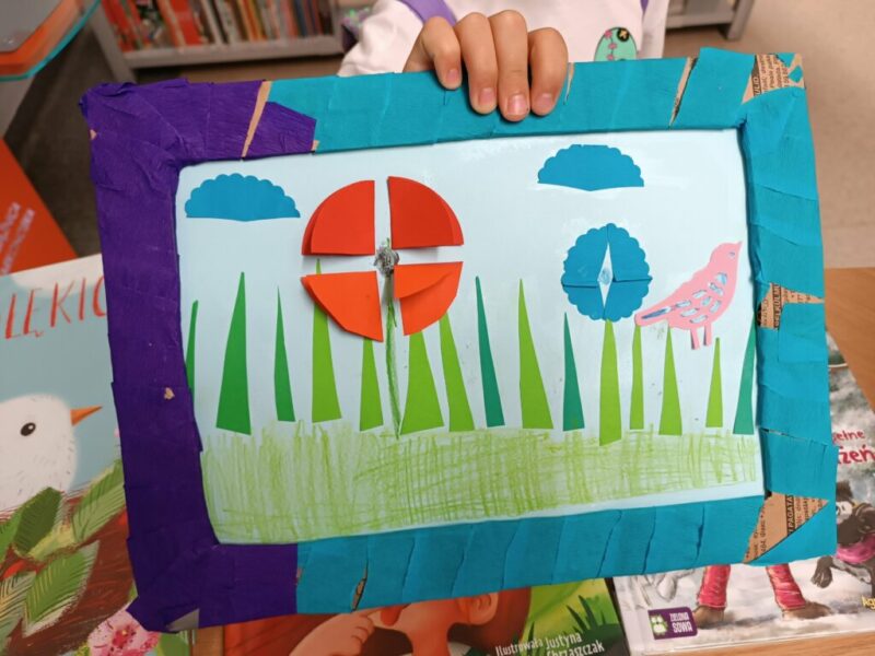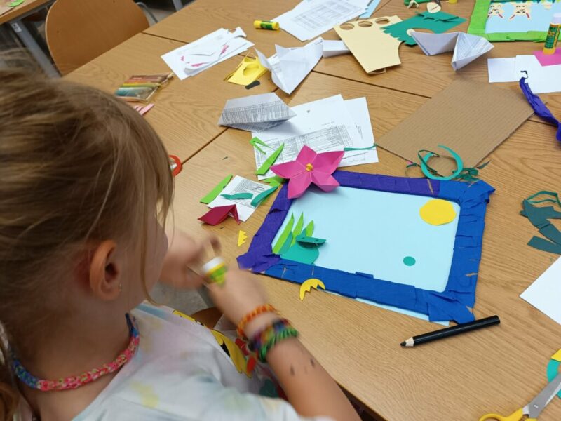 Fantastyczny czas wakacji, spacerów, kolorów, kwitnących łąk i śpiewających ptaków. Czy da się to wszystko pokazać przy pomocy papieru i wyobraźni? Oczywiście. Dla naszych Czytelników nie było żadnych trudnych elementów, nawet nauka wykonania pięciopłatkowych kwiatów modułowych techniką origami nie sprawiła przesadnych kłopotów. Przy pomocy różnych technik plastycznych, w tym prostego origami z kółek, na  zajęciach powstały piękne, letnie obrazy.