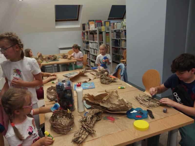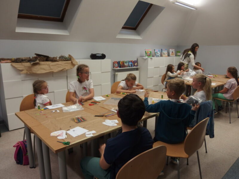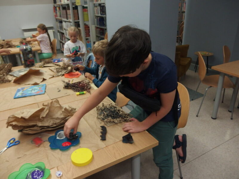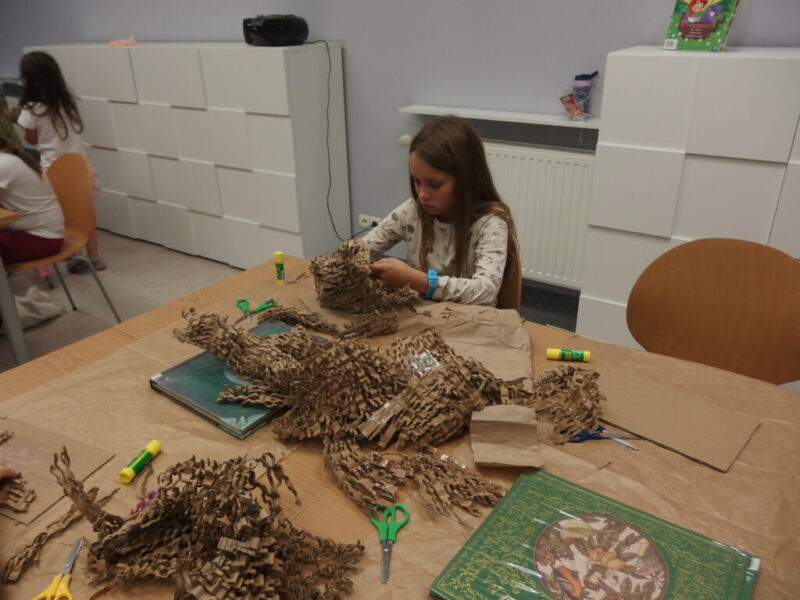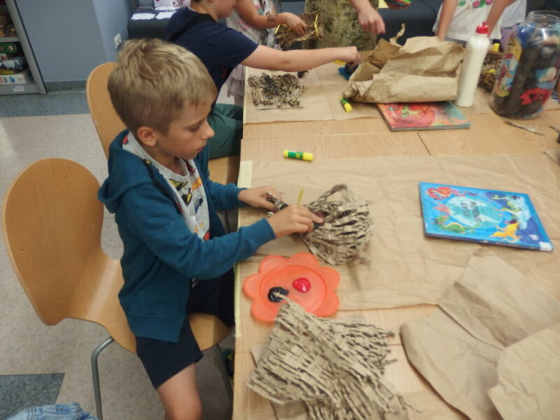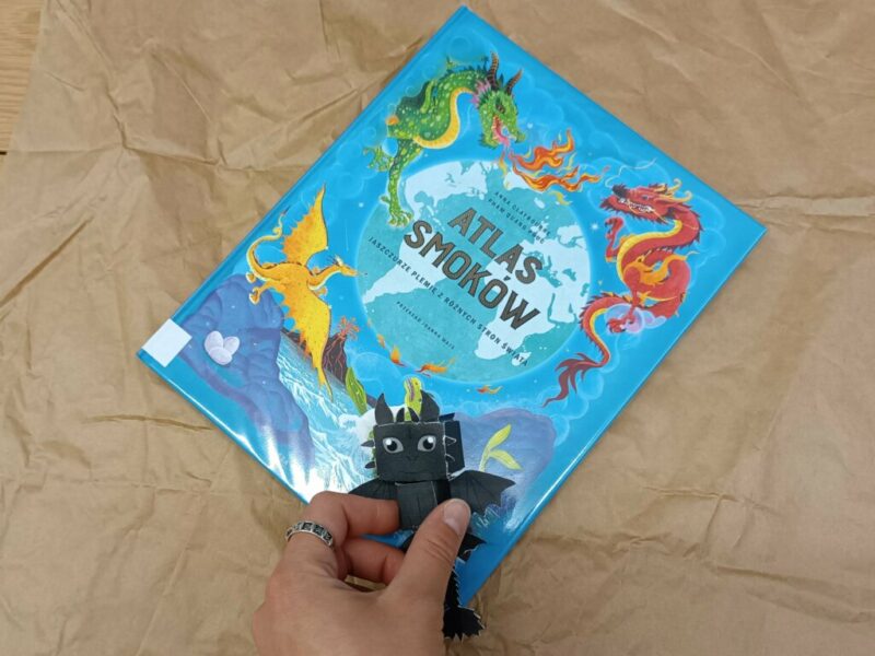 To były wymarzone zajęcia dla każdego wielkiego fana smoków, więc na pewno dla pani bibliotekarki 🙂 i ta ma nadzieję, że dzieciom też pozostanie po nich miłe wspomnienie i że wyniosły z nich nieco więcej niż gniazdo z własnym smokiem (raczej nie nożyczki i kleje… bardziej pobudzenie baśniowo-smoczych fantazji i wypożyczone książki 😉 ).