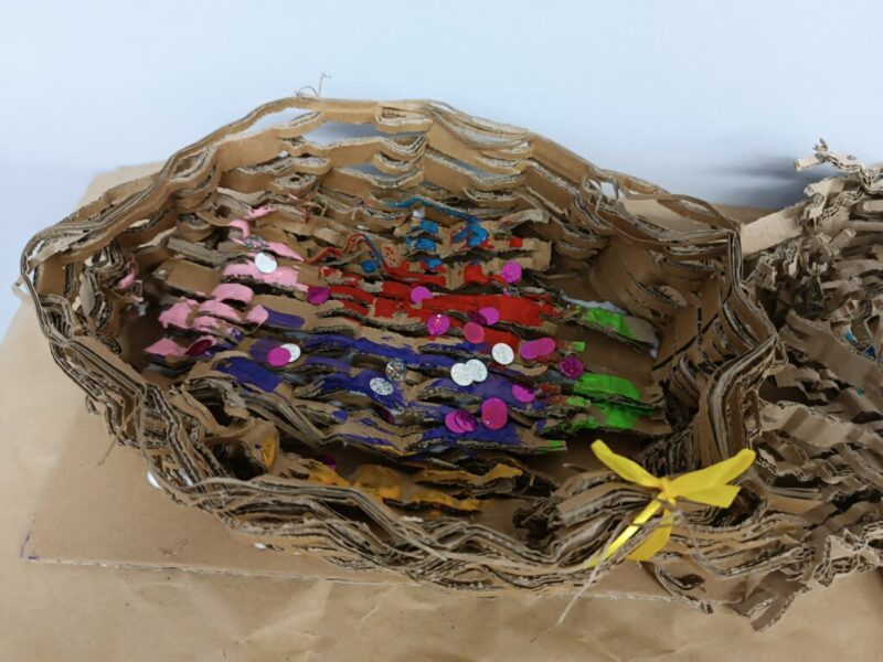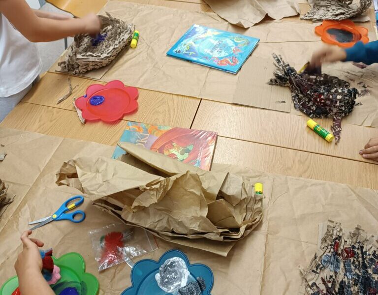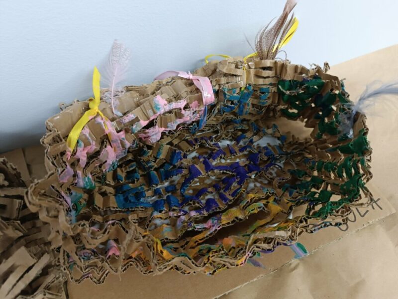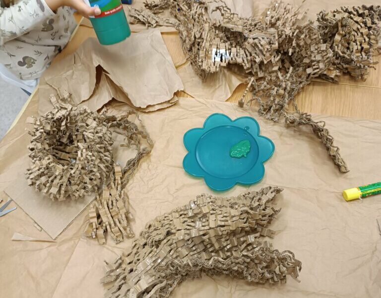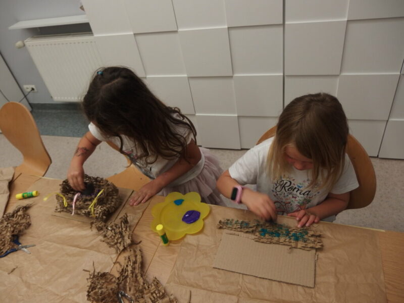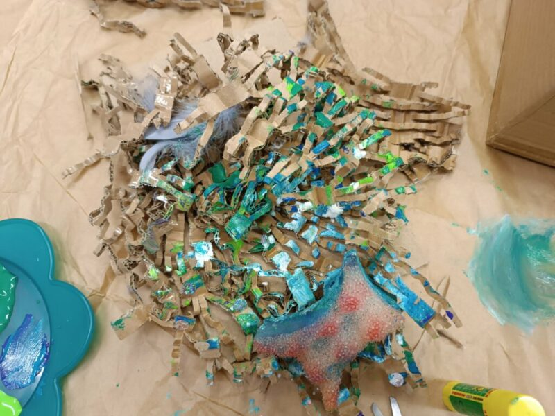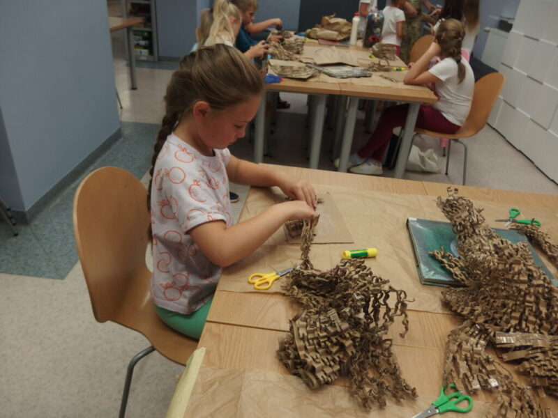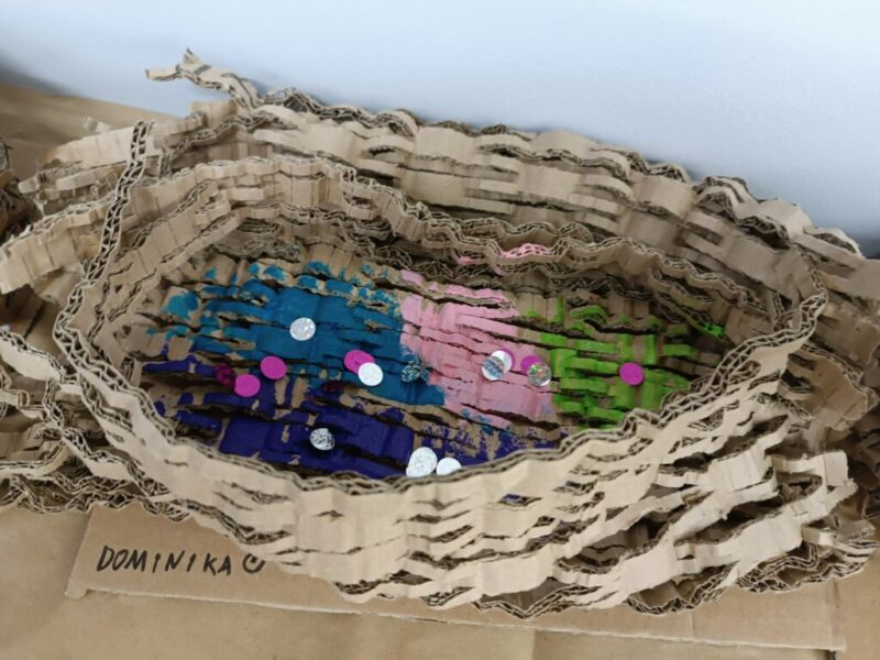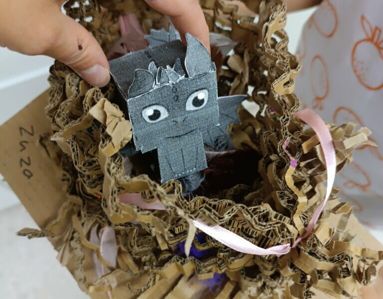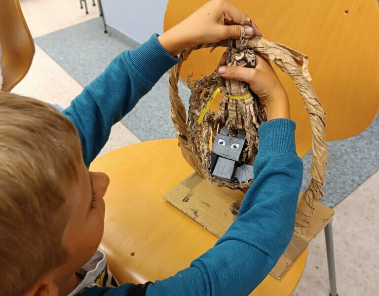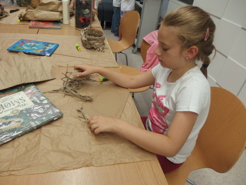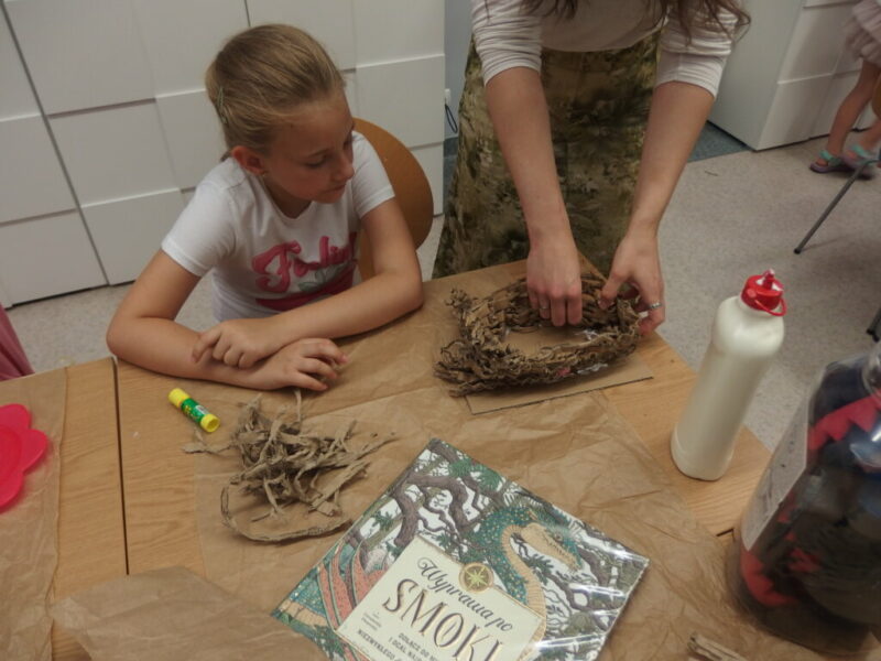 Drugi krok to uwicie odpowiedniego gniazda, dostatecznie wygodnego i barwnego, by przywabiło skrzydlatego gada (przyda się przy tym trochę miękkich piórek i błyszczących łusek). Pomysły dzieci były najróżniejsze, powstała przy tym nawet jedna wisząca konstrukcja!