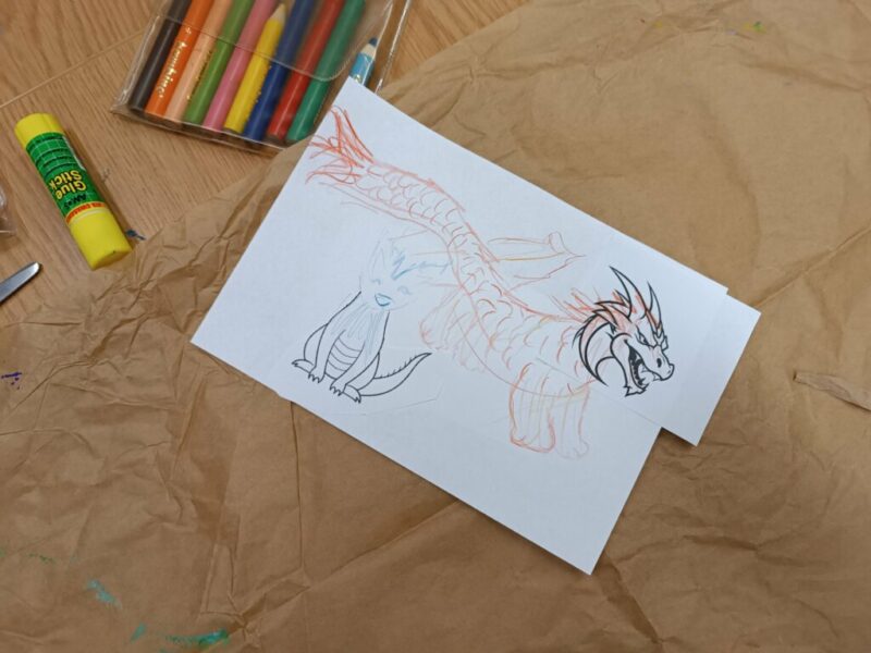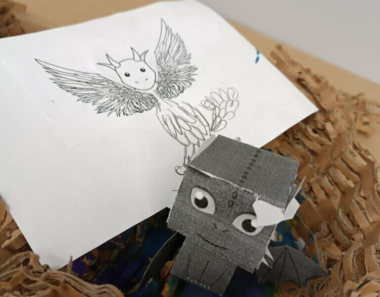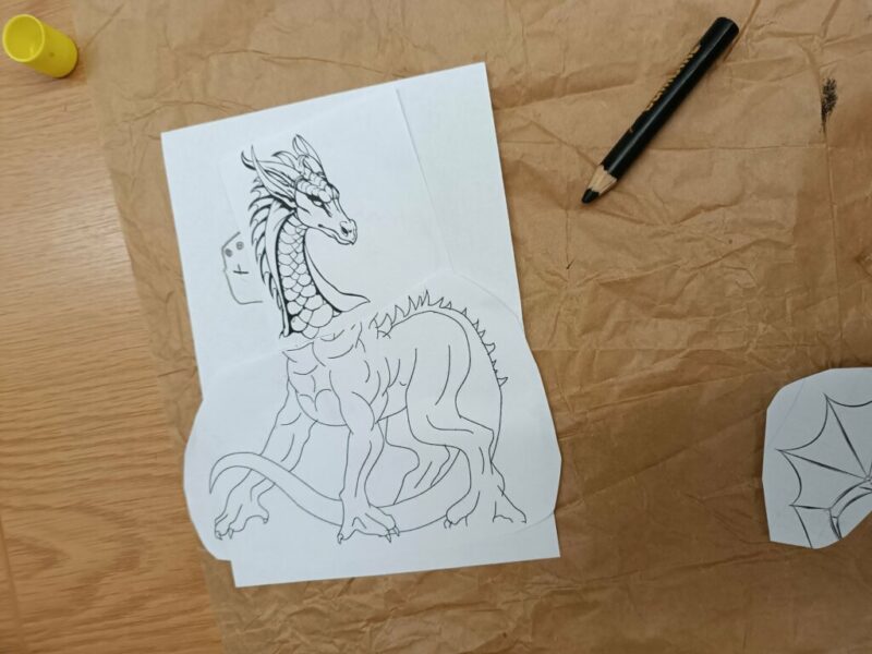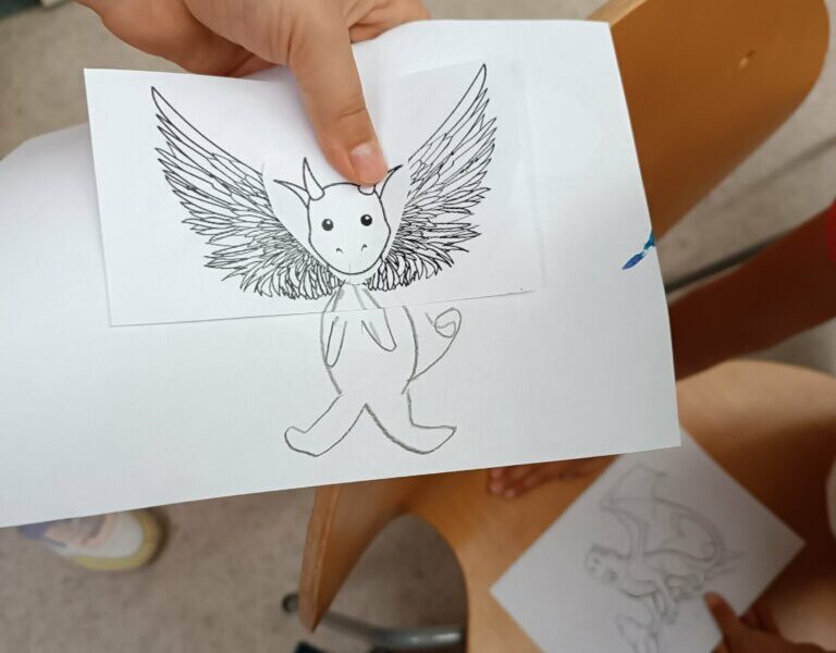 Do trzeciego kroku należy podejść ze szczególną ostrożnością. To modelowanie swojej wyobraźni, ograniczenia w zakresie wąskich horyzontów myślowych – „mocno niepomocne”. Dzieci dostały niedokończone wydruki smoków, a wyzwaniem było stworzenie z nich zupełnie nowego rodzaju skrzydlaka.