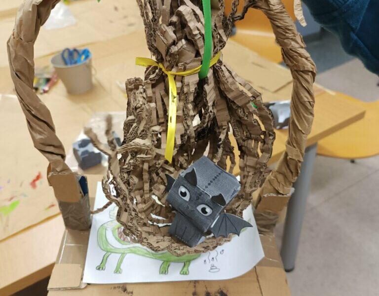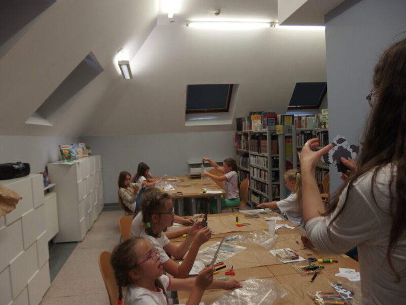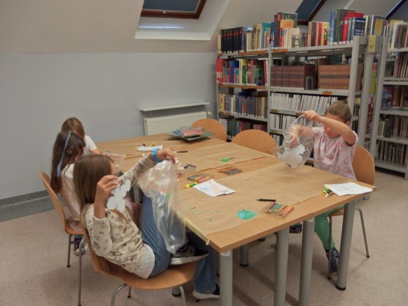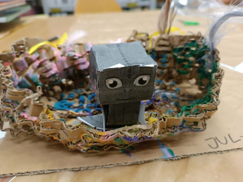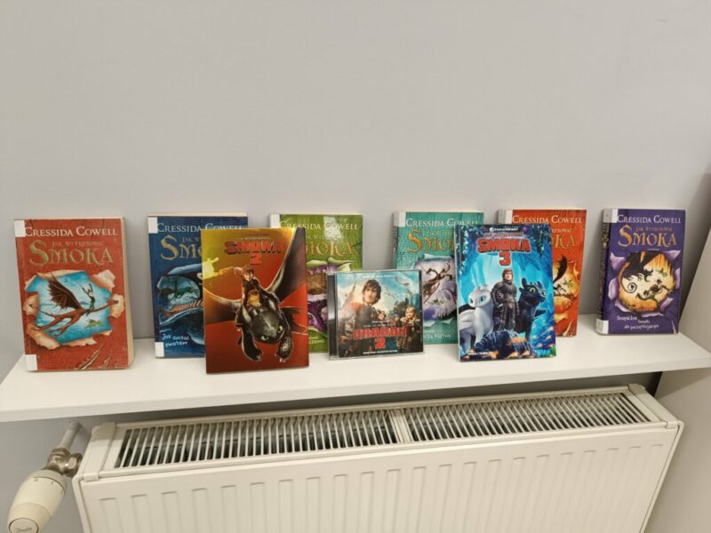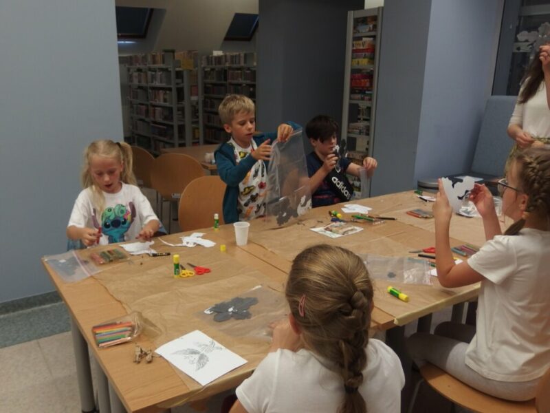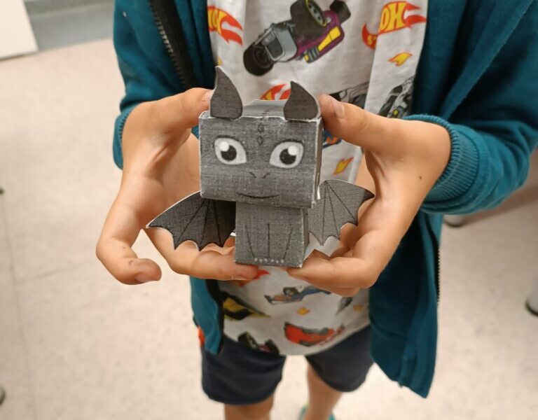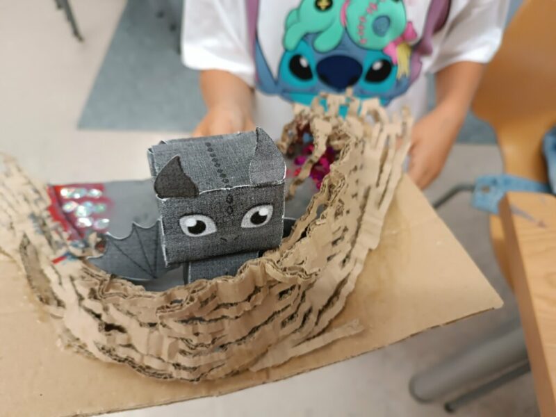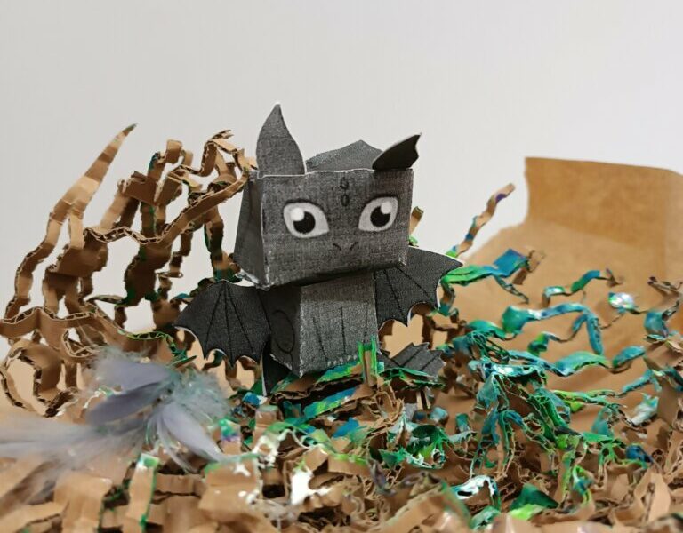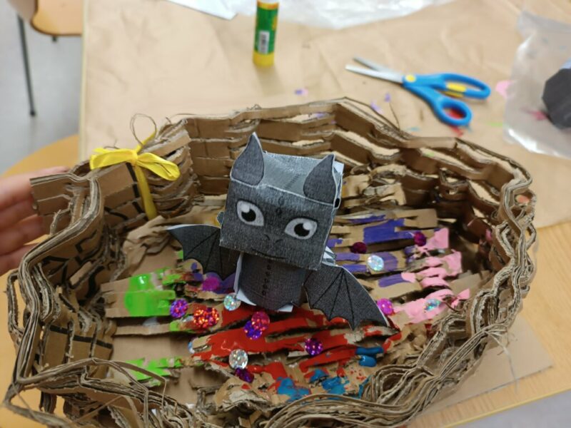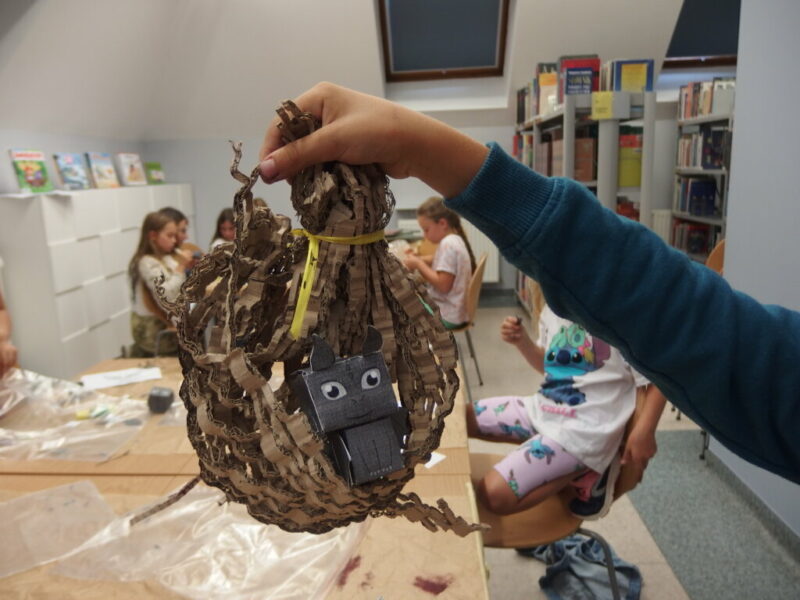 Gdy nadszedł czwarty krok, powietrze zamarło, a biblioteka się zatrzęsła. Przybyły do nas! Ledwie smoczątka. Po rozpoznaniu okazało się, że to Nocne Furie. Trzeba je było jednak jeszcze… poskładać. To zadanie wymagało wytrwałości i groziło poklejeniem palców. Modele okazały się nie najłatwiejsze do złożenia, najwięcej trudności nastarczała smocza głowa, ale finalnie małe Szczerbatki znalazły dla siebie miejsce w autorskich gniazdach.