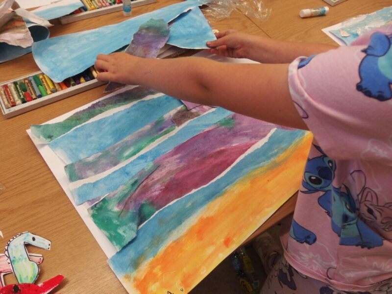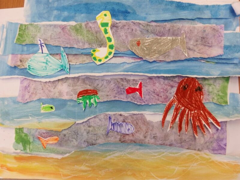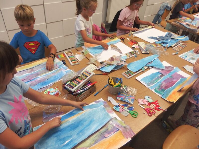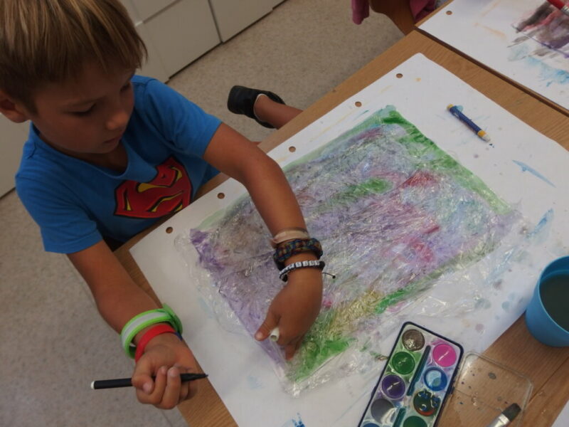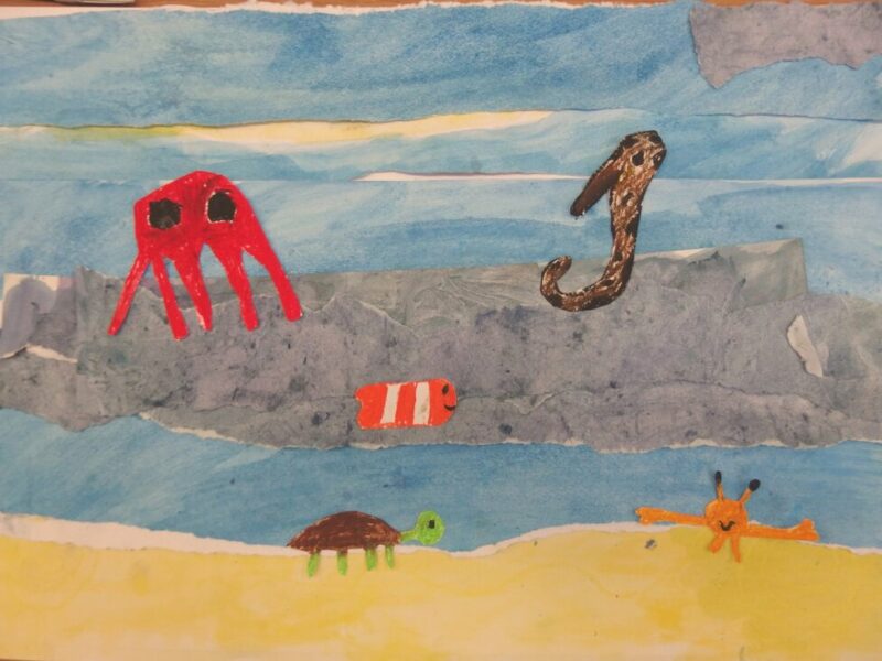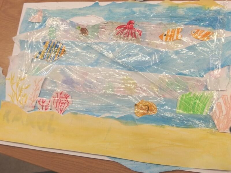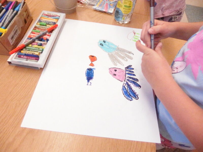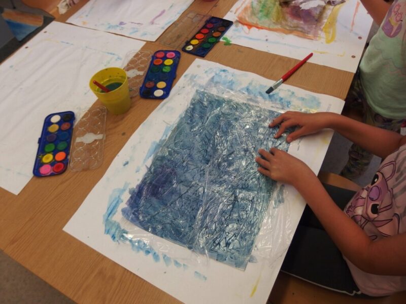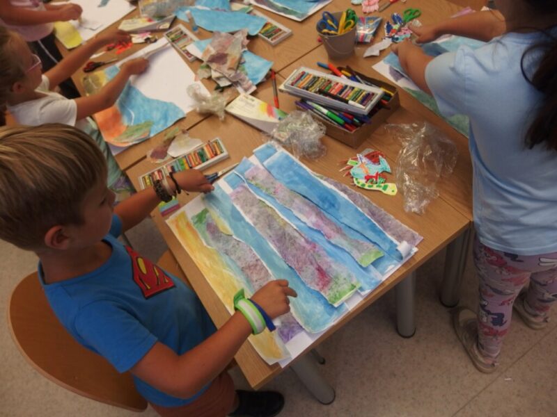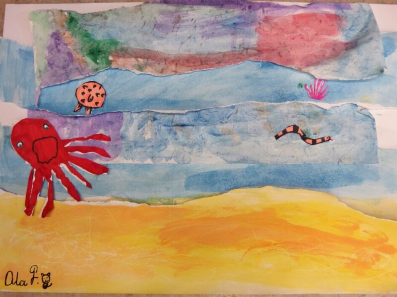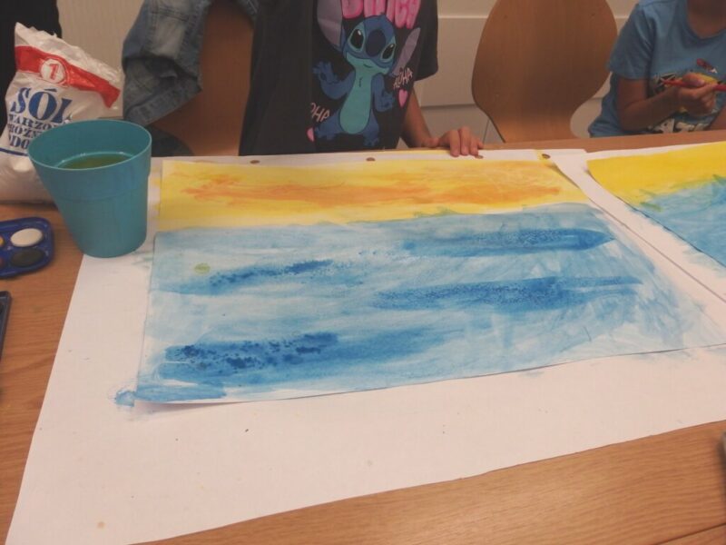 Na kolejnych letnich zajęciach uczestnicy tworzyli podwodny świat. Poprzez zabawę plastyczną z wykorzystaniem dwóch arkuszy papieru, farb akwarelowych, soli, folii spożywczej, kredki świecowej, pasteli, nożyczek i kleju wyczarowaliśmy przepiękne królestwo głębin. Każdy kawałek papieru stawał się elementem oceanu – falą, rybką albo morską rośliną. Nasza kreatywność nie zna granic! 🙂