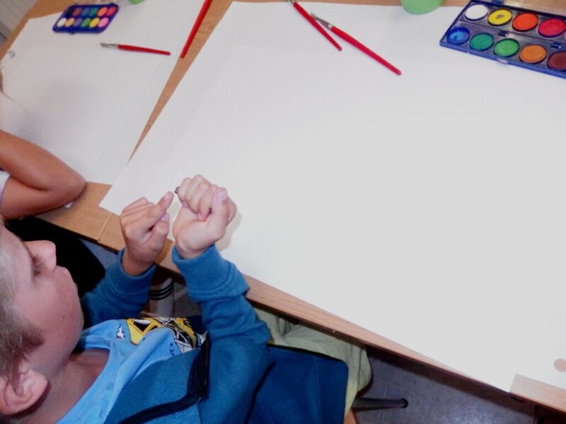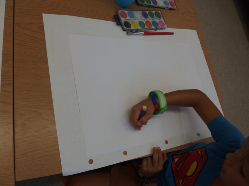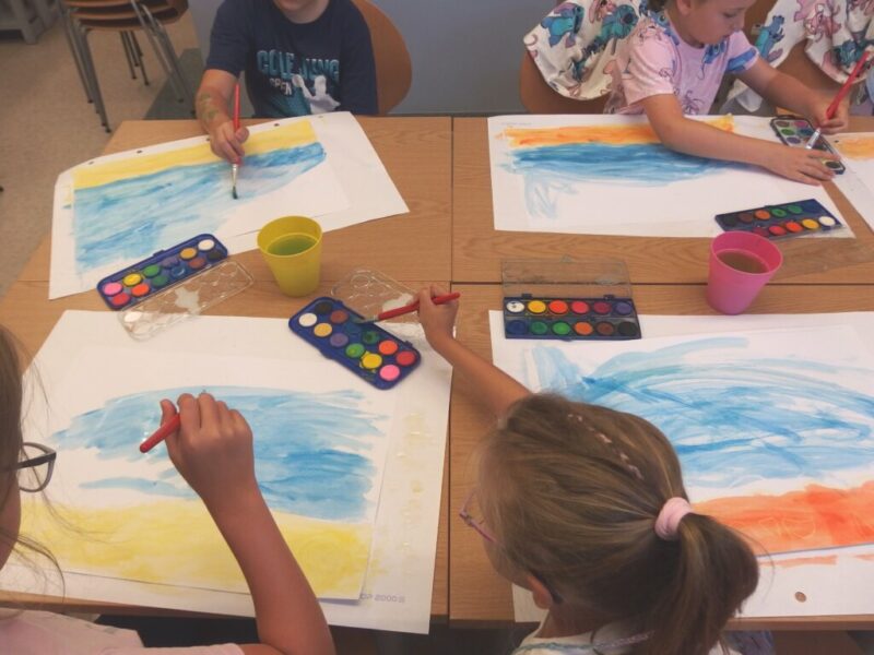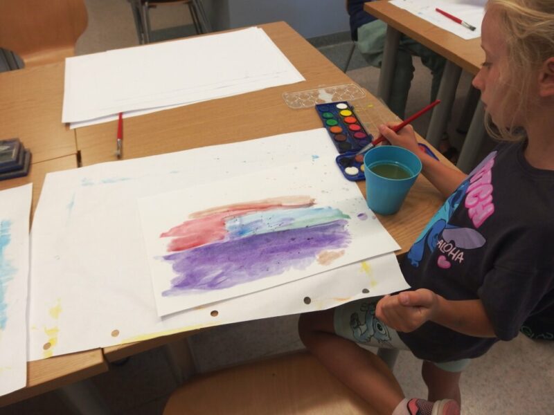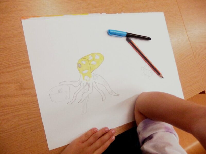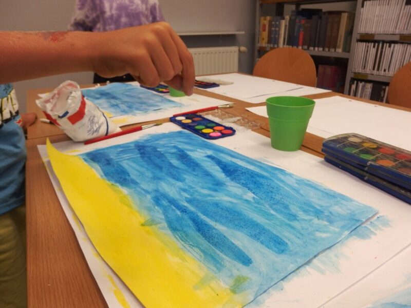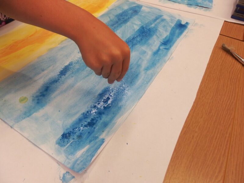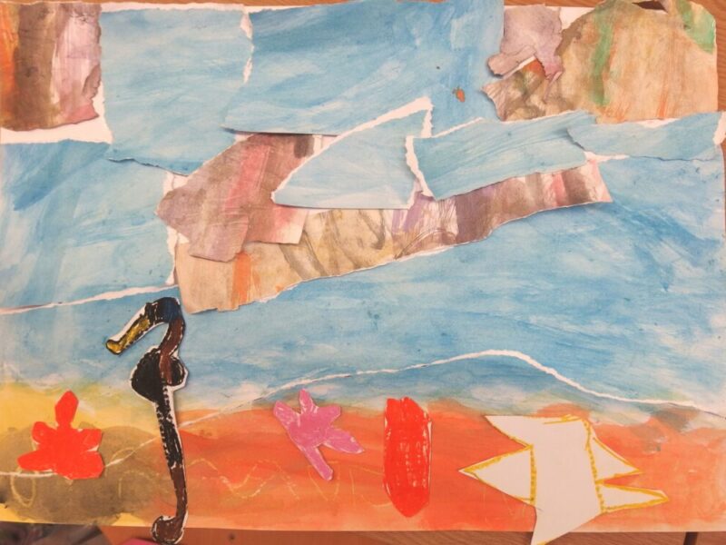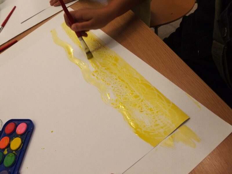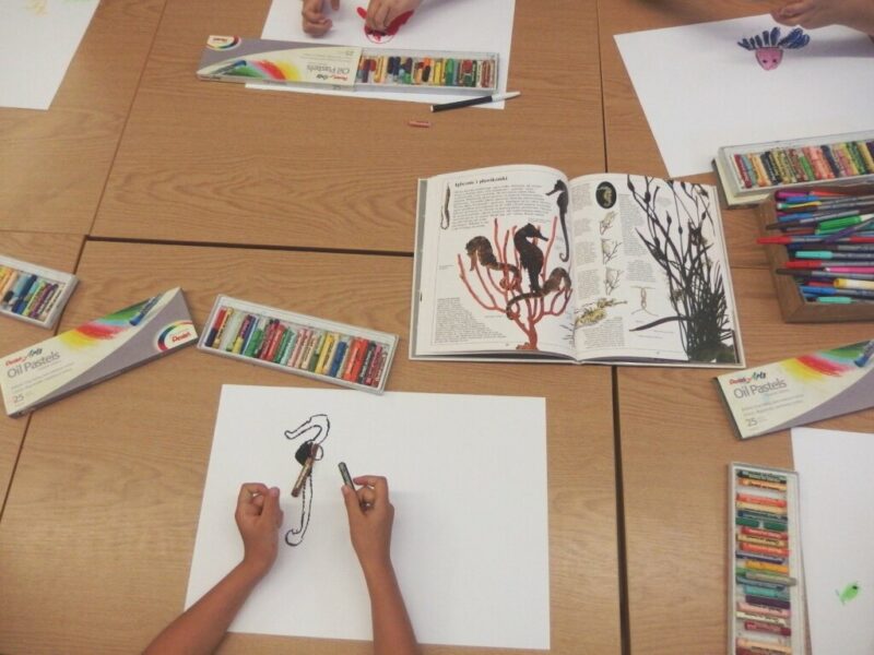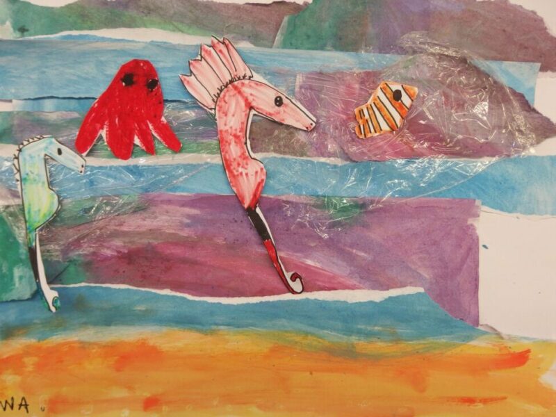 Na kolejnych letnich zajęciach uczestnicy tworzyli podwodny świat. Poprzez zabawę plastyczną z wykorzystaniem dwóch arkuszy papieru, farb akwarelowych, soli, folii spożywczej, kredki świecowej, pasteli, nożyczek i kleju wyczarowaliśmy przepiękne królestwo głębin. Każdy kawałek papieru stawał się elementem oceanu – falą, rybką albo morską rośliną. Nasza kreatywność nie zna granic! 🙂