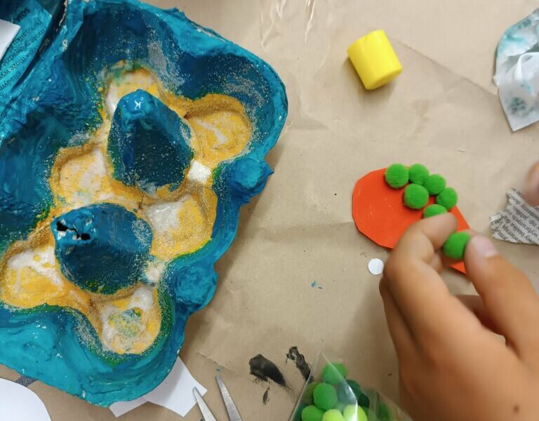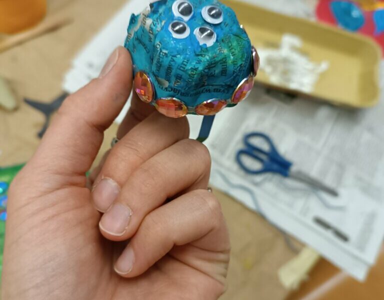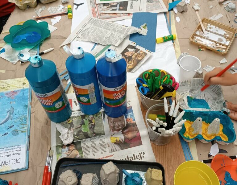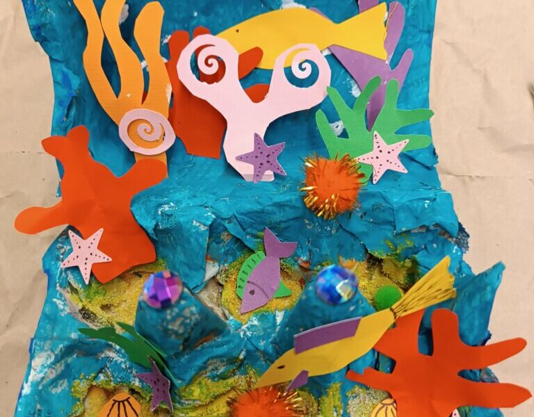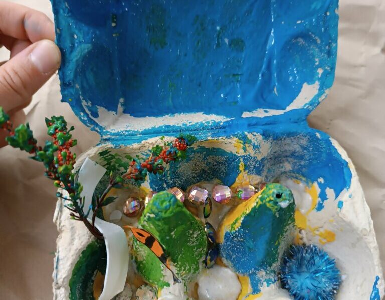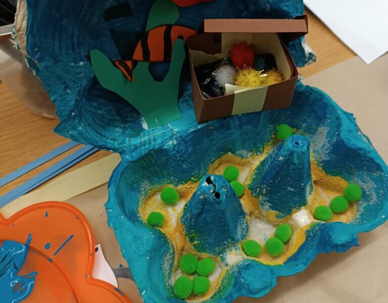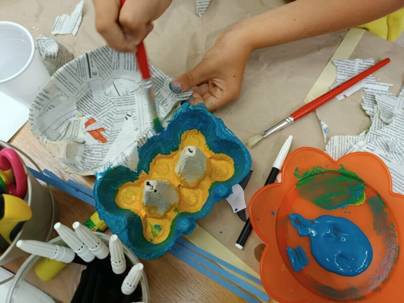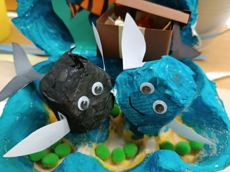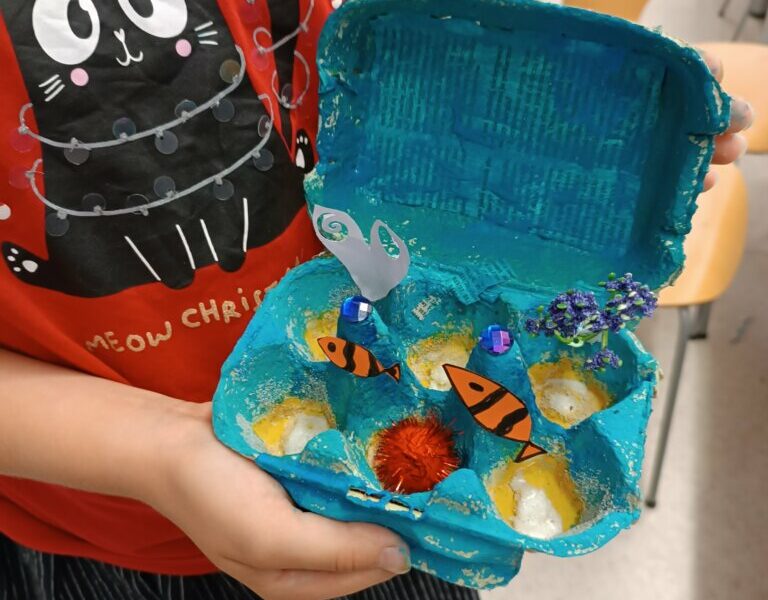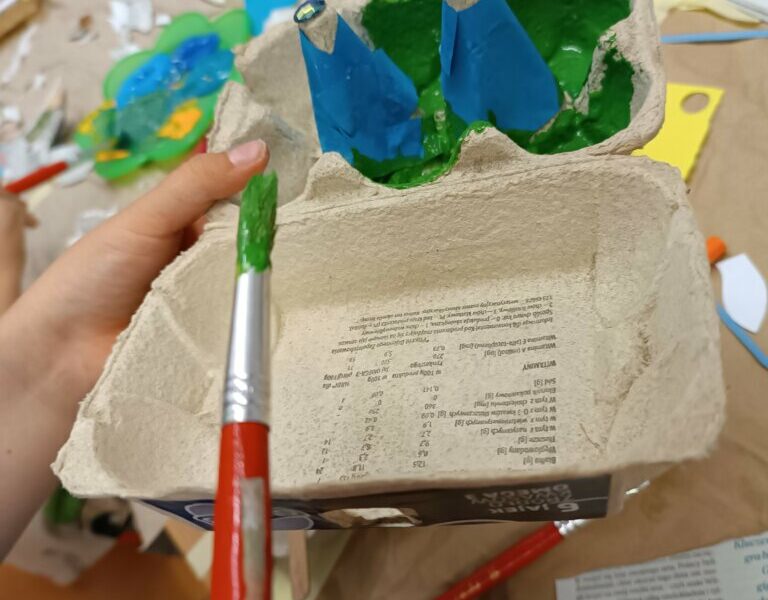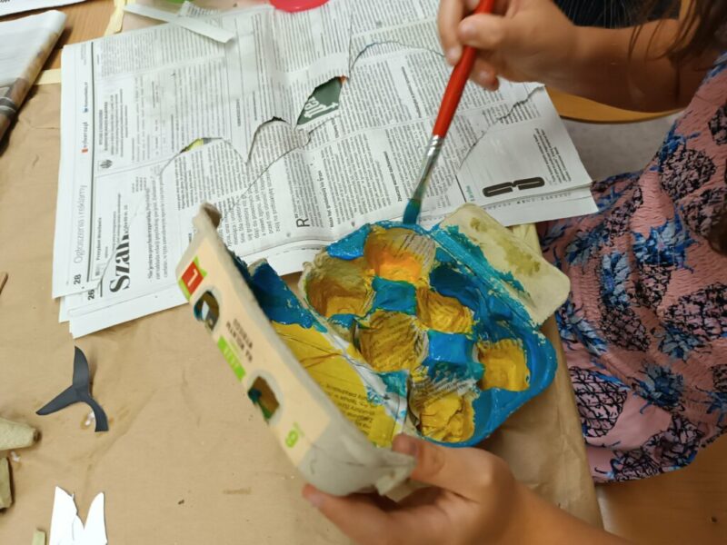 Na zakończenie wakacji zostawiliśmy zajęcia z eko-przesłaniem. Piękne prace plastyczne mogą powstawać i z tego, co już innym niepotrzebne (np. z gazet, wytłoczek od jajek, ścinków papieru i innych). Dzięki naszej wyobraźni i zręcznym (choć przy tym nieco poklejonym :D) palcom, udało się przemienić wytłoczki w wieloryby, orki, meduzy, a w końcu i całe akwaria lub morskie głębiny. Pojawiła się nawet skrzynia ze skarbami! Było przy tym trochę trudności i zabawy, ale i kreatywne spojrzenie na to, co potocznie uważamy za niepotrzebne już odpady. Każdy mały gest się liczy w walce o dobro naszej planety, więc warto wyrabiać w sobie dobre nawyki już od najmłodszych lat.