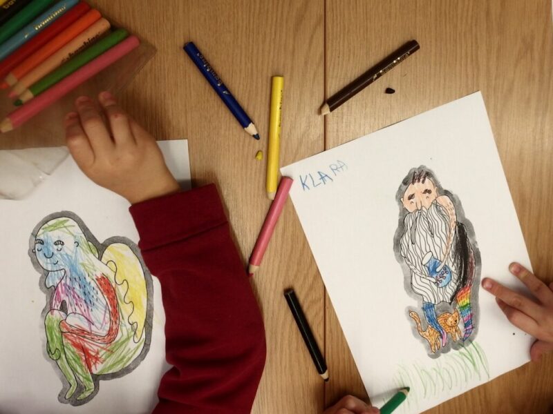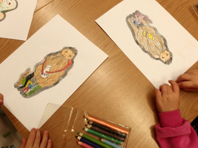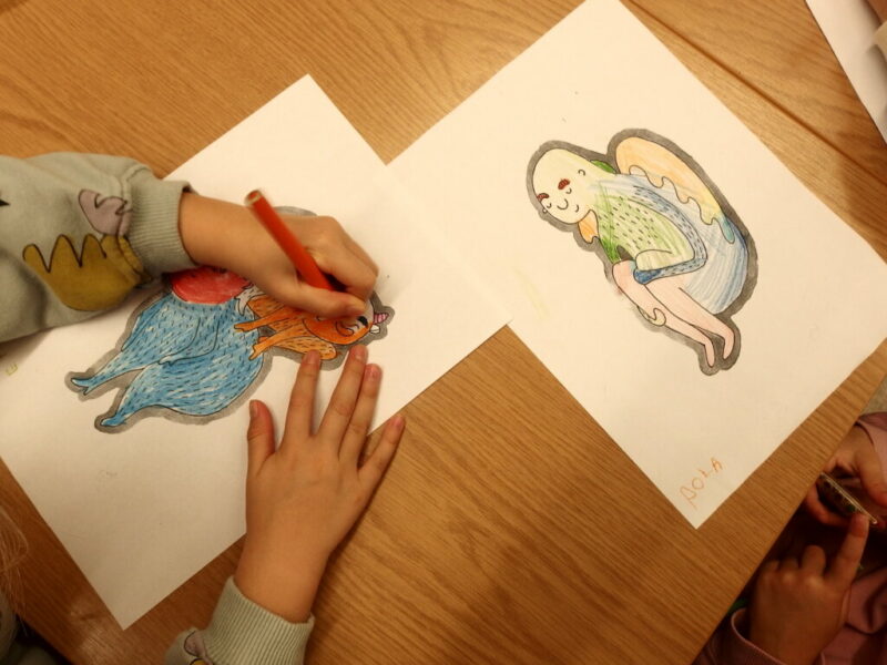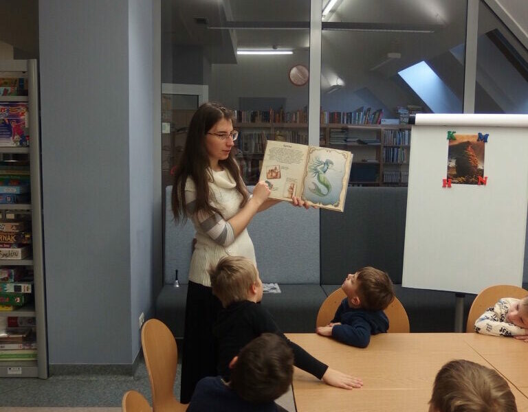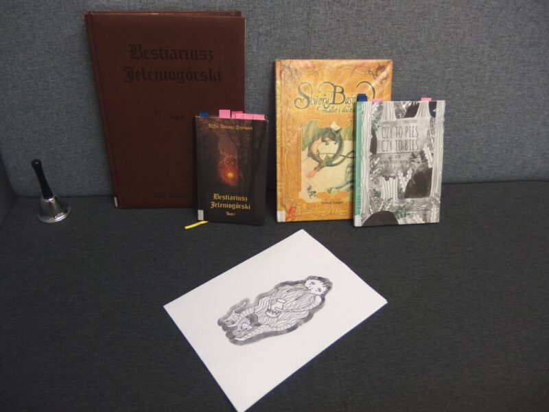 „Myszy” z Niepublicznego Przedszkola „Piątka5” na koniec tygodnia przyszły pomyszkować w naszych półkach.  Dzisiejszym tematem były straszydła Karkonoszy, które odkrywaliśmy na zdjęciach i grafikach Tomasza Szyrwiela ze zbiorów „Bestiariusza Jeleniogórskiego”. Na rozgrzewkę przypomnieliśmy sobie o kilku baśniowych postaciach i stworach mitologicznych, także z nurtów słowiańskich. W tym ostatnim pomogła książka pt. „Czy to pies, czy to bies, czyli zbiór słowiańskich stworów”, z której odczytaliśmy sobie opisy: Plonków, Domowika i Płanetnika. Te dwa duchy opiekuńcze i stwora zwodziciela mogliśmy później artystycznie pokolorować (ilustracje pochodzą ze wspomnianego zbioru). W trakcie kolorowania dzieci odsłuchały opisu tych najsympatyczniejszych spośród Bestii karkonoskich i obejrzały niektóre zamieszczone w „Bestiariuszu” ilustracje osadzone w górskich krajobrazach naszych rodzimych gór.