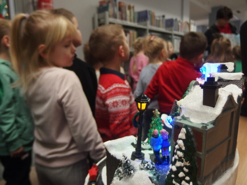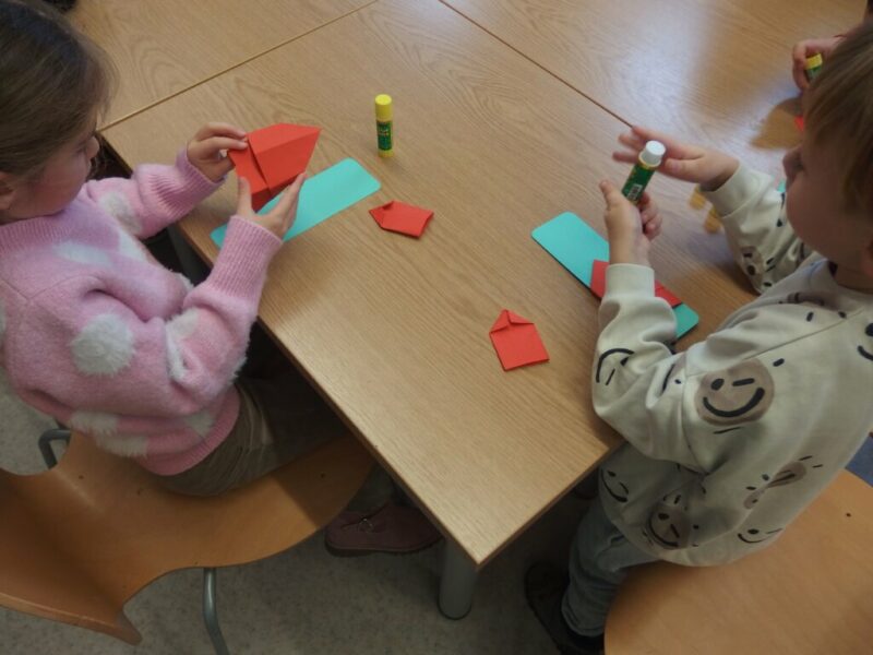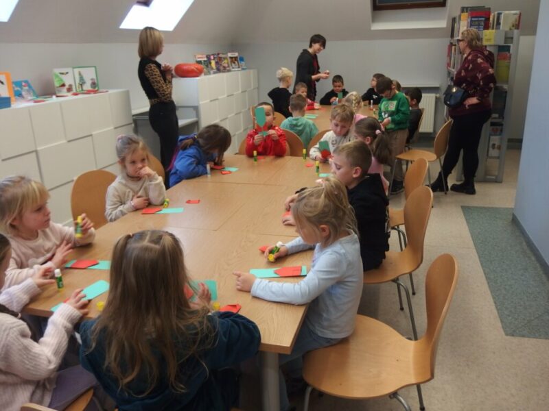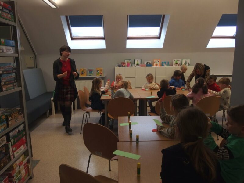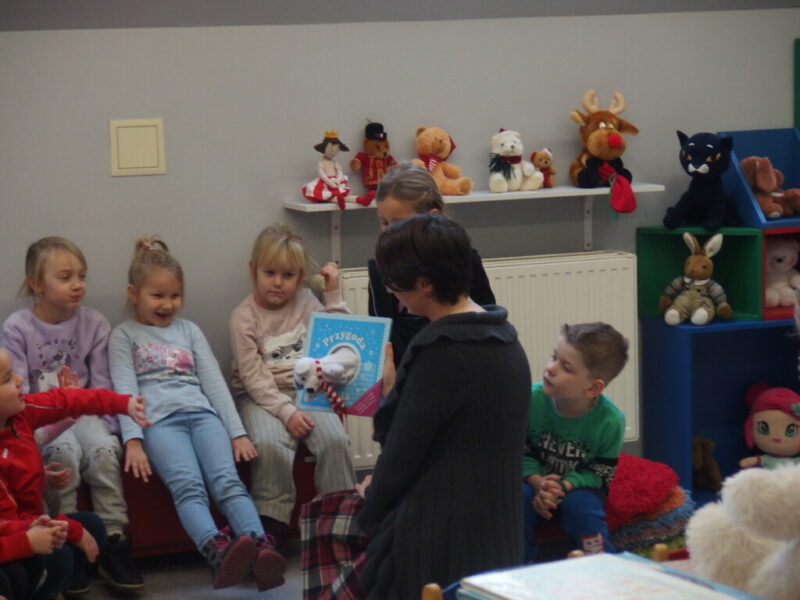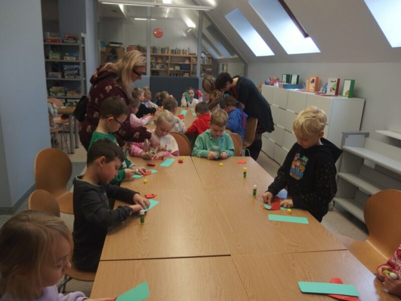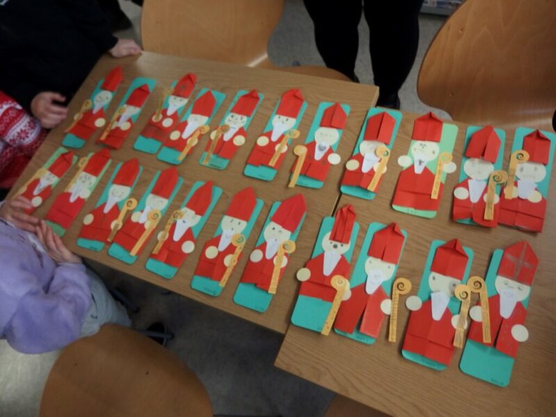 Po obejrzeniu kilku wybranych książek z księgozbioru podręcznego (dźwiękowych, powycinanych, rozkładanych itd.), przyszedł czas na pracę plastyczną. Nim zaczęliśmy składać i wyklejać, poznaliśmy wspólnie fragment książki Elizy Piotrowskiej „Święty Mikołaj z Miry” z serii „Święci uśmiechnięci”, który przybliżył nam nieco dzieciństwo i działalność tego sławnego na cały świat biskupa, a pierwowzoru obecnych czerwono ubranych, jeżdżących saniami Mikołajów. Stąd nasze pamiątkowe zakładki tym razem przedstawiały tę historyczną postać. Zobaczcie sami, czy udało nam się odwzorować jego najbardziej charakterystyczne cechy wyglądu.