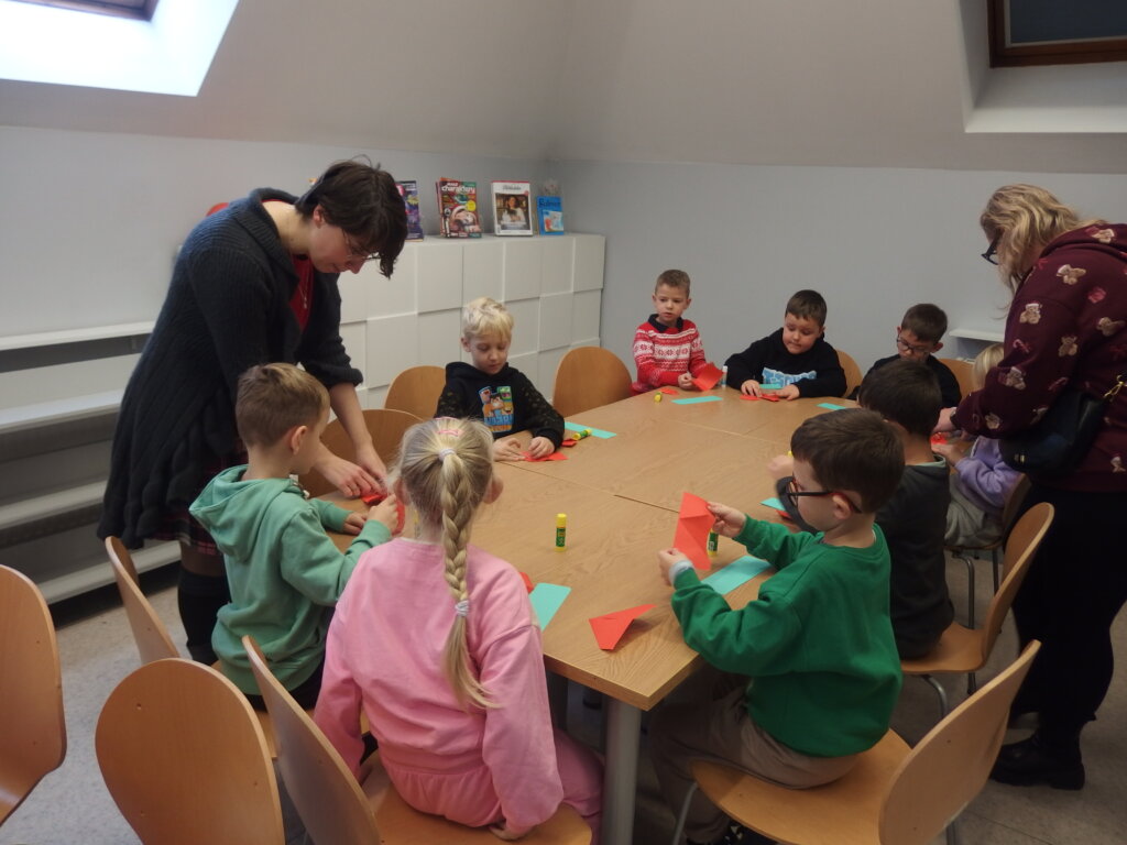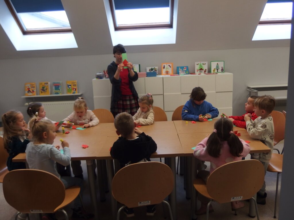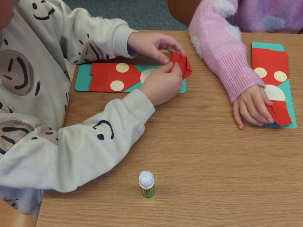 Po obejrzeniu kilku wybranych książek z księgozbioru podręcznego (dźwiękowych, powycinanych, rozkładanych itd.), przyszedł czas na pracę plastyczną. Nim zaczęliśmy składać i wyklejać, poznaliśmy wspólnie fragment książki Elizy Piotrowskiej „Święty Mikołaj z Miry” z serii „Święci uśmiechnięci”, który przybliżył nam nieco dzieciństwo i działalność tego sławnego na cały świat biskupa, a pierwowzoru obecnych czerwono ubranych, jeżdżących saniami Mikołajów. Stąd nasze pamiątkowe zakładki tym razem przedstawiały tę historyczną postać. Zobaczcie sami, czy udało nam się odwzorować jego najbardziej charakterystyczne cechy wyglądu.