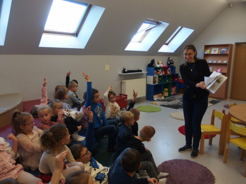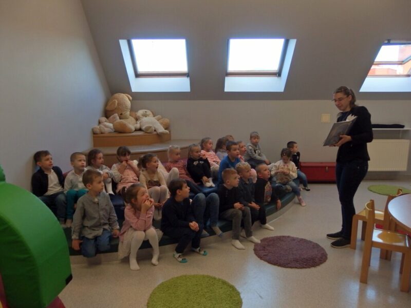 We wtorek przyjechały do nas starszaki z Publicznego Przedszkola nr 1 w Kowarach. Swoją wyprawę zaczęły od przejazdu windą na III piętro, gdzie z uśmiechami czekałyśmy już na ich wizytę. Najpierw wyciągnęłyśmy naszego „asa w rękawie” – książki z katalogu prezencyjnego, czyli te najbardziej rozkładane, głośne, nietypowe czy zawierające dodatkowe elementy. Pokazałyśmy, że wydawane tomy mogą służyć nie tylko do samego czytania i oglądania, ale że istnieją również takie w formie zabawki czy te, dzięki którym można odgrywać teatrzyki.