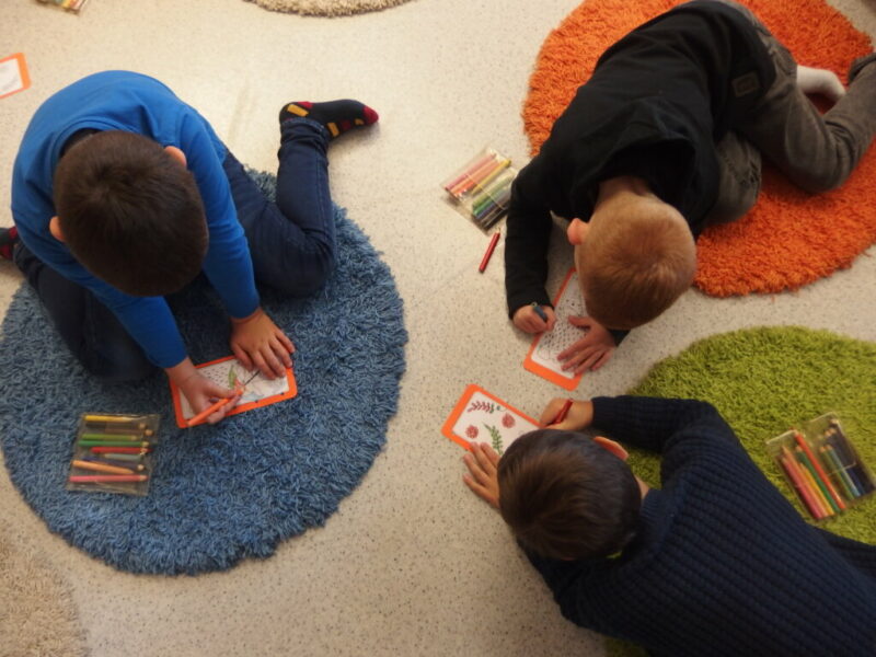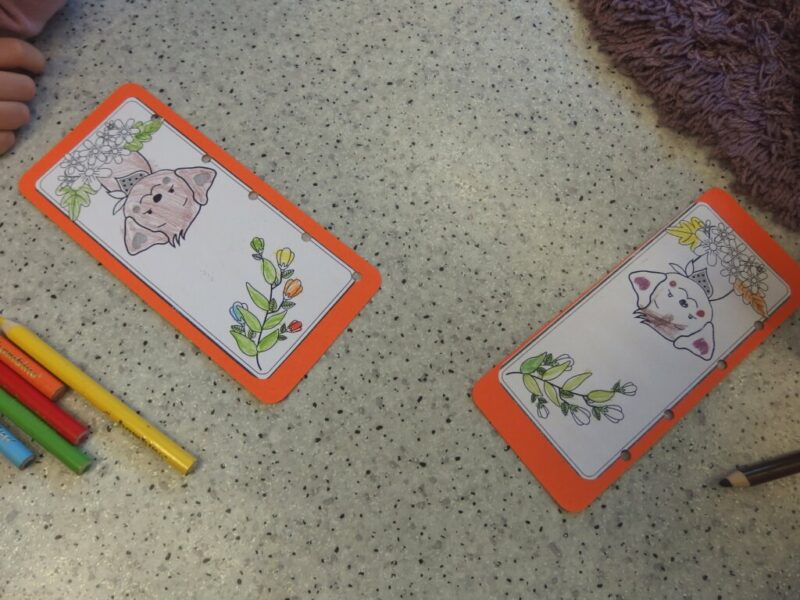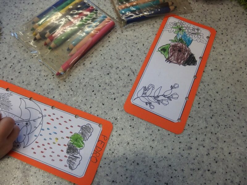 Razem z dziećmi obeszłyśmy wszystkie dostępne dla czytelników zakamarki, pokazując co ciekawsze tomy z półek i chwaląc się naszą wielką kolekcją gier planszowych (prawie 350 tytułów!). Przed plastycznymi bojami poznaliśmy wspólnie treść nieco filozoficznej książki dla dzieci pt. „O chłopcu, który wpadł do książki” Petera Carnavasa. Później przyszła pora na kolorowanie zakładek, które będą przypominać przedszkolakom o ich jeleniogórskiej podróży.