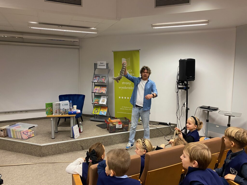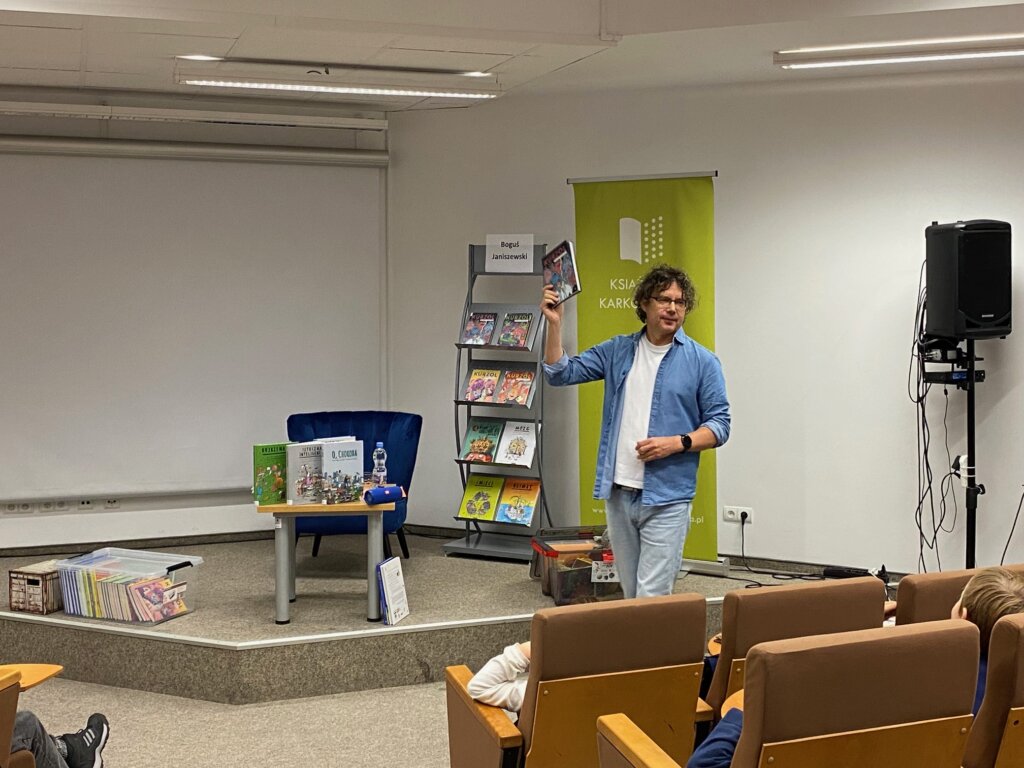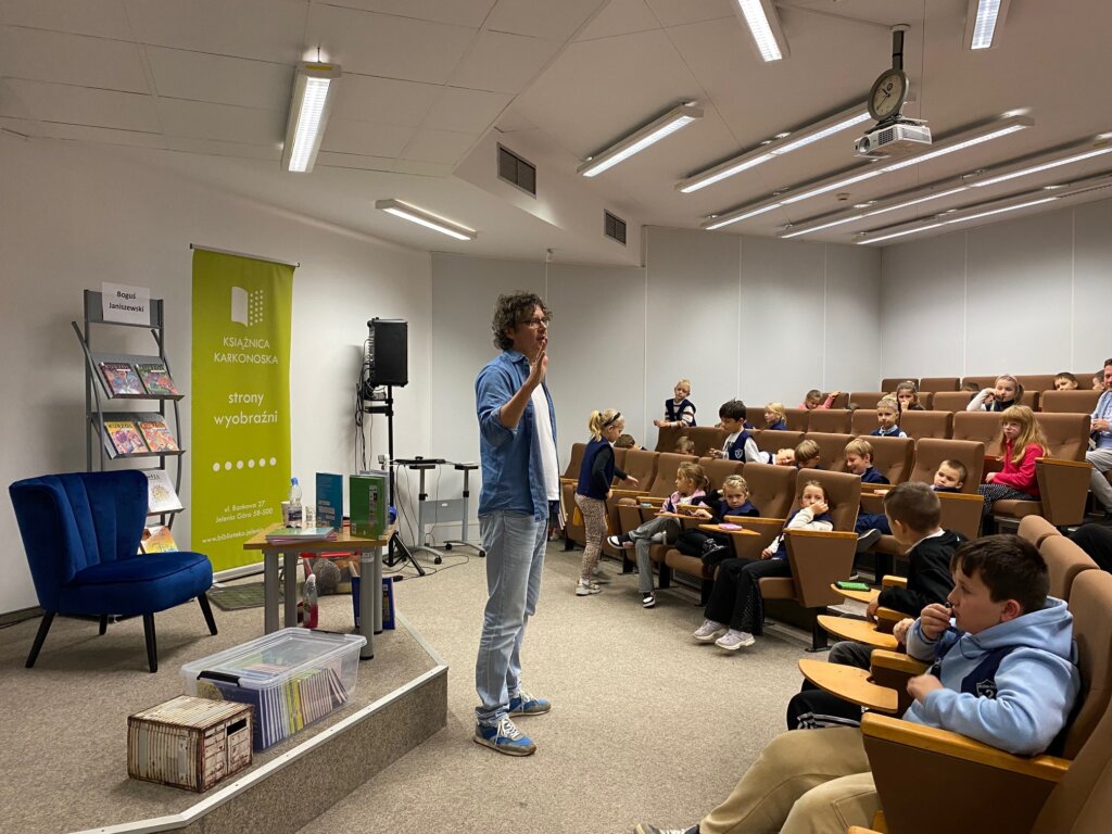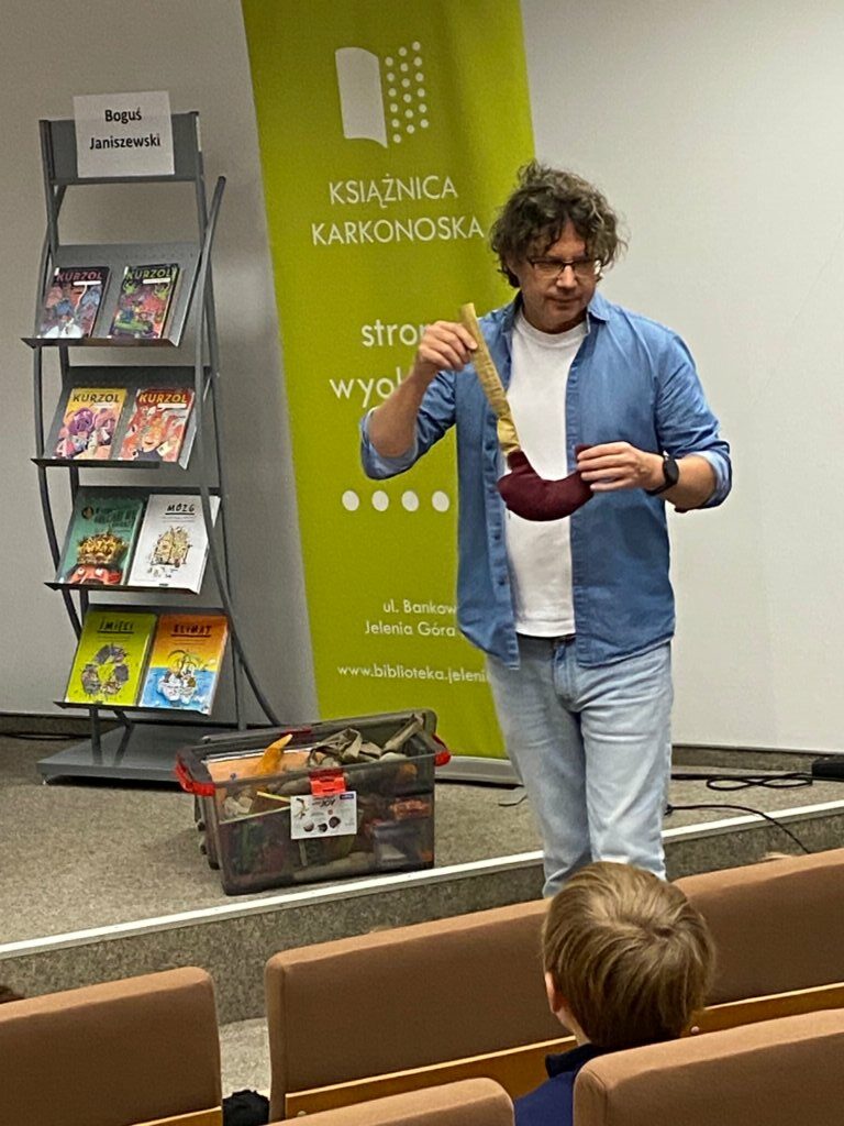 To było naprawdę fantastyczne spotkanie autorskie. Pan Boguś Janiszewski nie tylko w niezwykły i interesujący sposób zachęcał dzieci do czytania, przybliżył im swoją pisarską twórczość, ale też zaprezentował dzieciom wyjątkowo wykonany model układu pokarmowego. Dzięki temu uczestnicy spotkania dowiedzieli się wielu ciekawostek, między innymi poznali rolę przełyku, żołądka, wątroby, jelit, a także mogli sami zmierzyć, za pomocą miarki, długość jelita cienkiego. Autor przedstawił bohatera swoich komiksów – Kurzola, którego fizyczną postać wymyśliła ilustratorka, pani Nikola Kucharska.