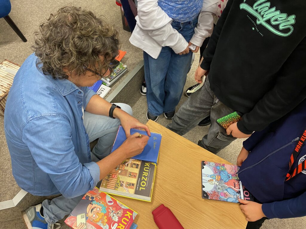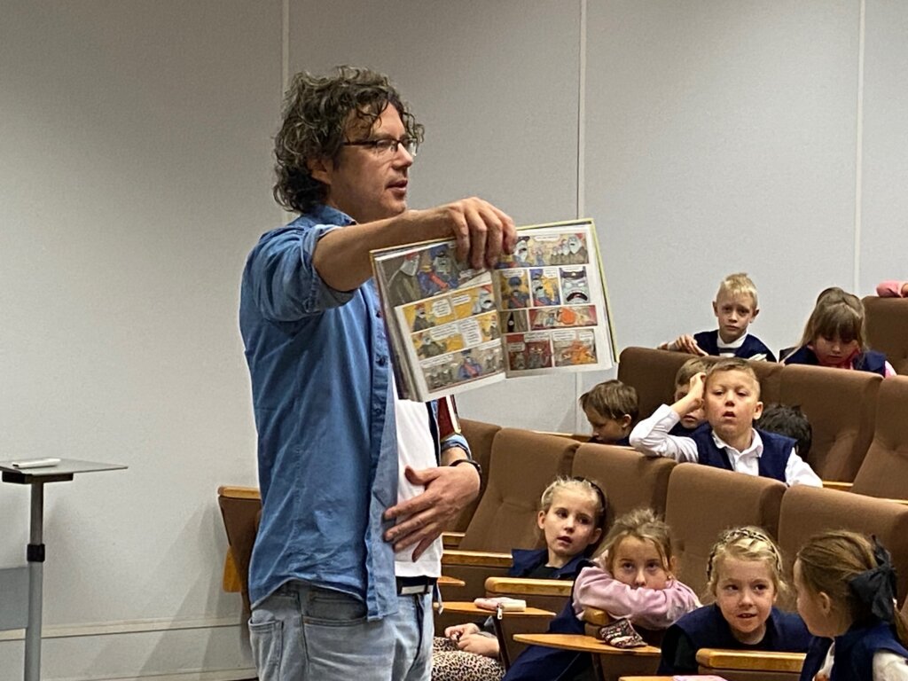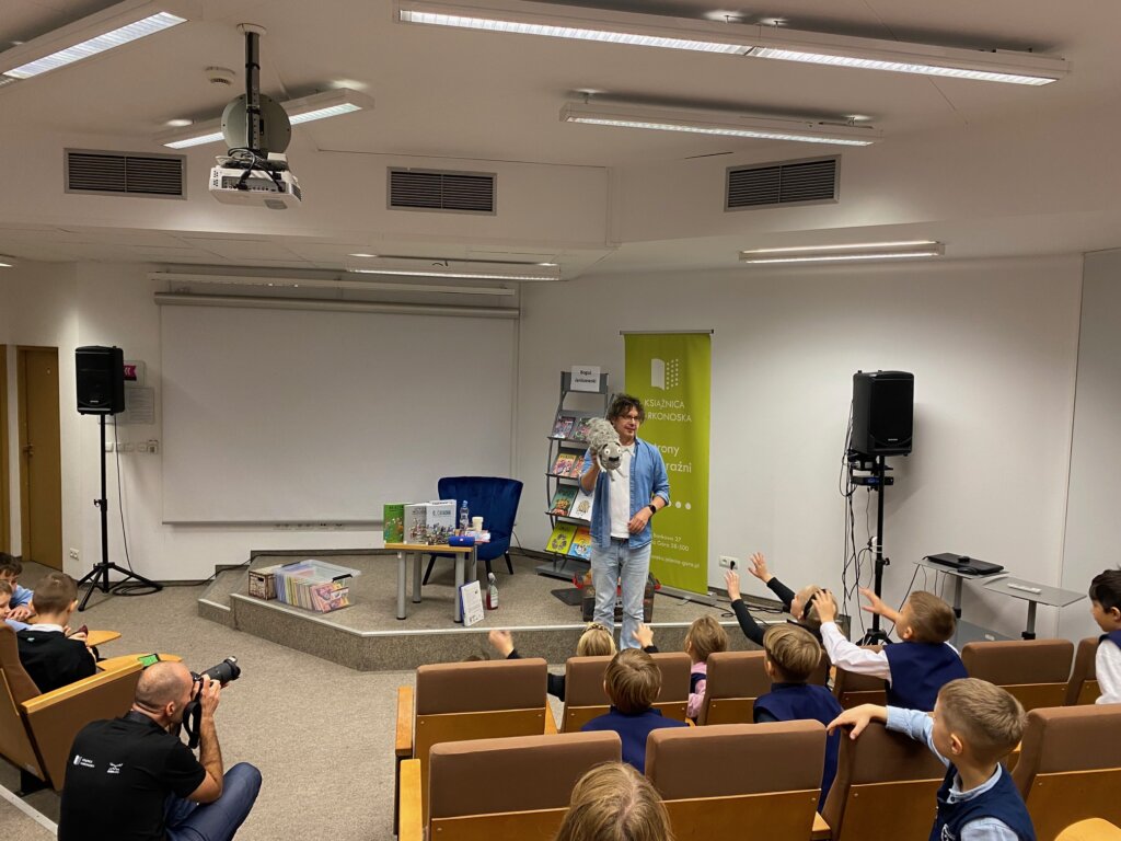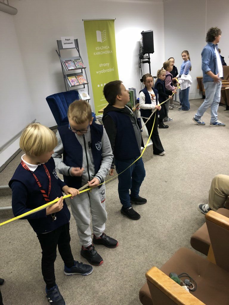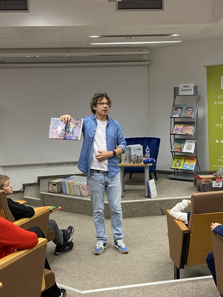 To było naprawdę fantastyczne spotkanie autorskie. Pan Boguś Janiszewski nie tylko w niezwykły i interesujący sposób zachęcał dzieci do czytania, przybliżył im swoją pisarską twórczość, ale też zaprezentował dzieciom wyjątkowo wykonany model układu pokarmowego. Dzięki temu uczestnicy spotkania dowiedzieli się wielu ciekawostek, między innymi poznali rolę przełyku, żołądka, wątroby, jelit, a także mogli sami zmierzyć, za pomocą miarki, długość jelita cienkiego. Autor przedstawił bohatera swoich komiksów – Kurzola, którego fizyczną postać wymyśliła ilustratorka, pani Nikola Kucharska.