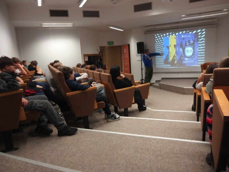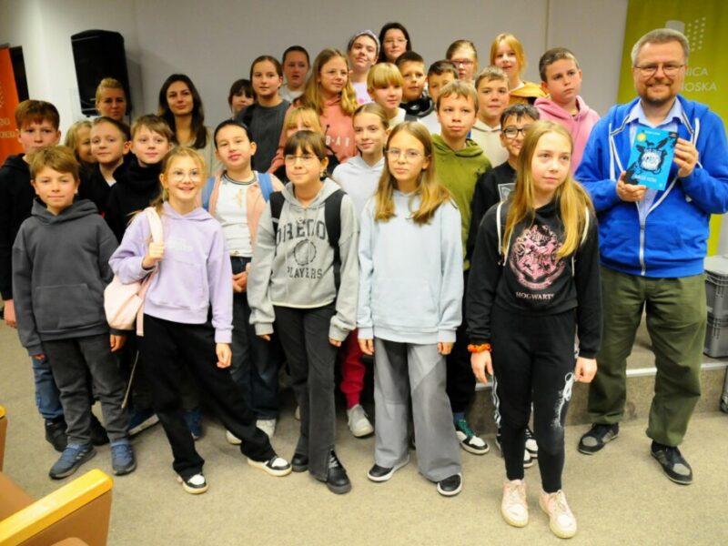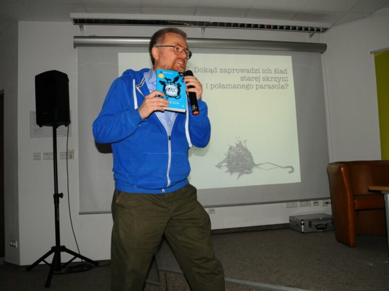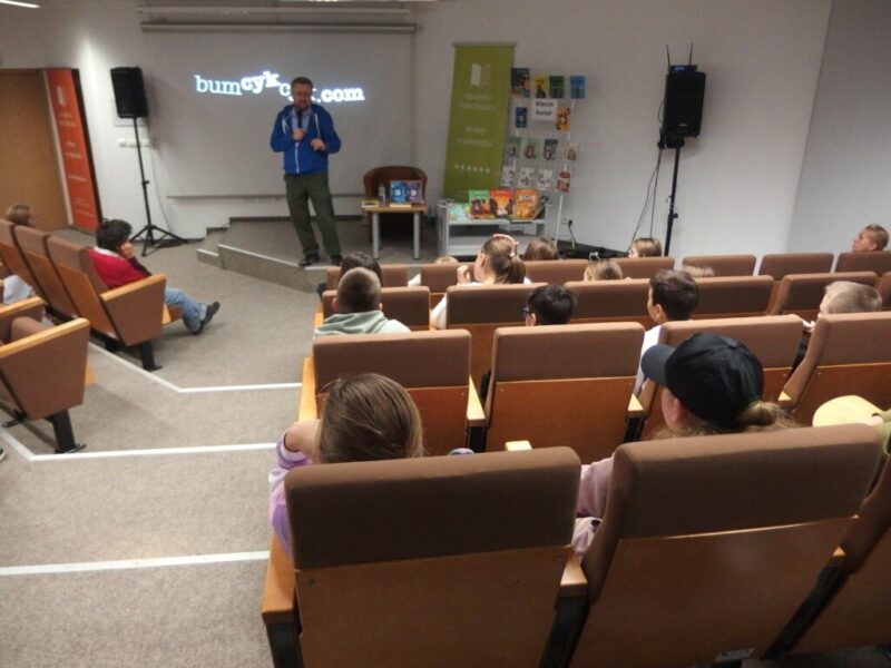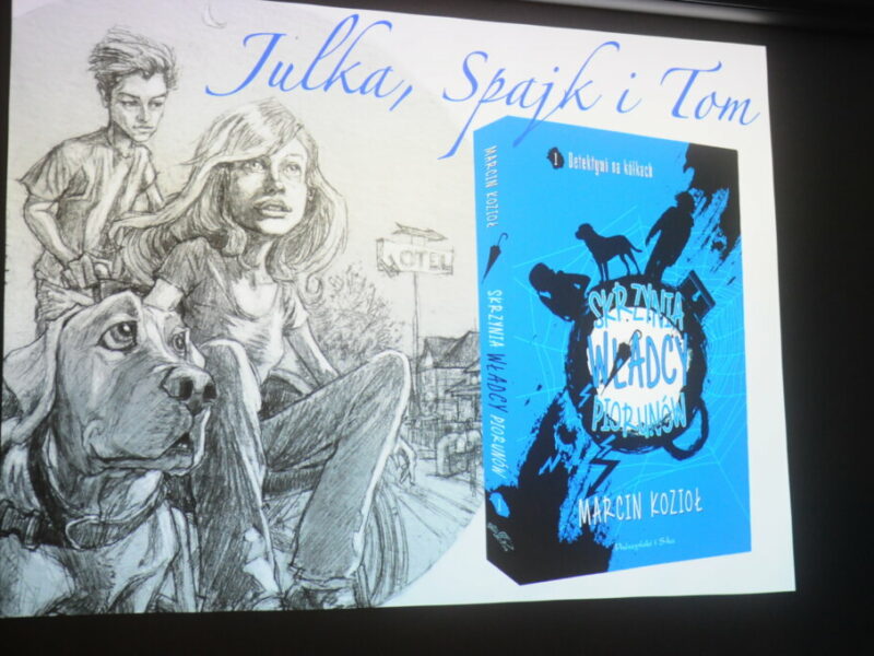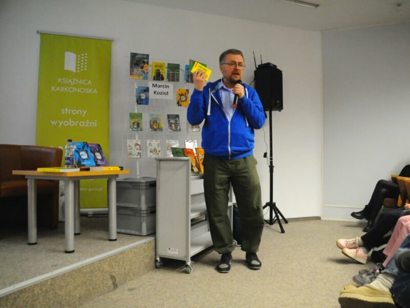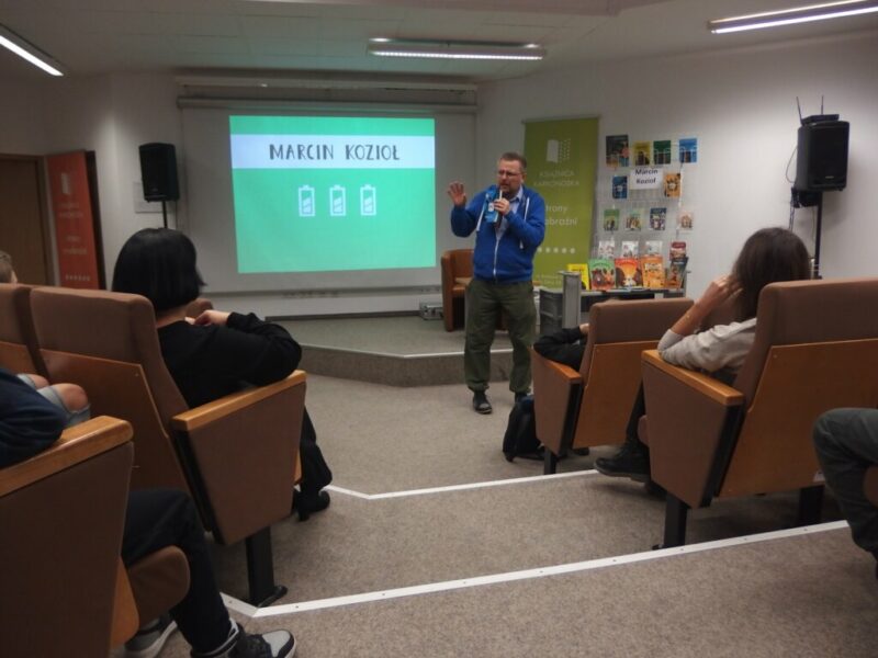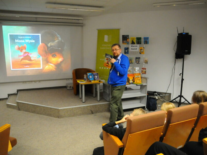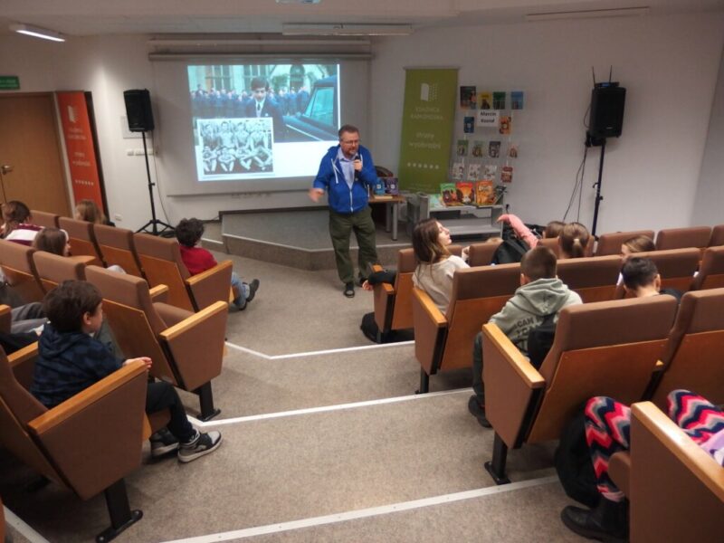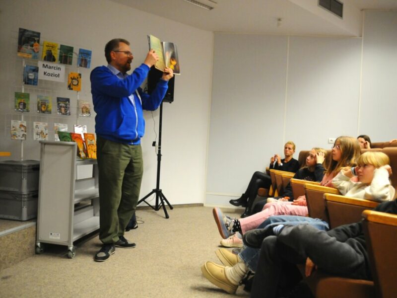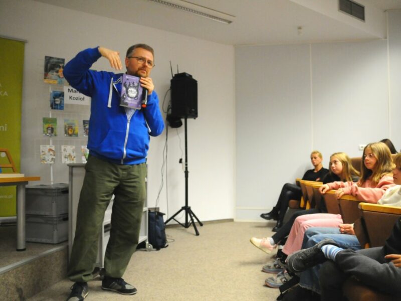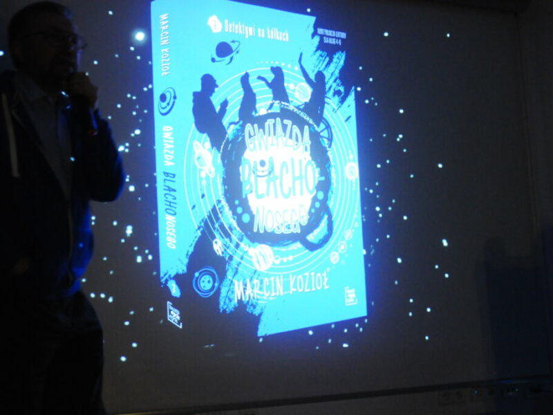 Te i wiele innych ciekawostek mogliśmy dziś poznać, dzięki fascynującemu spotkaniu z pisarzem, zapalonym podróżnikiem i poszukiwaczem dawnych komputerowych technologii – Marcinem Koziołem. Autor książek dla dzieci i młodzieży odwiedził nas 6 listopada, by opowiedzieć o napisanej przez siebie literaturze, szczególnie o serii kryminałów dla młodzieży – „Detektywi na kółkach”. Na spotkanie przyszli uczniowie klas V i VI ze Szkoły Podstawowej nr 10.