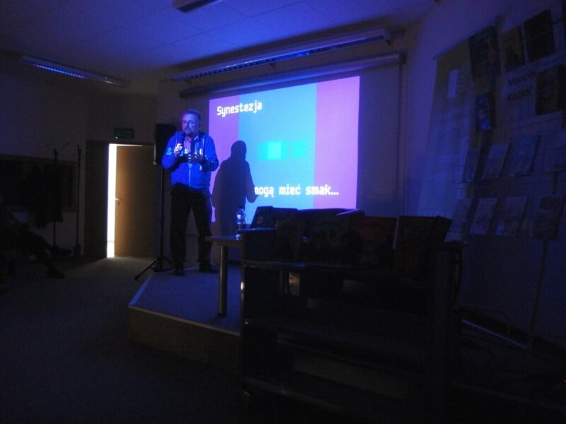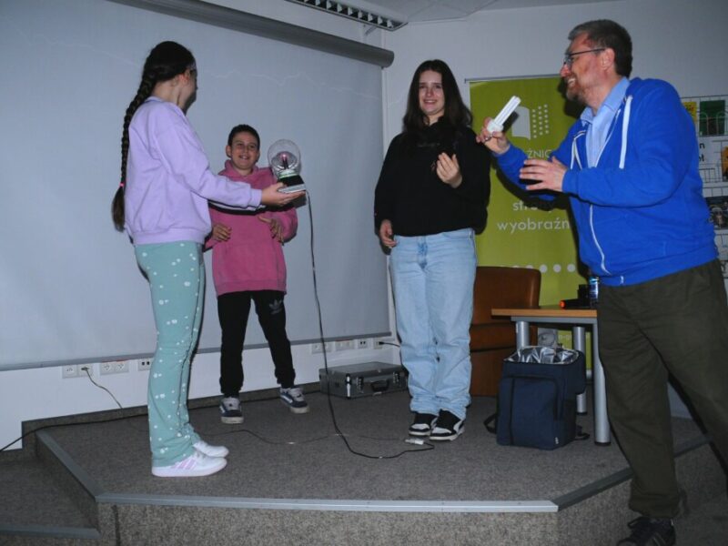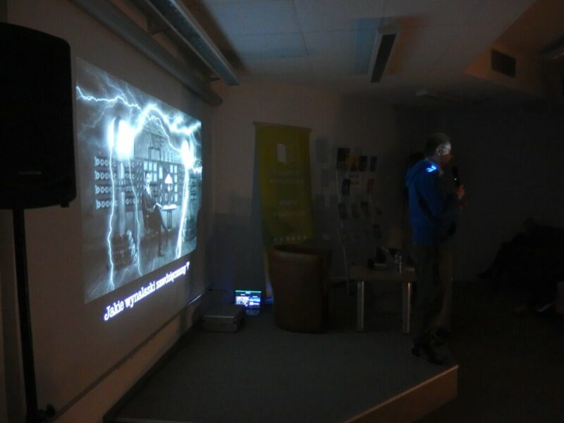 Cóż to była za dynamiczna, pełna filmików i animacji prezentacja! Bo przecież książka, poza dawaniem radości z czytania i zaangażowaniem w fabułę, może przekazywać także wiele faktów z życia znanych lub mniej znanych postaci historycznych i to w taki sposób, by wciągnąć nas w detektywistyczną zagadkę. Dodatkowo ochotnicy mogli doświadczyć na sobie działania cewki Tesli, z bardzo elektryzującym, choć w pełni bezpiecznym, skutkiem, który wywołał spore ożywienie na sali.