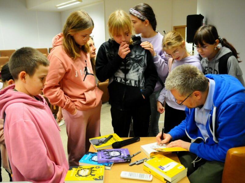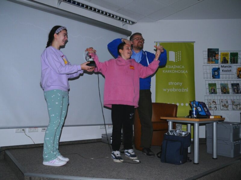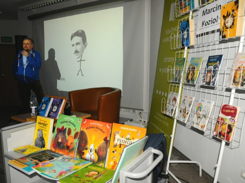 Po kilku pytaniach na koniec spotkania oraz grupowych zdjęciach, zainteresowani mogli zakupić książki autora, a przy tym otrzymać jego autograf. To było interesujące i mocno elektryzujące spotkanie autorskie, które na pewno na długo zapadnie nam w pamięć. Sporo książek Marcina Kozioła (w tym i serię „Detektywi na kółkach”) możecie również wypożyczyć w Bibliotece Dziecięco-Młodzieżowej.