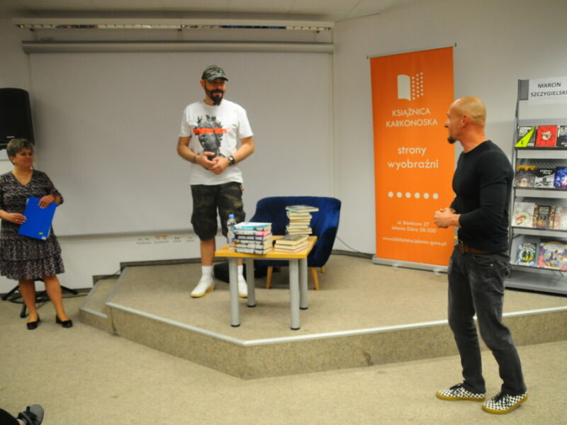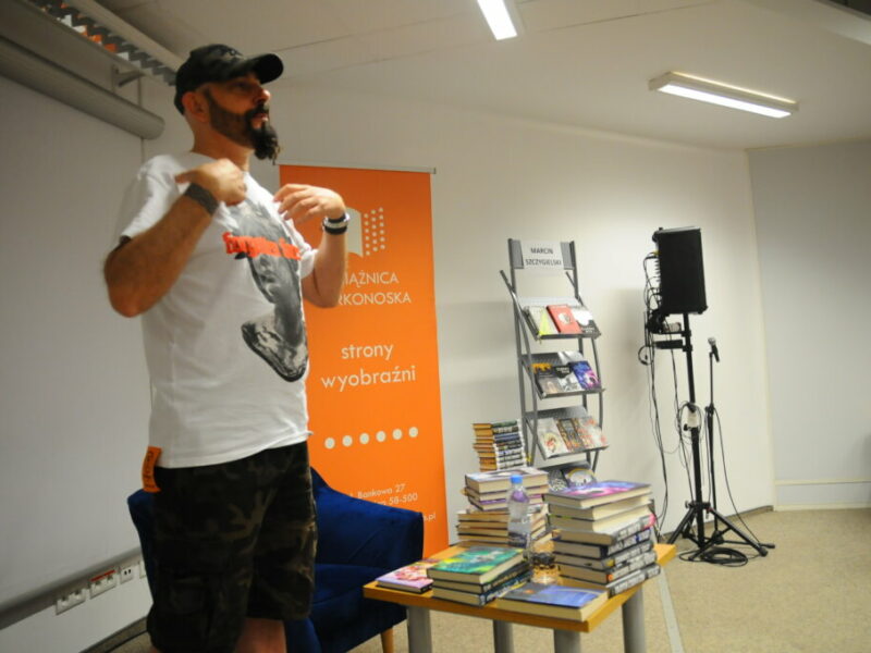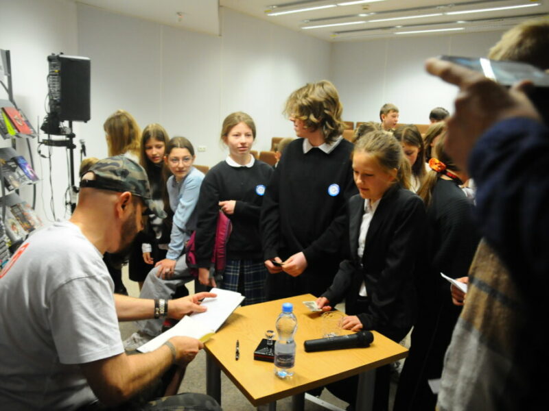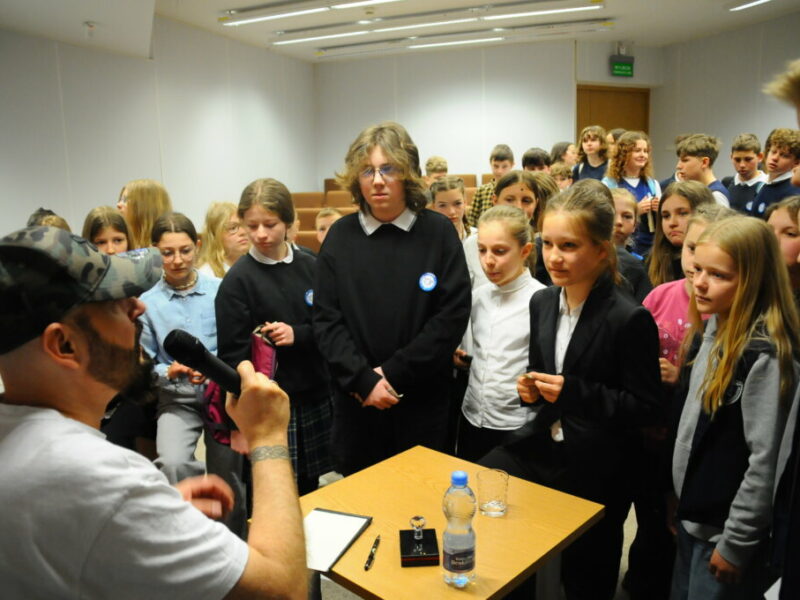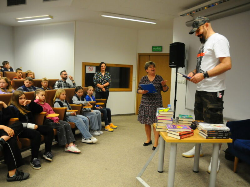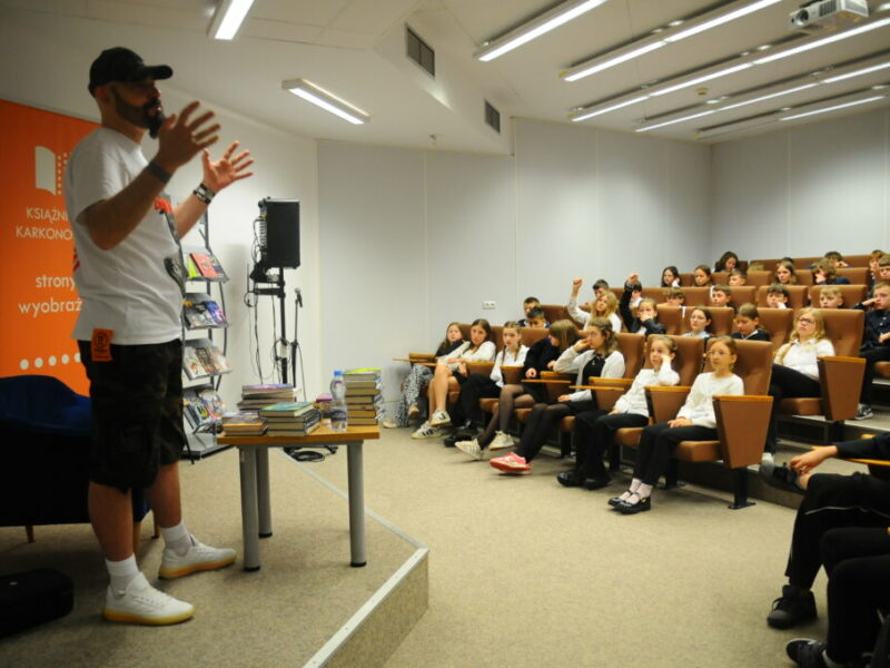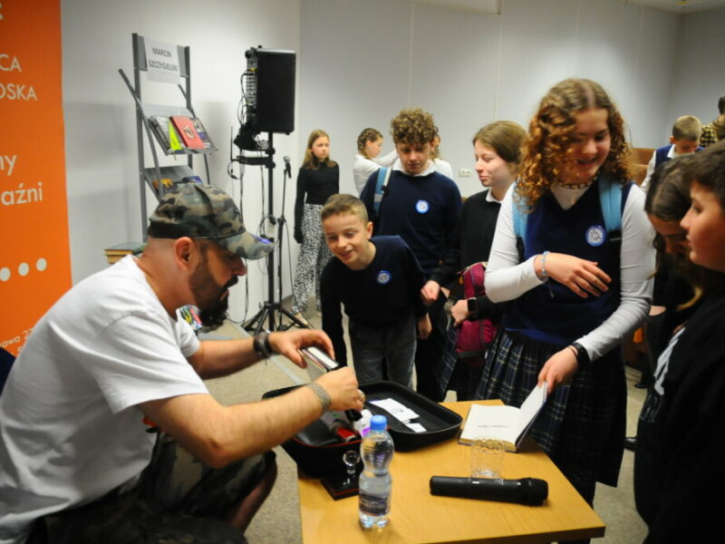 W trakcie spotkania Marcin Szczygielski opowiedział młodzieży o swojej drodze do pisarskiej kariery, zaprezentował swoje książki i przeczytał fragment jednej z nich. Z ogromną cierpliwością odpowiadał uczestnikom na ich pytania. A tych było naprawdę wiele i dotyczyły nie tylko książek! Przy tym autor chętnie rozmawiał z młodymi ludźmi o tym, co ich ciekawi i inspiruje.