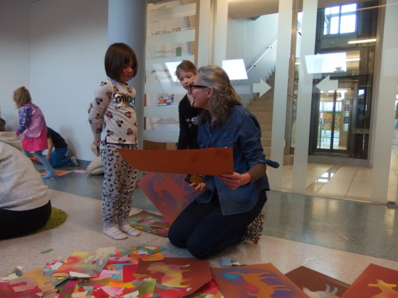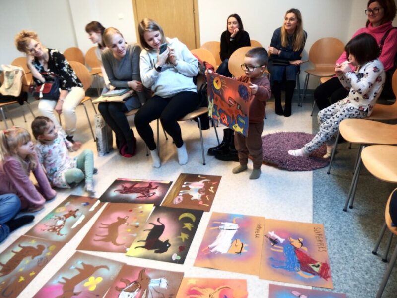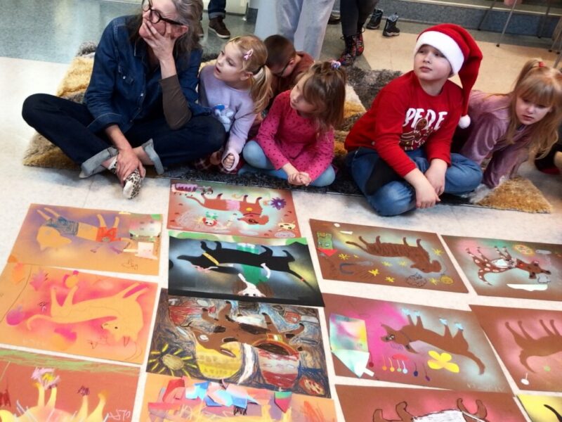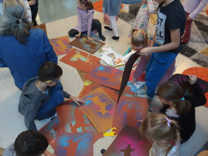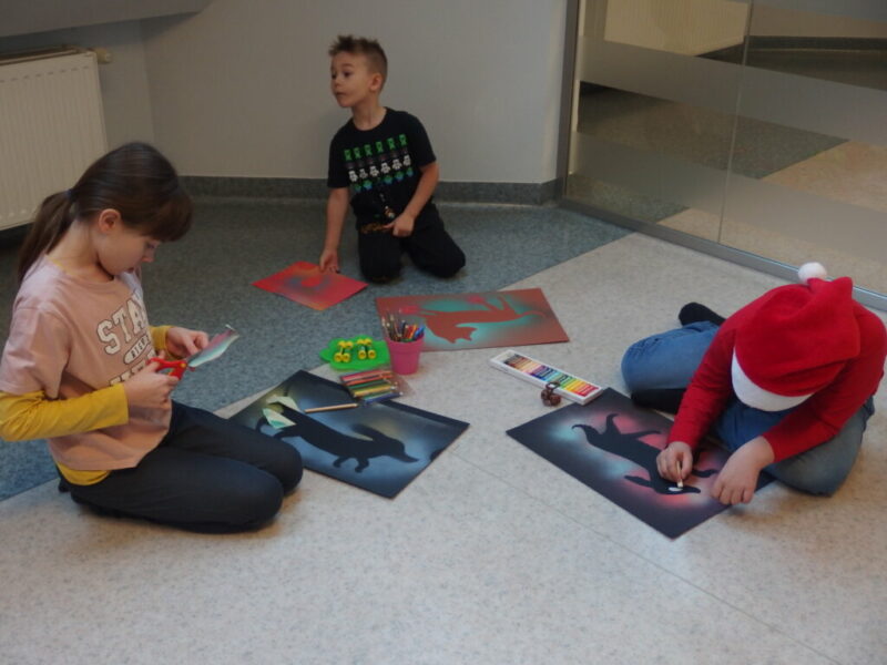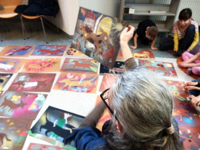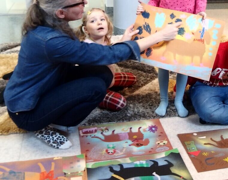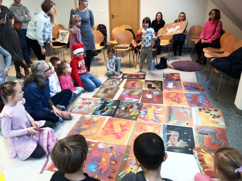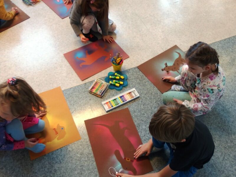 Podczas warsztatów dzieciom towarzyszyły różne psie historie – o psich zwyczajach, marzeniach , a nawet o psich snach! Na podstawie tych rozmów dzieci tworzyły ilustracje przedstawiające wyśnione marzenia czworonogów. Dzieci nadawały imiona swoim bohaterom, wymyślały tytuły snów, a na zakończenie opowiadały wyśnione przez sportretowane psiaki opowieści. Było jak we śnie – niezwykle, kolorowo i przygodowo.