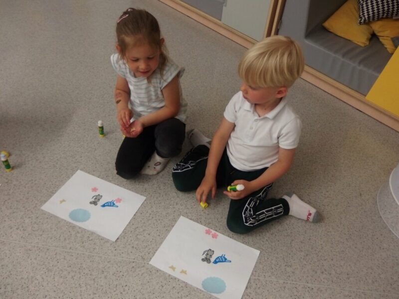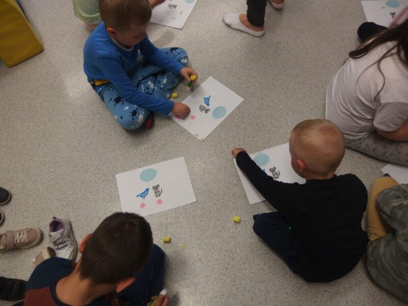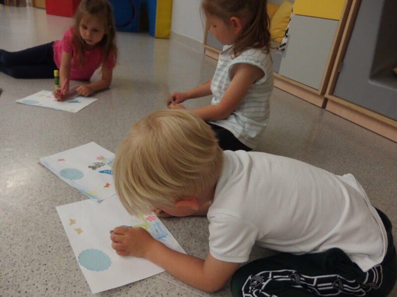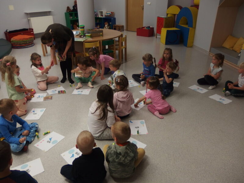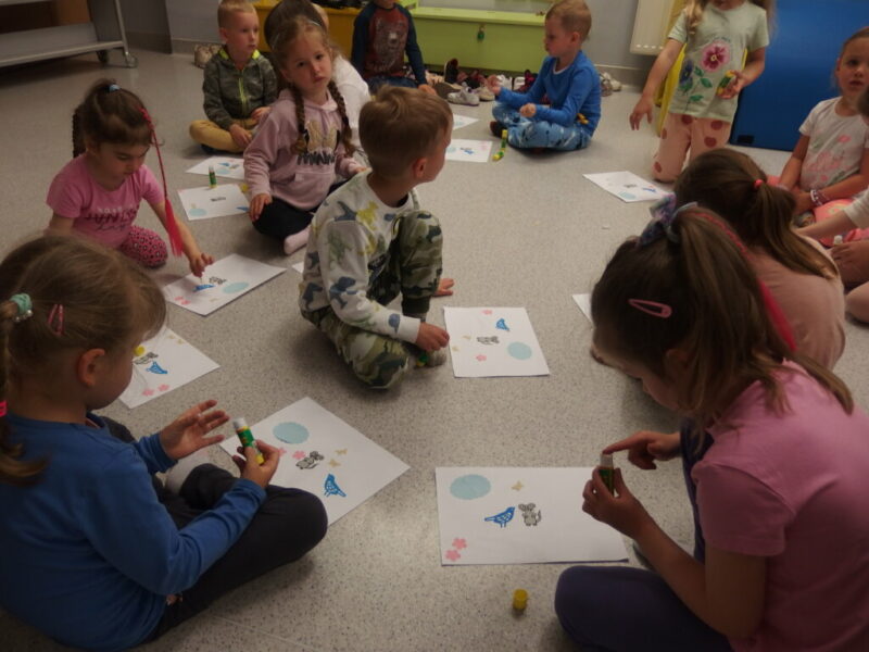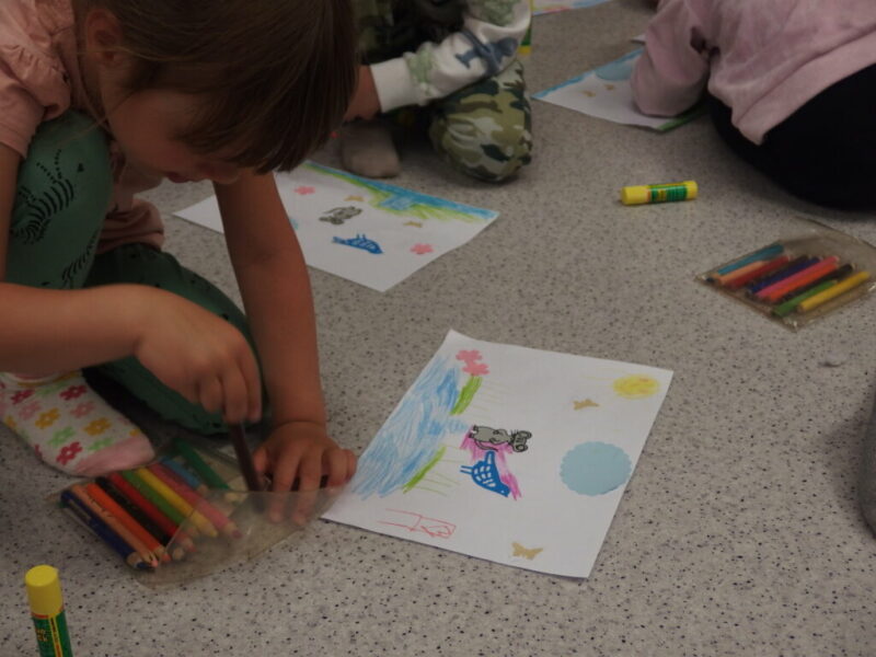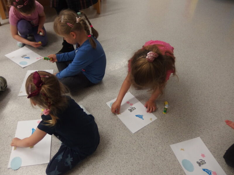 W dalszej części zajęć dzieci obejrzały i z uwagą wysłuchały papierową opowieść o myszce Pipi, która ruszyła w drogę, by odwiedzić swojego przyjaciela Ćwirka… By później stworzyć własną ilustrację do tej książki! Klejenie, rysowanie, dodawanie własnych pomysłów (takich jak krzesełka, baloniki w kształcie serduszek itp.), a na koniec twórcze prace, które można obejrzeć na dołączonych zdjęciach. Dzieci dostały swoje dzieła na pamiątkę, więc mamy nadzieje, że będą one im przypominały o tej wizycie i że te radosne, roześmiane przedszkolaki powrócą do nas z rodzicami, by założyć karty biblioteczne i korzystać z bogatych zbiorów naszej biblioteki.
