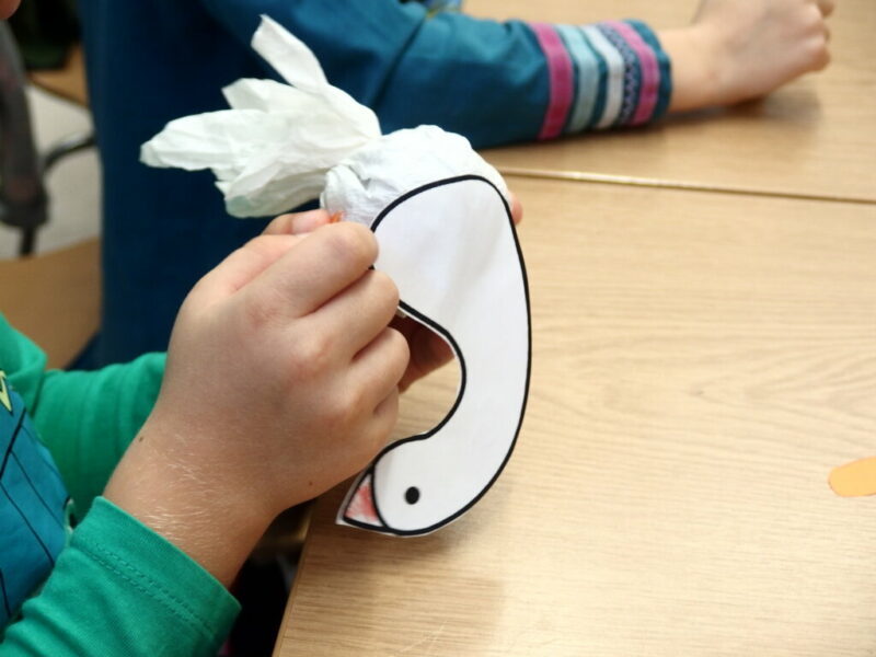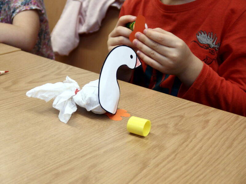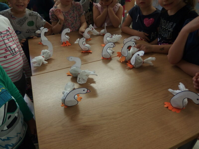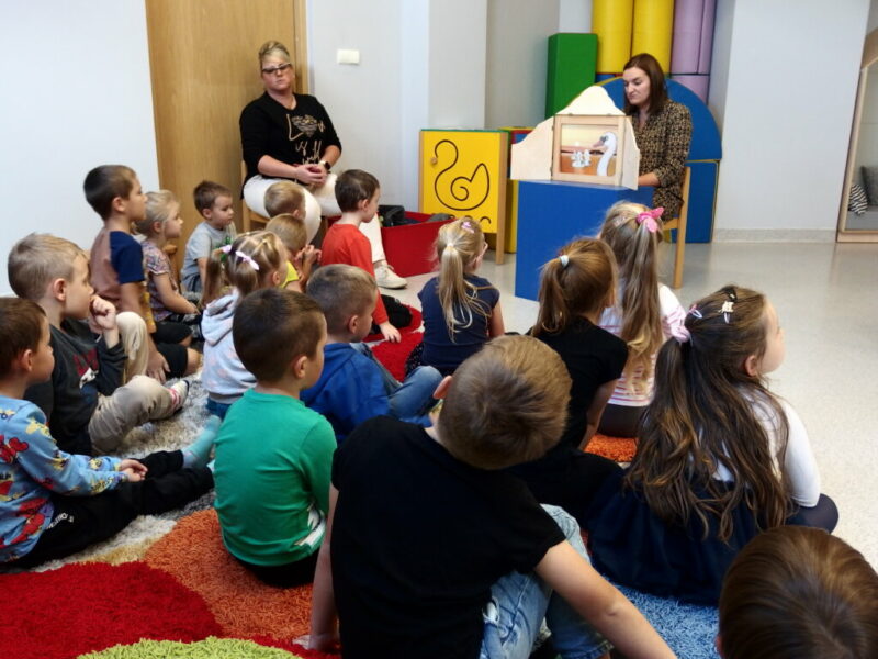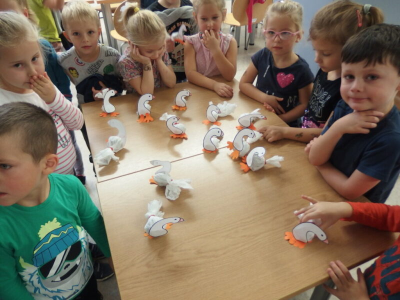 Na dzisiejszych zajęciach dzieci z Miejskiego Przedszkola nr 2 w Jeleniej Górze poznały teatr ilustracji -Kamishibai. Wysłuchały i obejrzały baśń o Brzydkim kaczątku, łabędziątku, które wykluwa się z jaja wysiedzianego przez kaczkę. Z powodu swojej odmienności, bohater zostaje odrzucony i opuszcza rodzinne podwórko. Brzydkie kaczątko nie znajduje nigdzie przychylności, aż do momentu, gdy odkrywa, że jest pięknym łabędziem. Po wysłuchaniu opowieści rozmawialiśmy o dobrych i złych zachowaniach wobec drugiej osoby, a także o obecnej porze roku – jesieni. Na zakończenie spotkania dzieci wykonały piękne łabędzie.