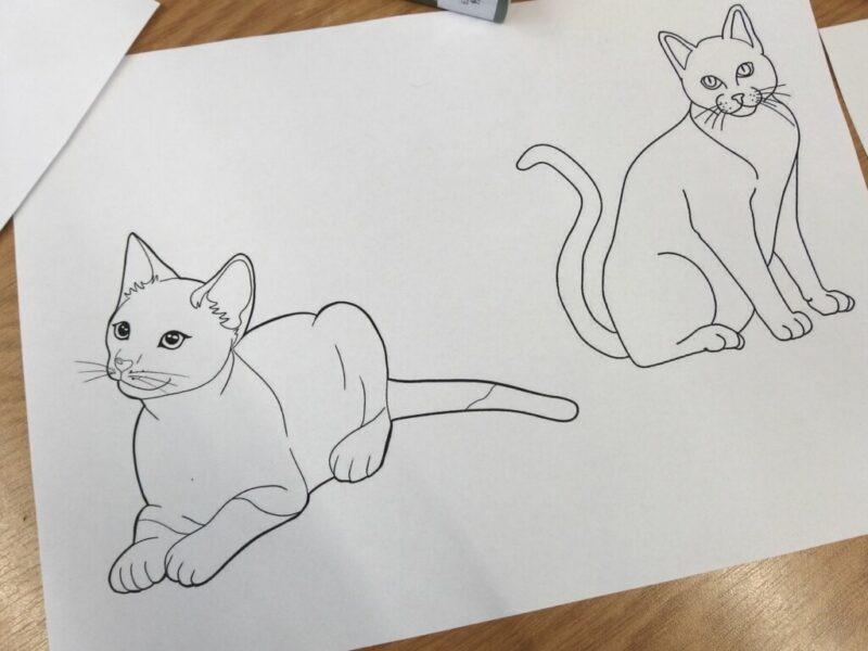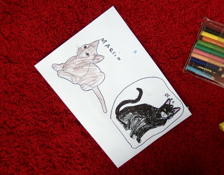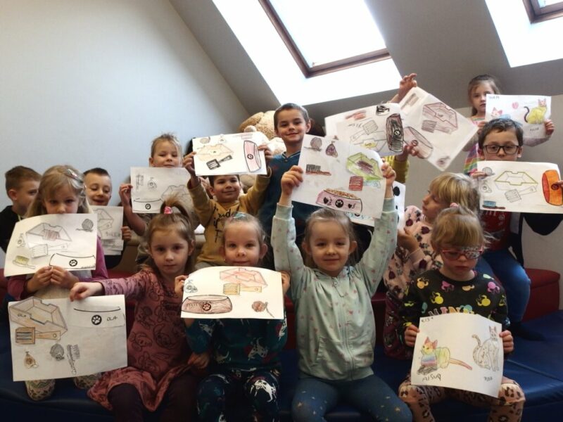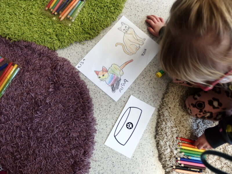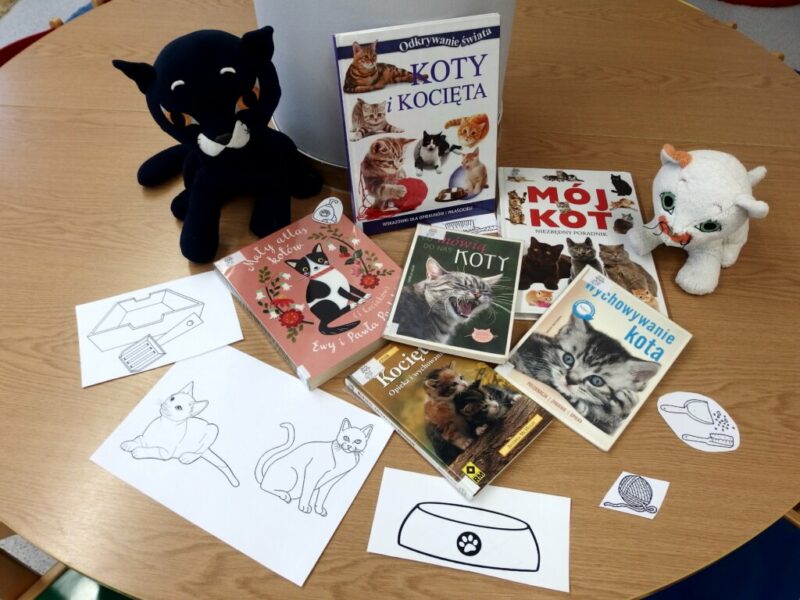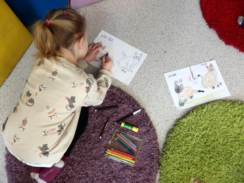 Po zapoznaniu się z tymi różnorodnymi materiałami i zaprezentowaniu reszcie grupy najciekawszych fragmentów z książek, przyszedł czas na pracę indywidualną. Dla utrwalenia wiadomości pobawiliśmy się w kocich opiekunów – dostaliśmy pod opiekę dwa narysowane koty, które należało nazwać i pokolorować, a później wskazać kolejno jakie przedmioty będą potrzebne do pielęgnacji, karmienia i zabawy z pupilami, a później ładnie je ozdobić i przykleić. Przedszkolaki świetnie sobie poradziły, sami możecie to ocenić, oglądając dołączone zdjęcia.
