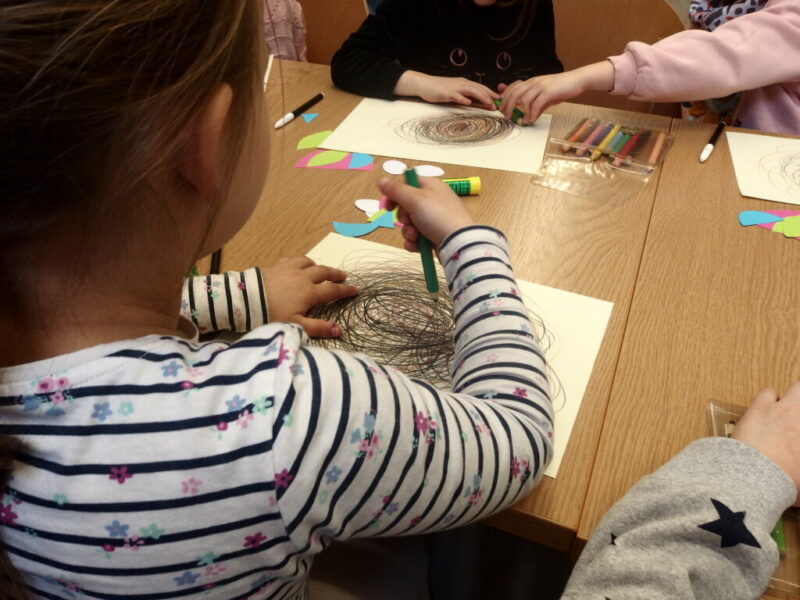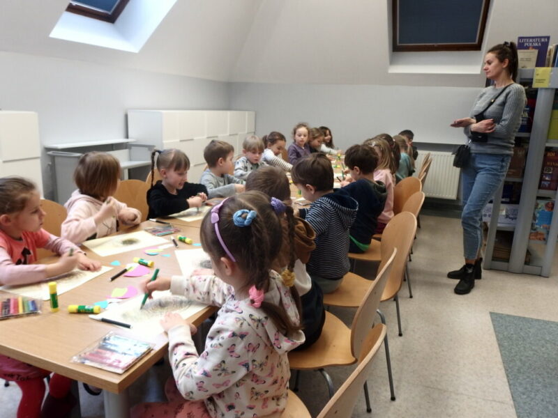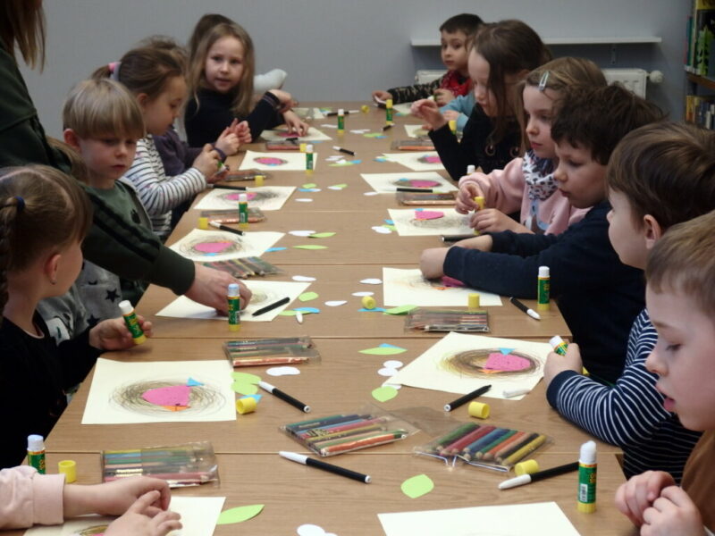 Na dzisiejszym spotkaniu dzieci z Miejskiego Przedszkola nr 2, poznały ilustrowane karty opowieści inspirowane japońską sztuką opowiadania historii kamishibai. Na przykładzie prostej i pięknej przypowieści o sile współpracy i współdziałania „Dwa Ptaszki”, przedszkolaki przekonały się, jak współdziałać i jak się nie poddawać, aby osiągnąć wspólne cele. Opowieść zainspirowała nas do rozmów o zmieniającej się przyrodzie i nadchodzącej wiośnie. Przedszkolaki wzięły udział w małym quizie pn. Co za ptak robi tak? i odgadywały po śpiewie ptaków ich nazwy. Na zakończenie wykonaliśmy wiosenną pracę plastyczną.