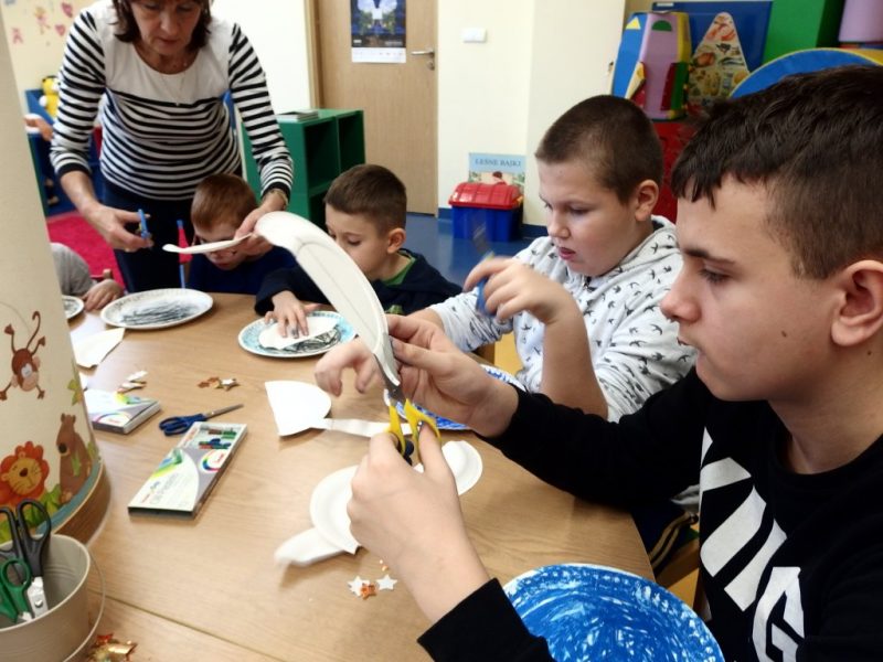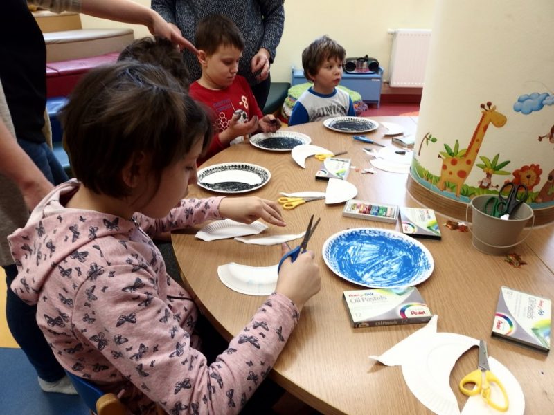 Dzieci ze Specjalnego Ośrodka Szkolno-Wychowawczego w Jeleniej Górze ćwiczyły swoje dłonie razem z Panami Palcami zaklętymi w obrazach teatru Kamishibai, a następnie wysłuchały pięknie ilustrowanej historii „Tato, zdobądź dla mnie księżyc”. Na papierowych tackach wyczarowały pastelami nocne niebo, księżyc i gwiazdy tworząc okienne zawieszki.