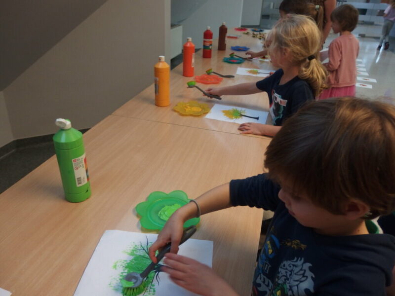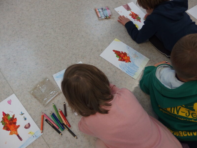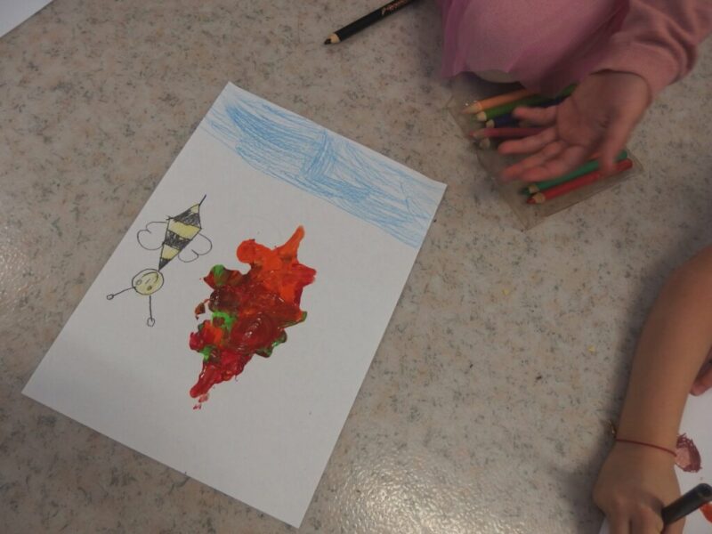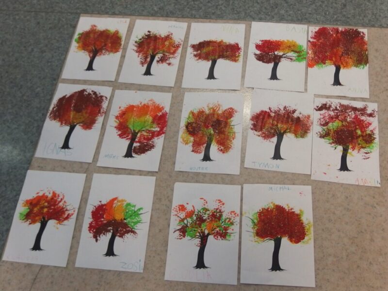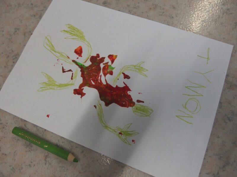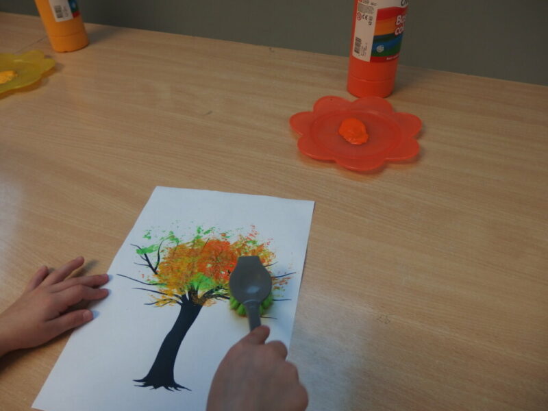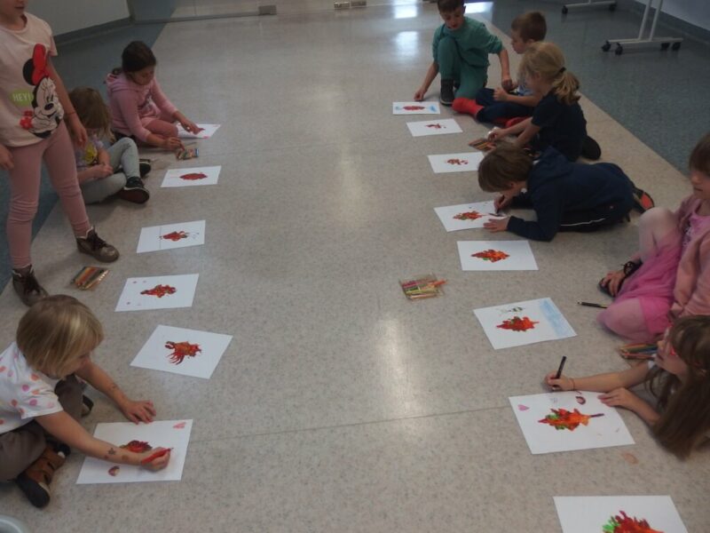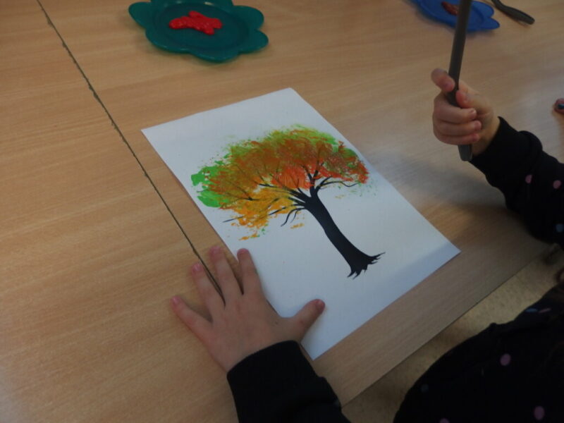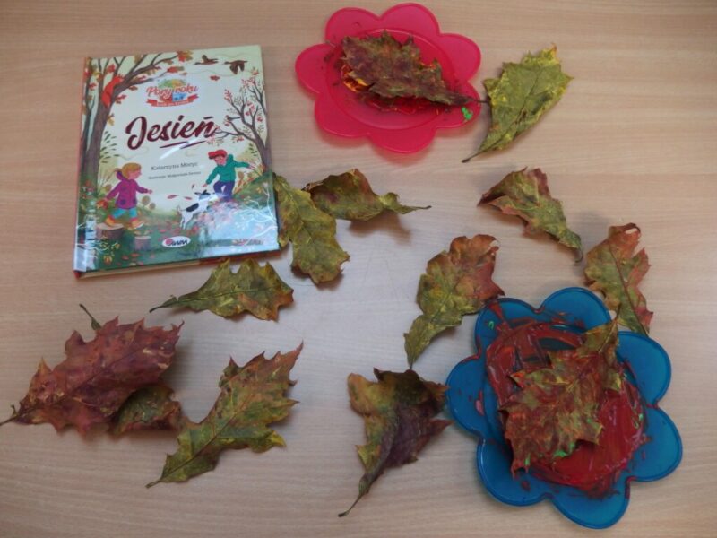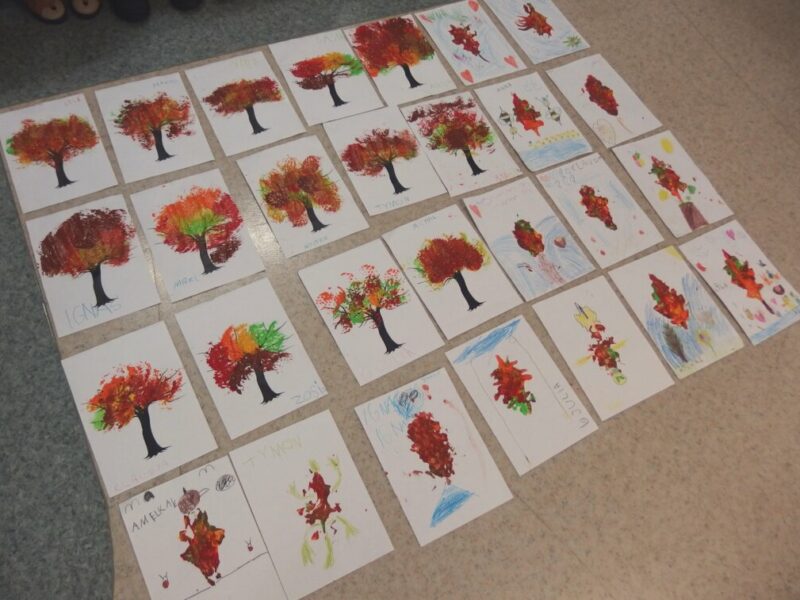 Gdy przyszedł czas na część artystyczną, musieliśmy się nieco ubrudzić. Udowodniliśmy, że do malowania pędzel wcale nie jest niezbędny, że równie dobrze można sobie poradzić szczotkami i jesiennymi liśćmi. Nasze drzewka oraz zmienione w zwierzątka lub drzewka kleksy prezentują się naprawdę nietypowo, zapraszam do oglądania!