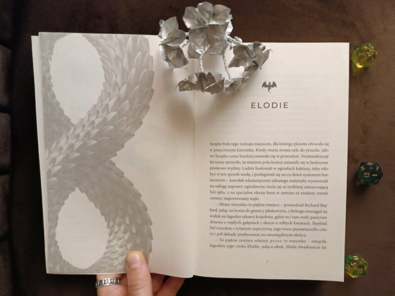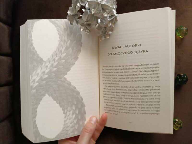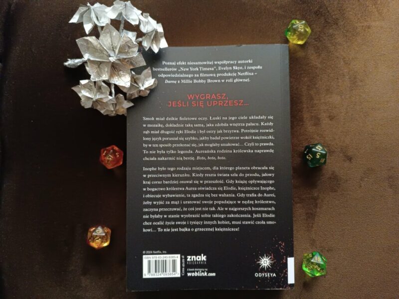 Powieść została napisana na podstawie scenariusza do filmu o tym samym tytule (autor Dan Mazeau), w której główną rolę odgrywa aktorka Millie Bobbie Brown. Stąd zdjęcie na okładce, które przedstawia jedną ze scen i prezentuje nam Elodie w bojowniczej pozie, z mieczem chwyconym oburącz i wojowniczą zaciętością na twarzy. Nie przypomina tam ona księżniczki, tylko raczej żeńską wersję Conana Barbarzyńcy. Ta sylwetka umieszczona jest również na brzegu okładki, dzięki czemu tom nawet ustawiony na regale między innymi książkami przyciąga uwagę. Tym, co doceniam w tym wydaniu, są również małe, uproszczone sylwetki smoków nad każdym kolejnym rozdziałem. W środku znajdziemy opis wydarzeń z kilku perspektyw (także retrospekcje sprzed ośmiuset lat), co oznaczone jest konkretnym imieniem w tytule rozdziału, główne skrzypce gra oczywiście Elodie.